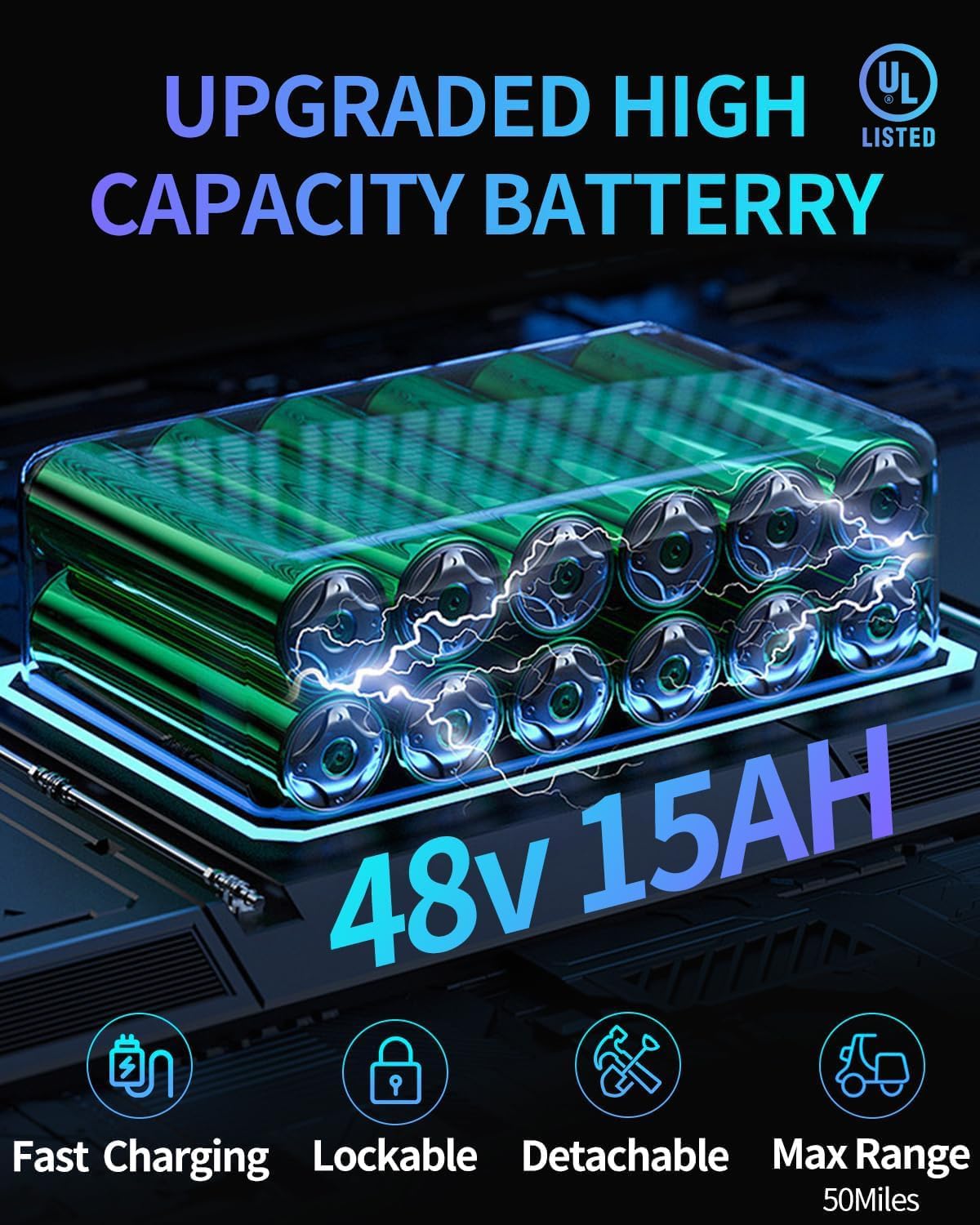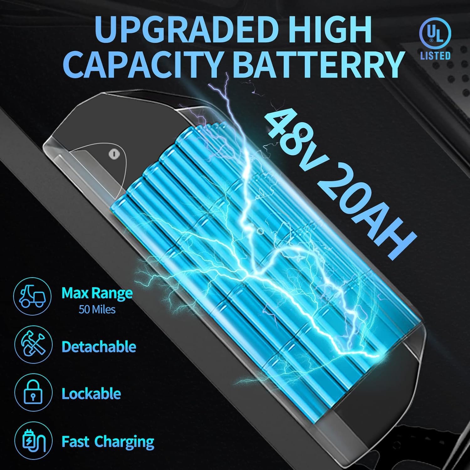 - [1000W high-speed motor & removable 48V 20Ah battery] This electric bike is a perfect choice for daily commutes & mountain adventures. The battery can be charged within 6-8 hours, & the bike can reach a top speed of 30 miles/hour, providing a thrilling ride experience. Upgrade to our electric motorcycle for adults & enjoy the convenience & excitement of this amazing ride|