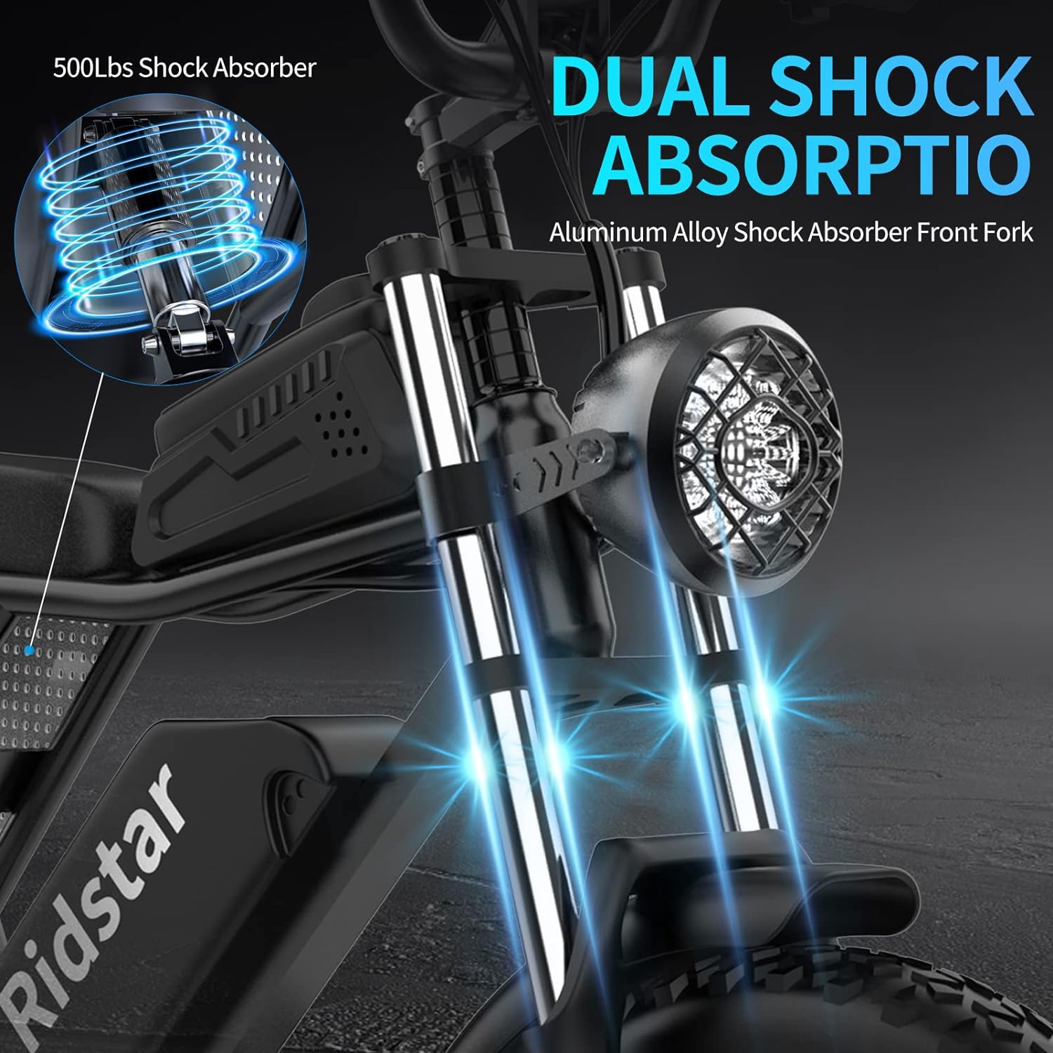 - [Shamano 7-Speed & F/R Shock Absorber] Our electric dirt bike for adults features a high-strength front suspension & rear suspension fork that effectively absorbs shocks & provides better control while riding. The Shamano 7-gear shifting allows for reliable precision & comfortable ride control.