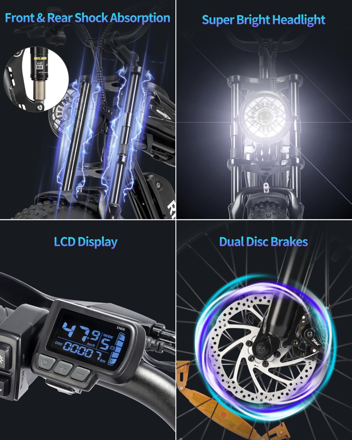 - [Fat Tires & Dual Hydraulic Disc Brakes] With its puncture-resistant 20/''x4/'' fat tires, this ebike provides a stable grip on any terrain, including s, beaches, & rough mountain roads. The dual oil disc brakes offer greater stopping power & precise, instant braking, even in wet weather, ensuring your safety at all times.