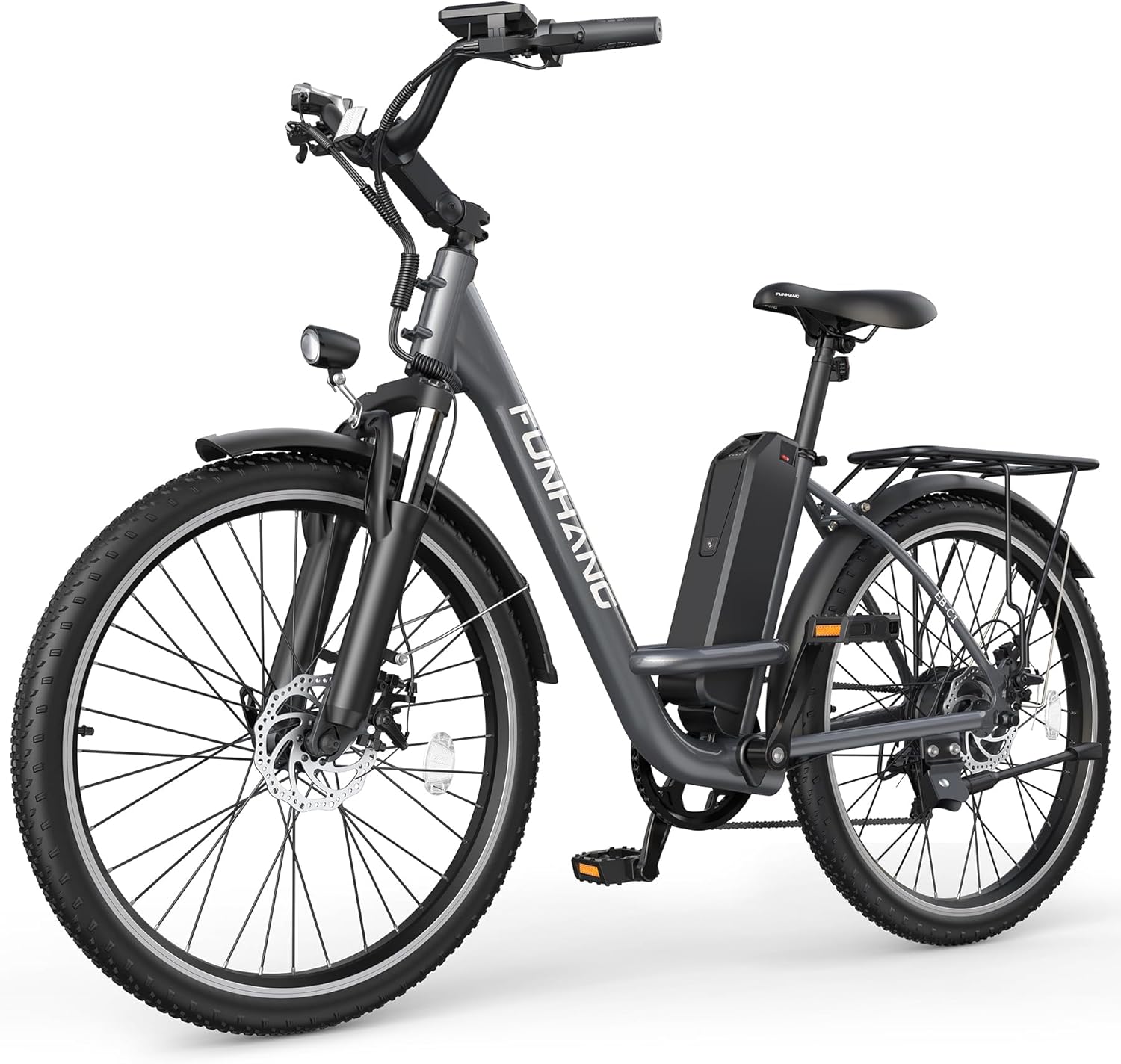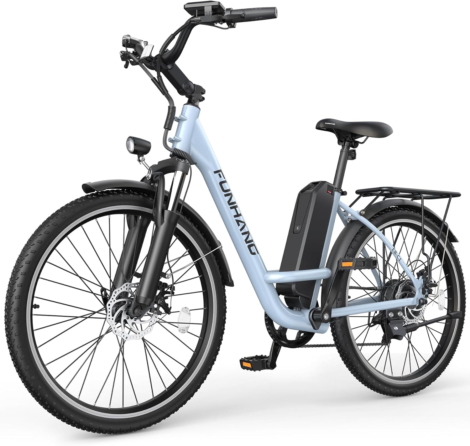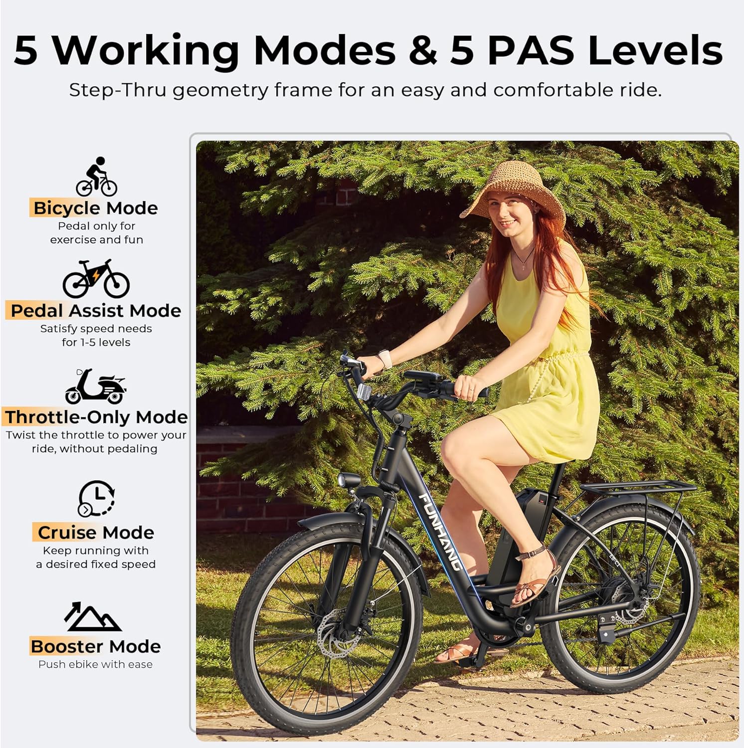 - 1000W PEAK BRUSHLESS MOTOR: Funhang EB-C1 electric bike for adults adopts a high-speed brushless 500W motor (PEAK 1000W), delivering a top speed of 21.7MPH and 55N.m maximum torque. Whether you're tackling hills or cruising on flat terrain, this city cruiser ebike handles all effortlessly with ample power and impressive performance. It's fun to ride around the neighborhood, town, park trails, city streets, campus, beaches and campgrounds.
