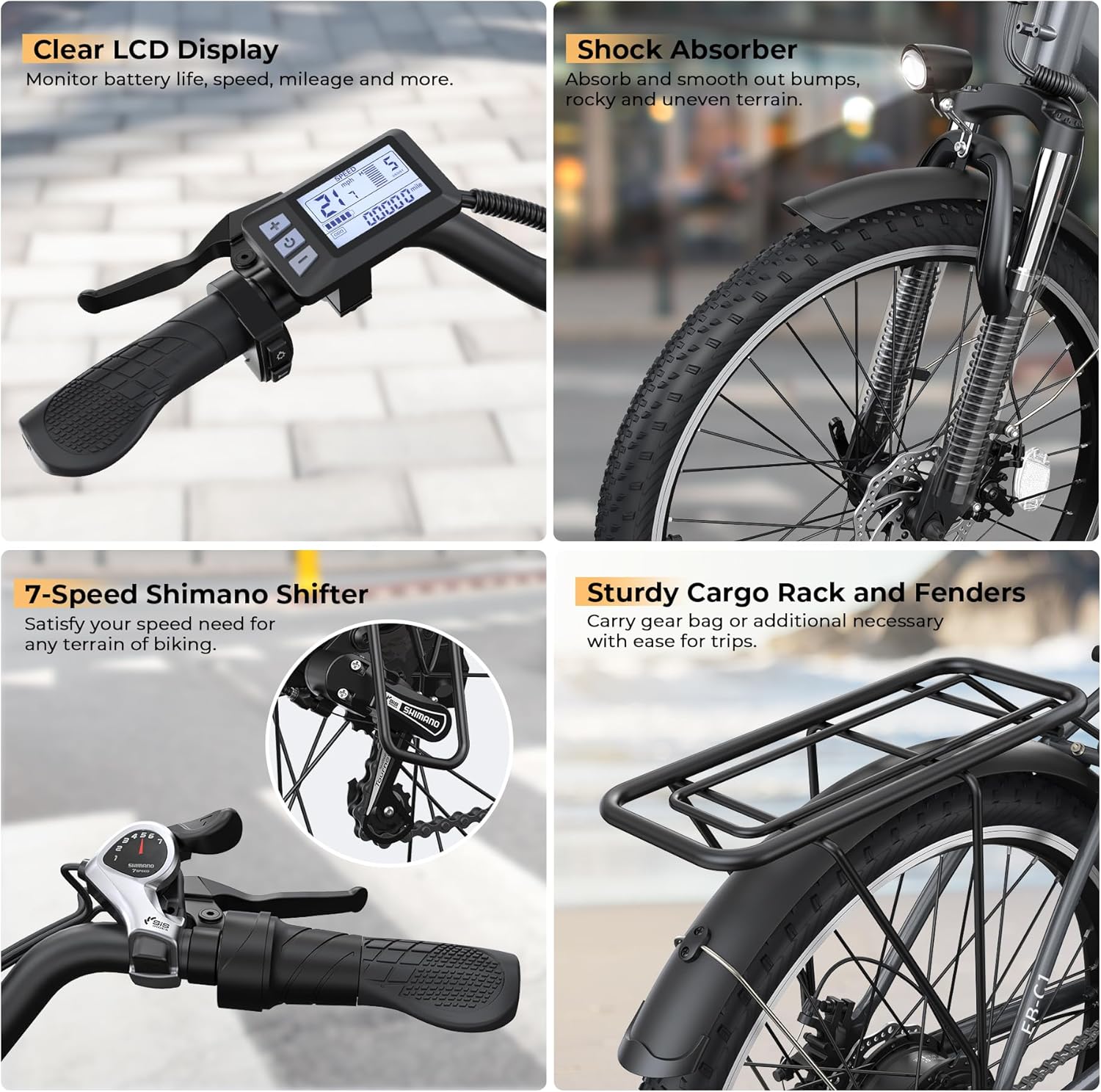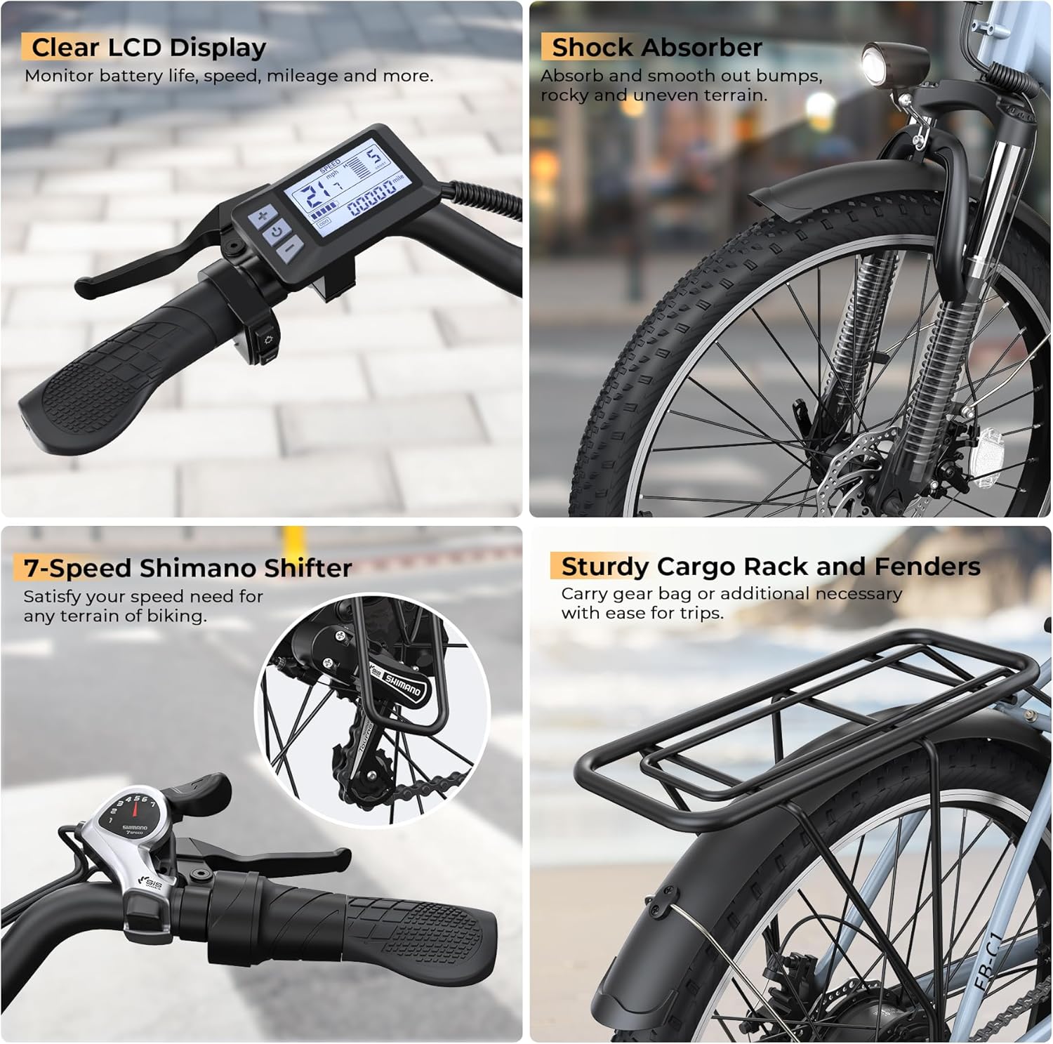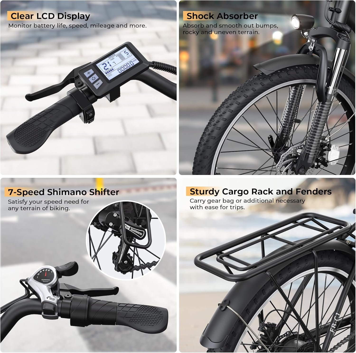 - RELIABLE SAFETY CONFIGURATION: The smart LCD display on the ebike clearly shows the battery, speed, PAS level, distance and more riding data. Professional 7-speed gear shifting will satisfy all your speed needs for uphill, downhill, acceleration, deceleration, and steady speed. Both front suspension fork and 160mm dual disc brakes make for a smooth and comfortable ride even on rough terrains. Other reliable elements like LED headlight, electric horns and reflectors keep you safe while riding.
