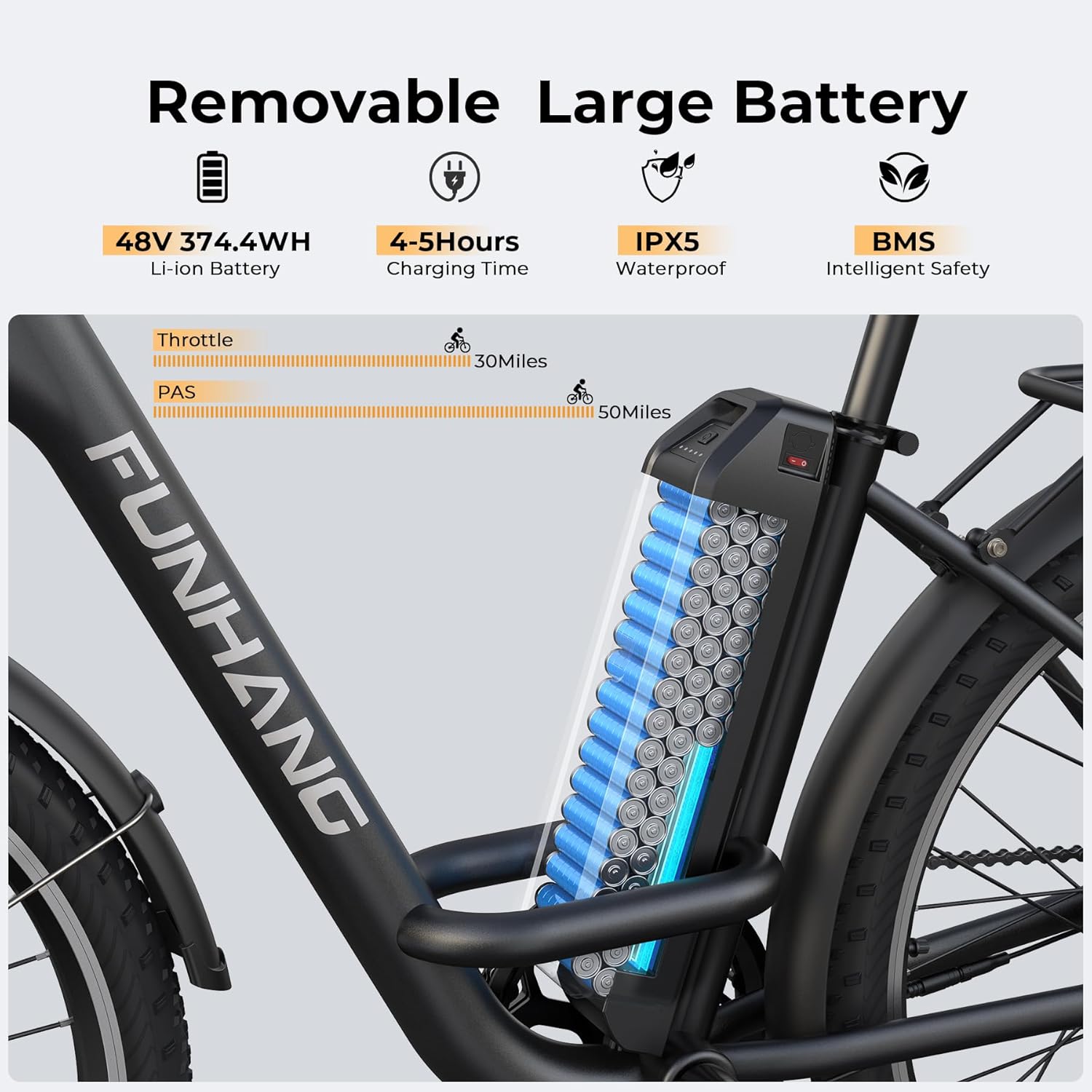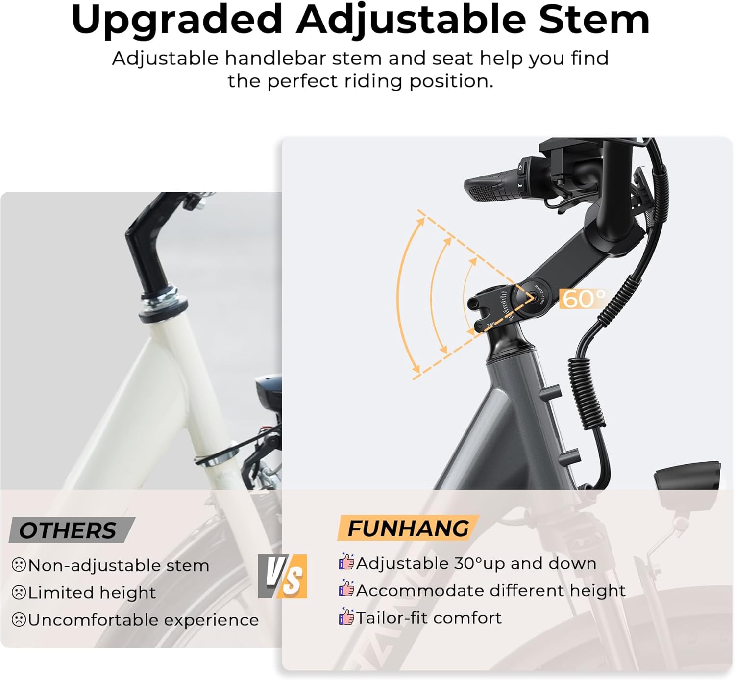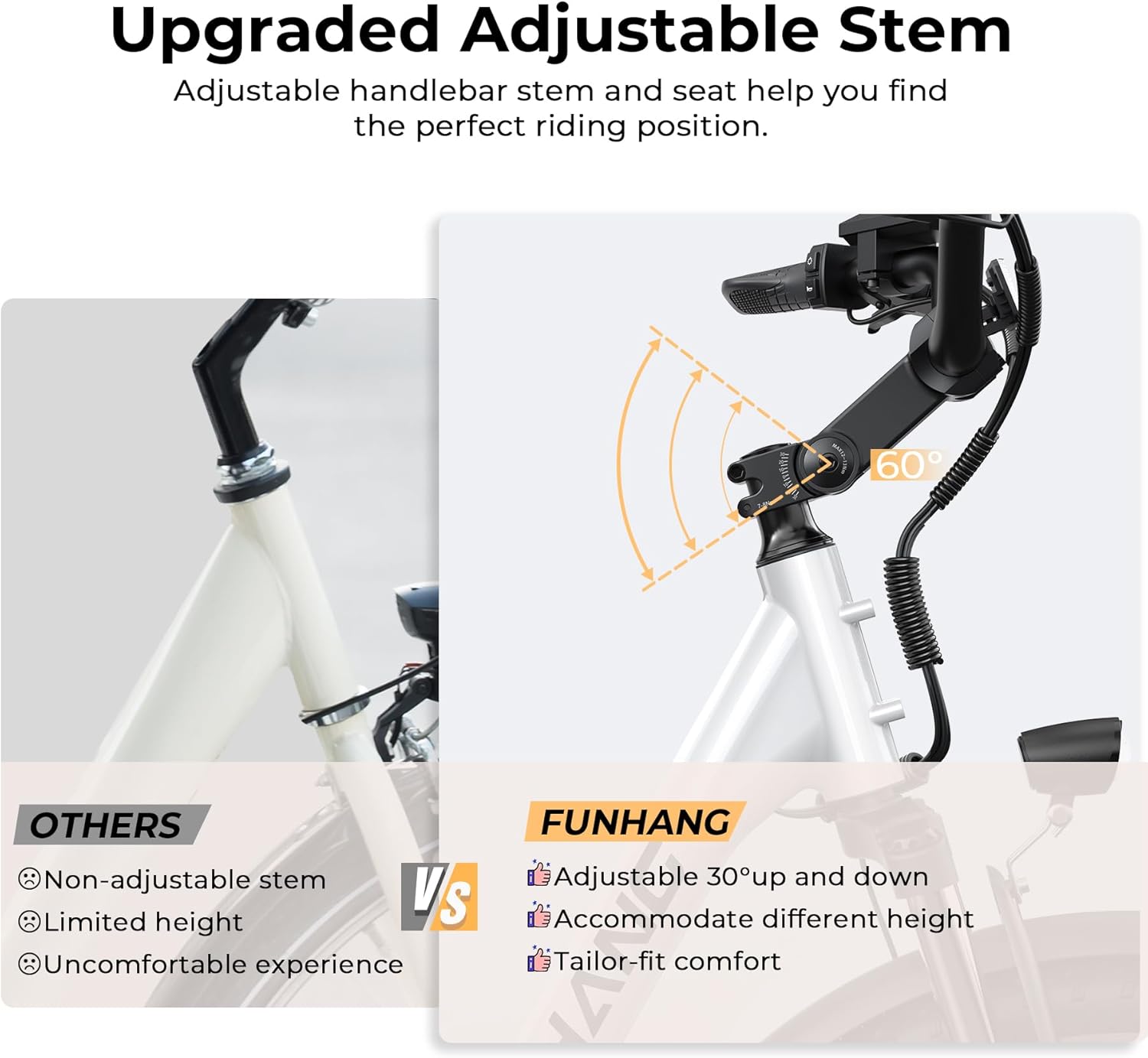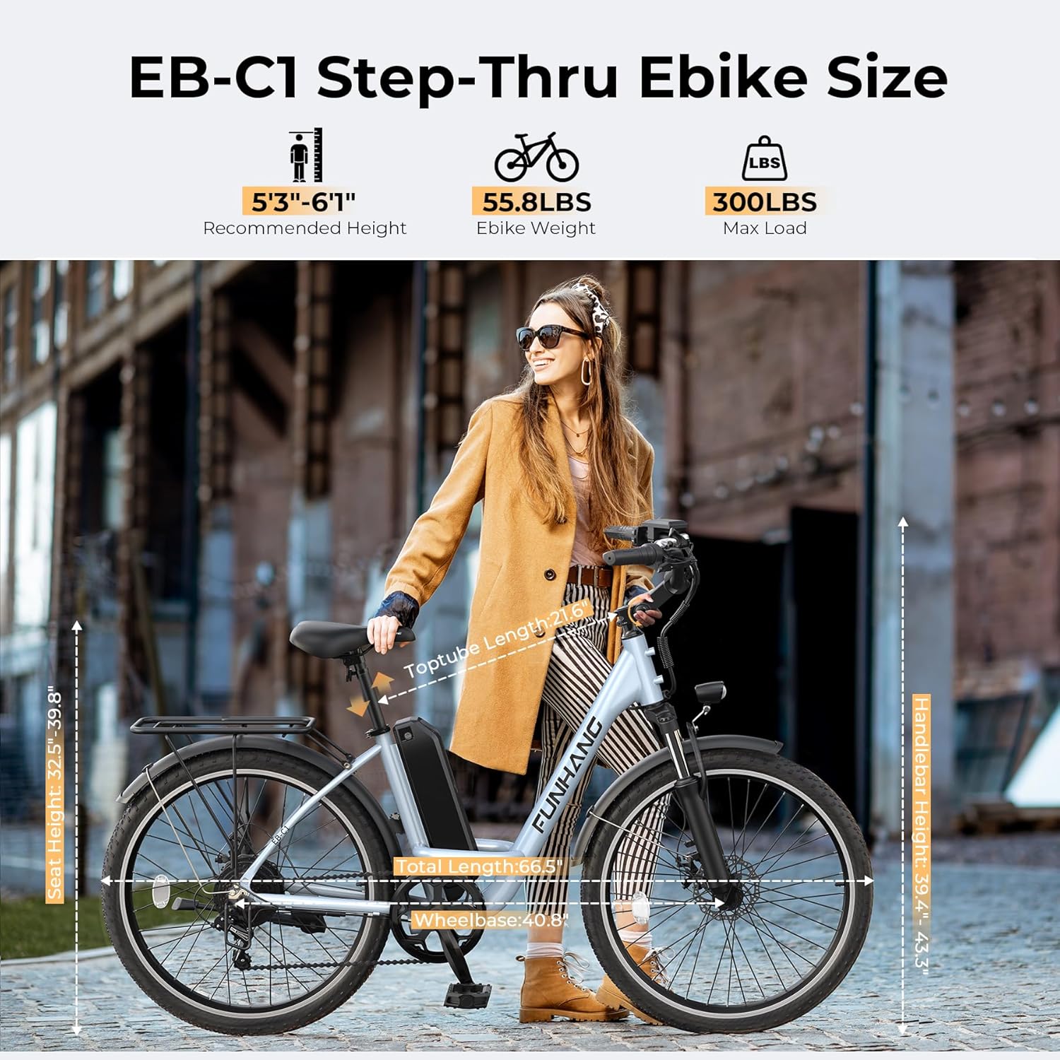 - EASY INSTALLATION AND CUSTOMER SERVICES: The e bike for adults comes with a 12-month warranty and is 85% pre-assembled with instructions and tools. You can follow the step-by-step assembly video on our page or the user manual to complete the rest. The step-through ebike weight 55.8 lbs, max load 300 lbs/135kg, recommended height 5'3'-6'1'. For any inquiries or support about Funhang adult electric bicycle, Please feel free to contact us. We will get back to you soon on business day.