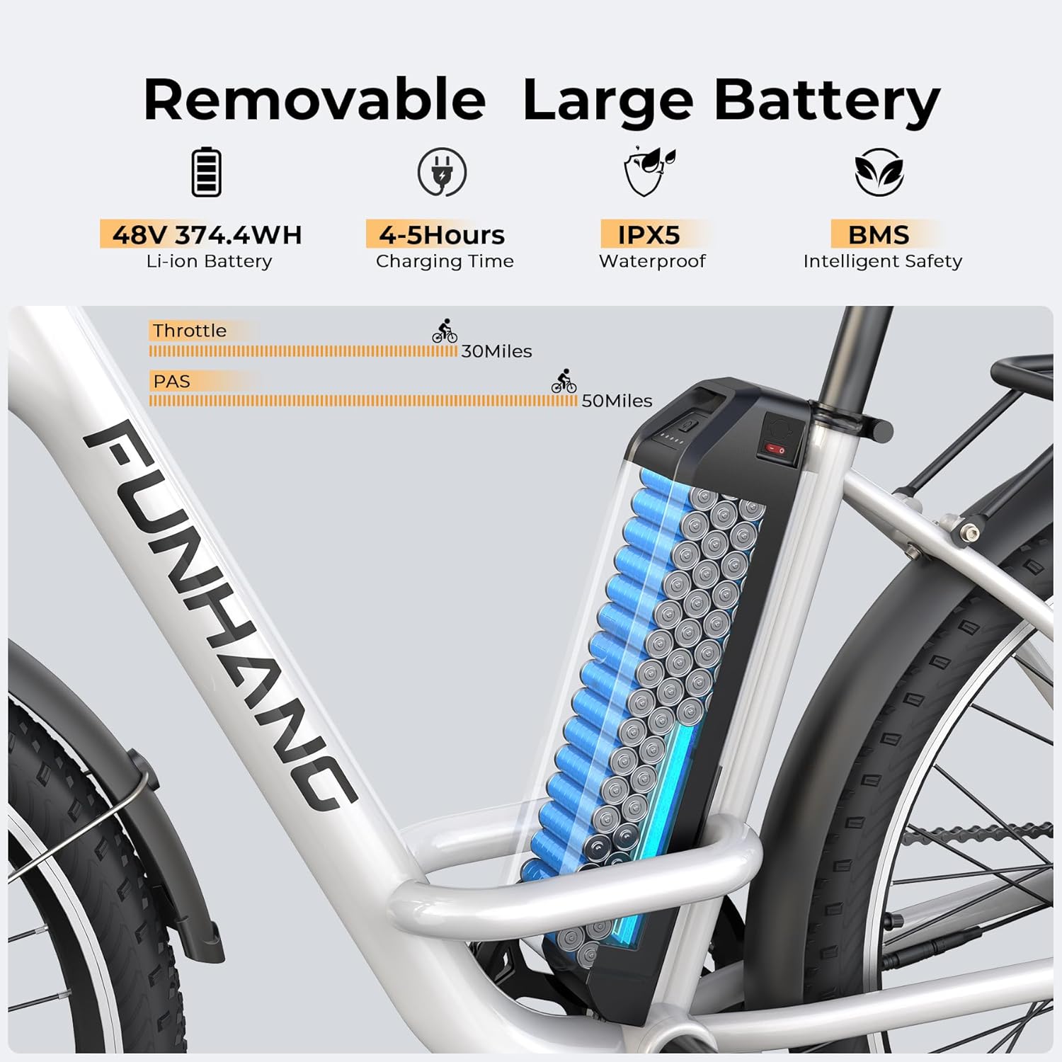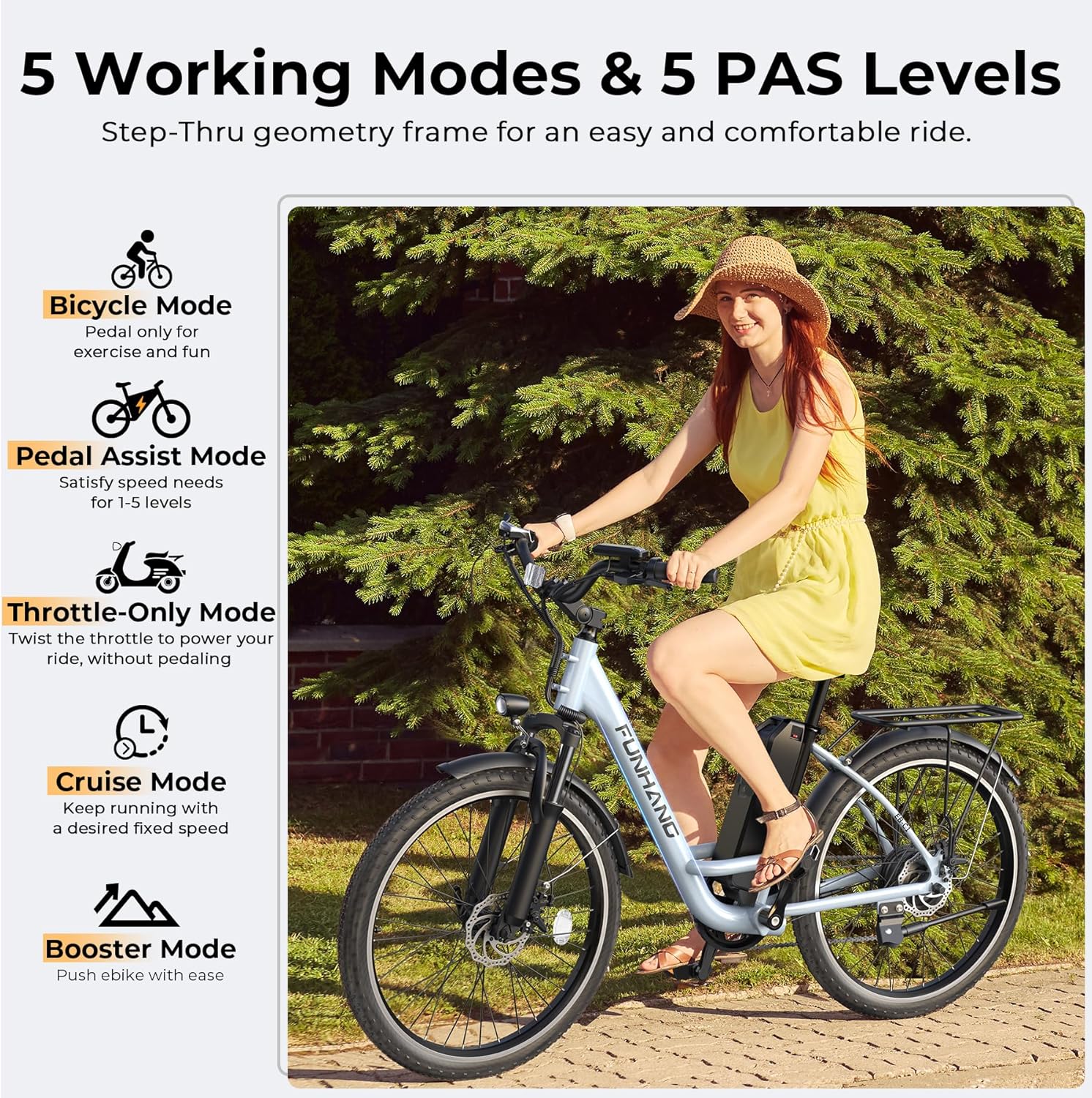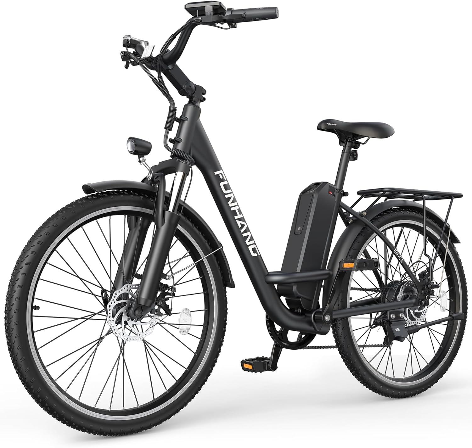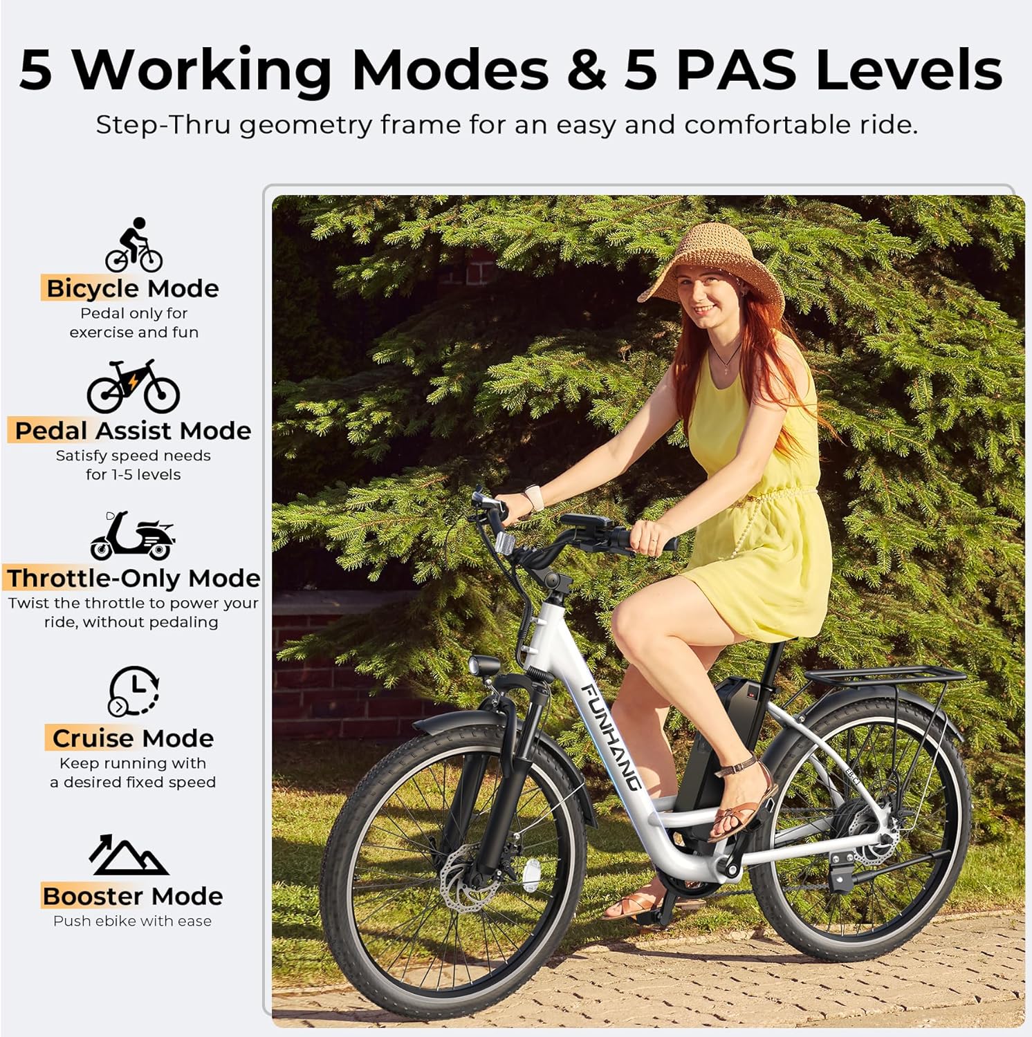- EASY INSTALLATION AND CUSTOMER SERVICES: The e bike for adults comes with a 12-month warranty and is 85% pre-assembled with instructions and tools. You can follow the step-by-step assembly video on our page or the user manual to complete the rest. The step-through ebike weight 55.8 lbs, max load 300 lbs/135kg, recommended height 5'3'-6'1'. For any inquiries or support about Funhang adult electric bicycle, Please feel free to contact us. We will get back to you soon on business day.