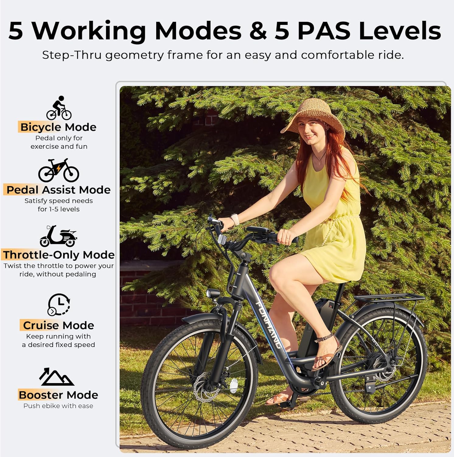 - 5 WORKING MODES: Throttle Mode: twist throttle to power your ride. PAS Mode: the motor will assist you with a moderate amount of power as you pedal the bike, kick in 1-5 levels of pedal assist to suit your needs. Booster Mode: ebike will travel at 4.2mph, easy to push uphills. Cruise Mode: hold the throttle until the speed exceeds 6.2mph, then long press the _-_ button till the 'P' icon flashes on the screen to enter cruise control. Pedal Mode: pedal as a regular bike for daily exercise.