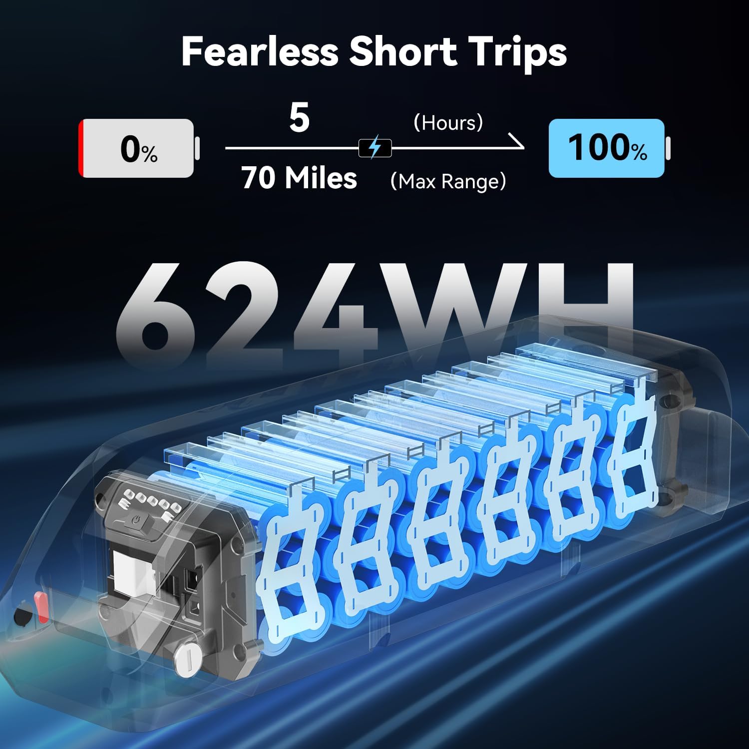 - __emovable Large Capacity Battery to Limitless Exploration__he fat tire electric bike comes with 48V 13Ah battery, IPX6 waterproof, quickly removable and easy to carry. Two charging ways, _ removing the battery to charge. _ direct charging on the bike. Easy to charge your e-bike at home or at work. With a fast charging adapter, this pedal assist electric bike offers up to 70 miles of travel (PAS mode) on a single charge (4 hours). Long-distance commuting is no longer a challenge.