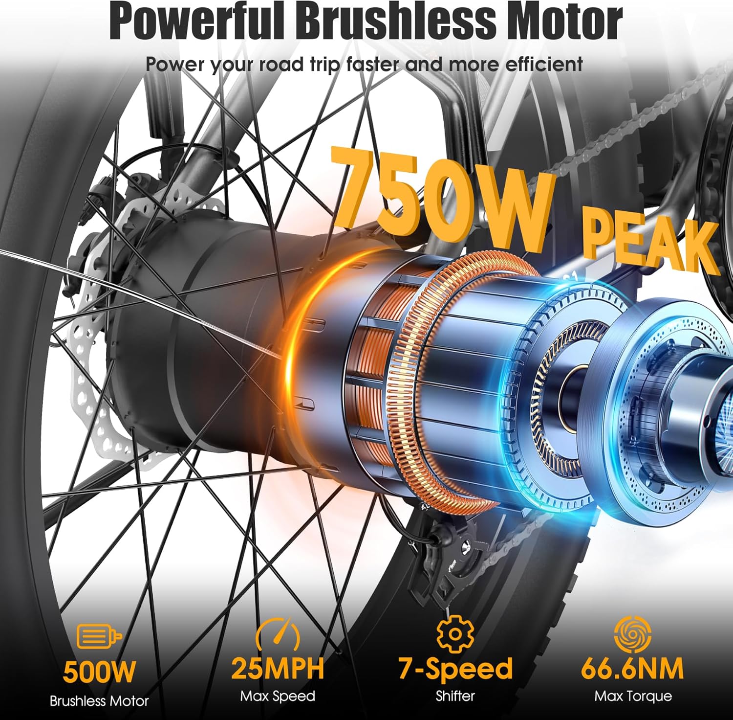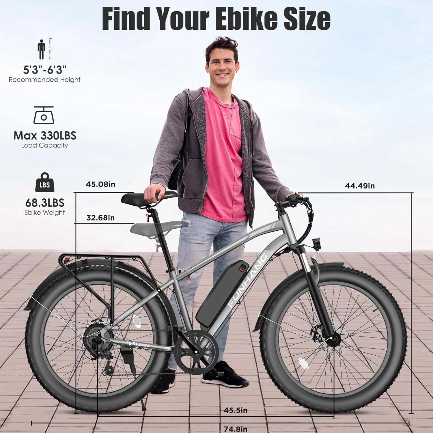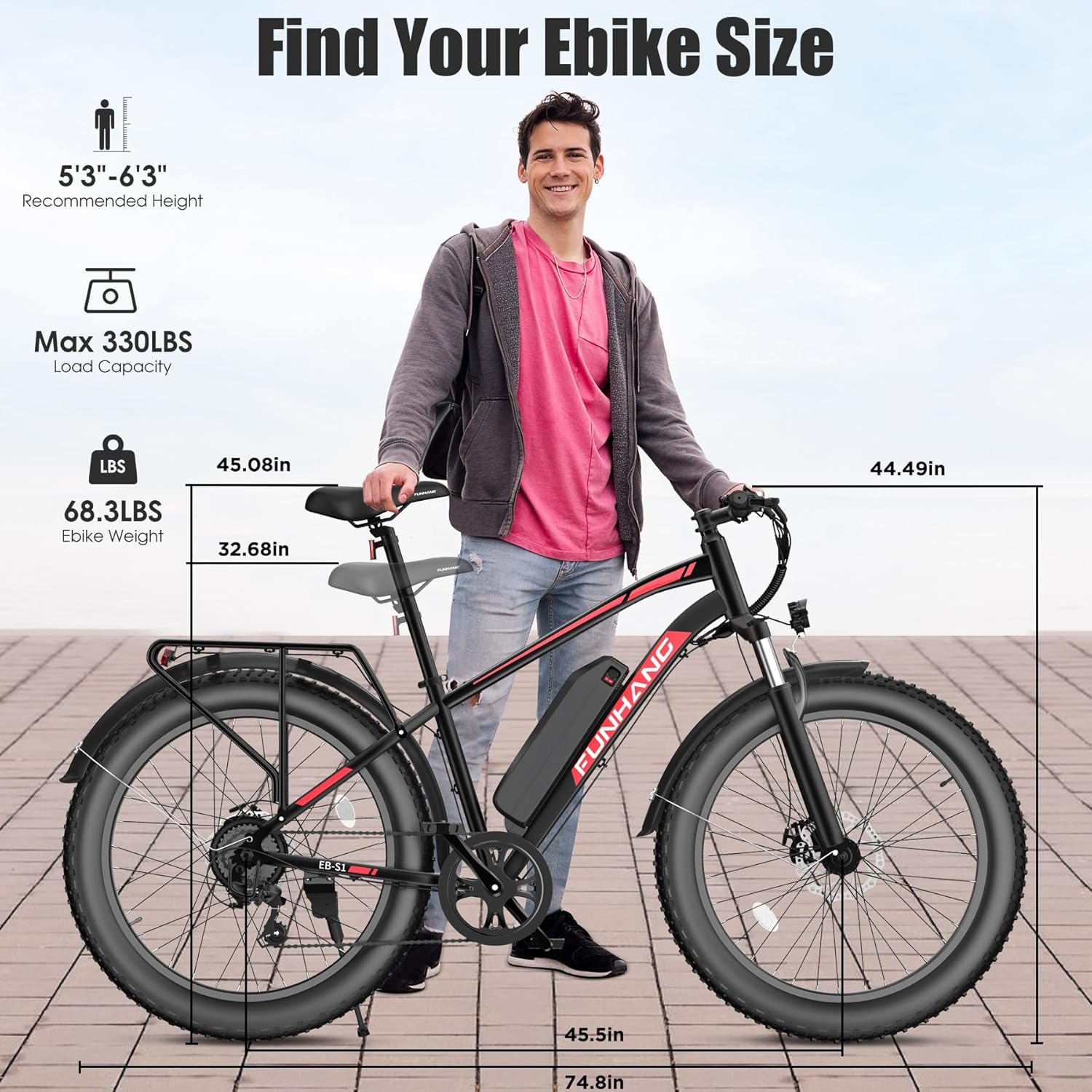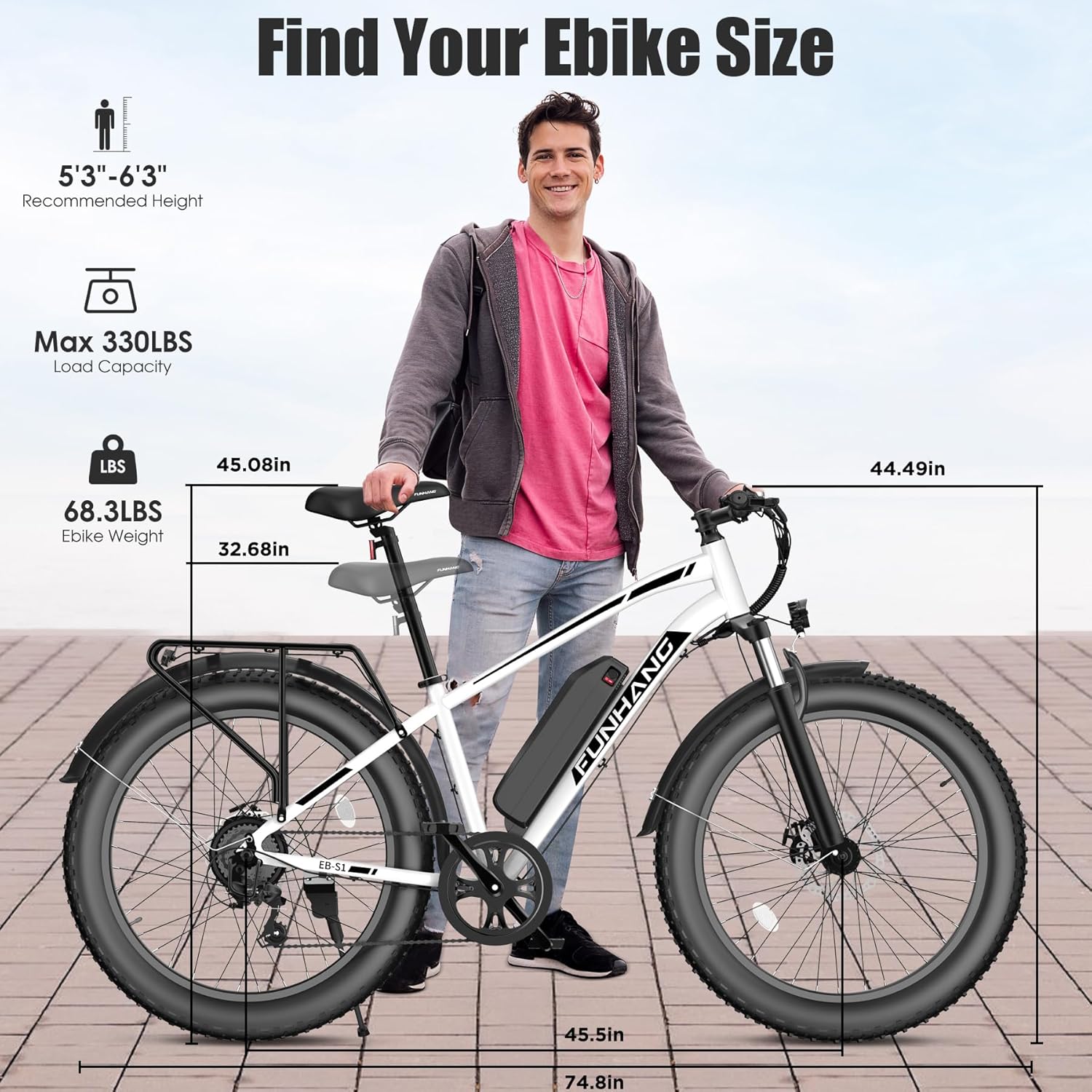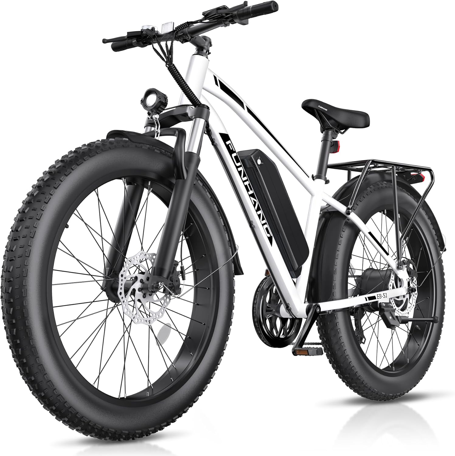 - 1000W PEAK BRUSHLESS MOTOR: Funhang EB-S1 fat tire electric bike for adults adopts a high-speed brushless 500W motor (PEAK 1000W), boosted a top speed of 21.7MPH�_p to around 25MPH by unlocking the speedlimiter operation). Its ample power allows you to climb hills/inclines and conquer off-road challenges effortlessly.