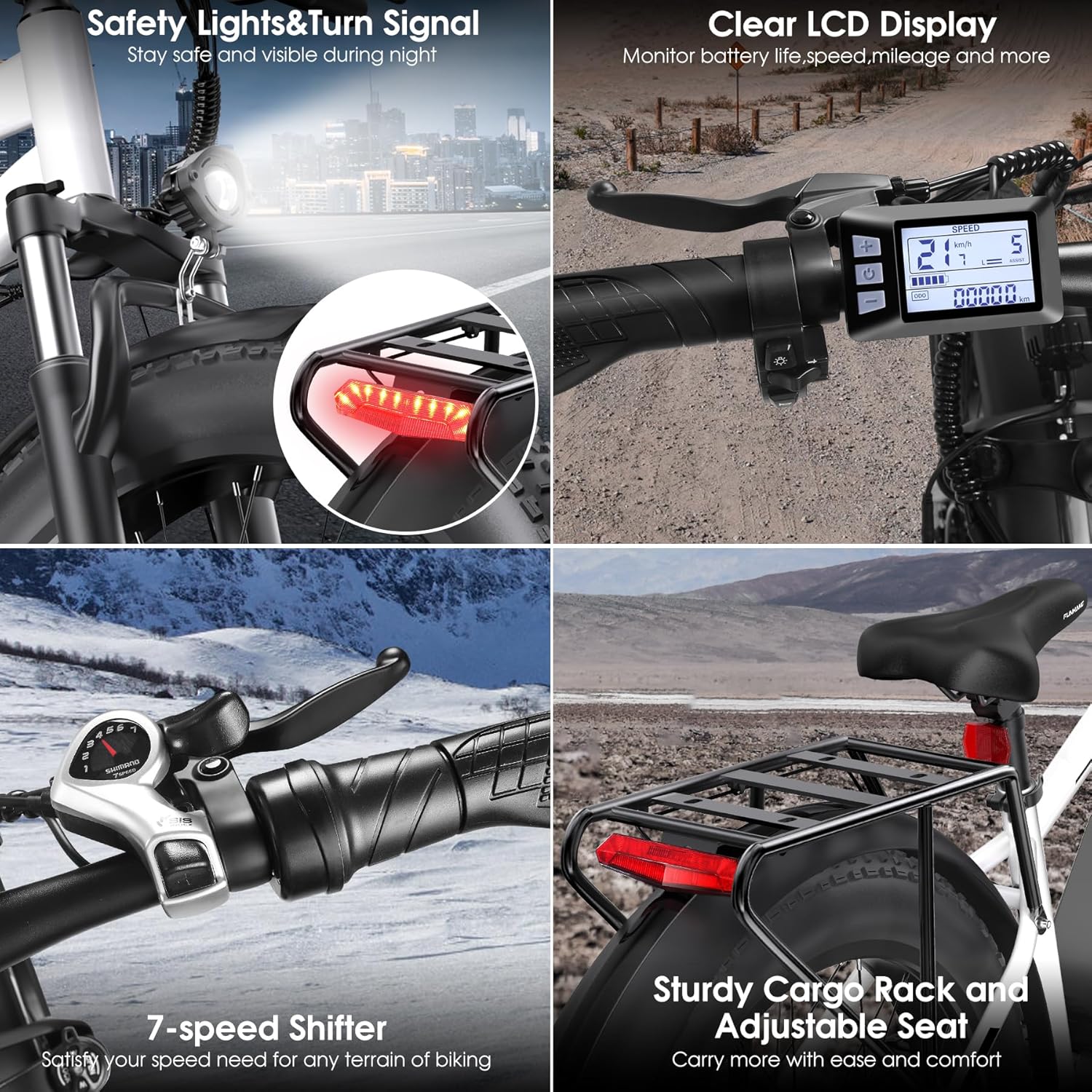 - RELIABLE SAFETY SYSTEM: 26' electric mountain bike adopts a lockable suspension fork and 180mm dual disc brakes, providing a smooth and comfortable ride even on rough terrains. The upgraded headlight and taillight make you visible and safer during night or dark environments. The unique turn signal alerts people nearby that you are going to make a turn. The adjustable seat promises a confident ride on the road. All reliable elements offer you a smoother and safer riding experience.