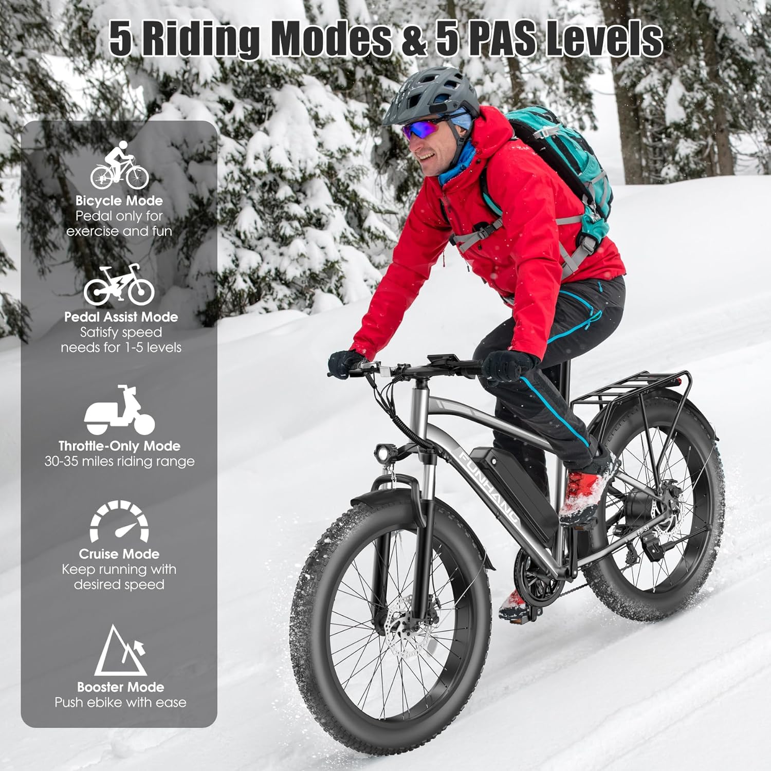 - 5 RIDING MODES AND 7-SPEED GEARS: 1. Throttle Mode: Twist the throttle to power your ride without pedaling.2. Pedal Assist Mode: Kick in 1-5 PAS levels to extend your distance.3. Booster Mode: allows ebike to travel at 3.73 miles/h, easy to push uphills.4. Cruise mode: maintain the speed you want.5. Normal Bike: Pedal for daily exercise. Combined with 7-speed shifting gears, it's fun to customize your ride around the neighborhood, park, city streets, mountains and sandy beaches.