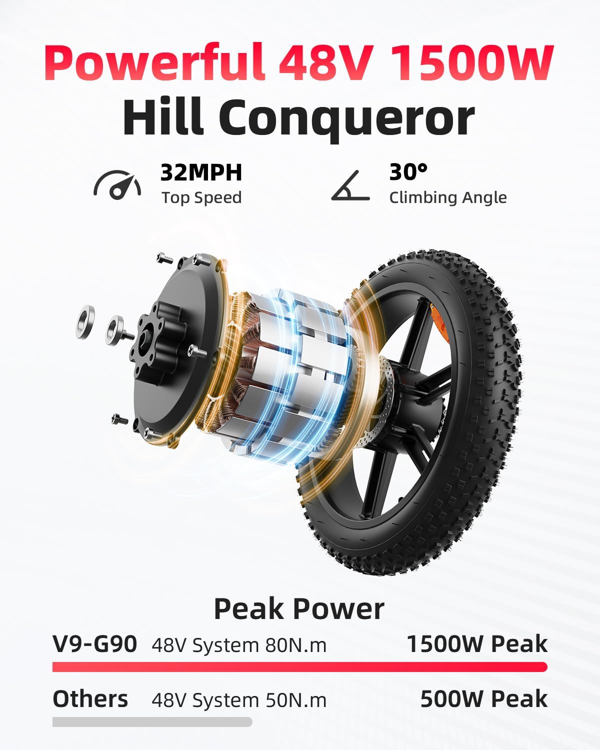 - __eak 1500W Brushless Motor_ Experience the exhilaration of our electric bike designed for adults, featuring a robust 1000W motor with a peak output of 1500W. Feel the wind in your hair as you effortlessly reach speeds up to 32MPH, making every ride an adventure of adrenaline and freedom.