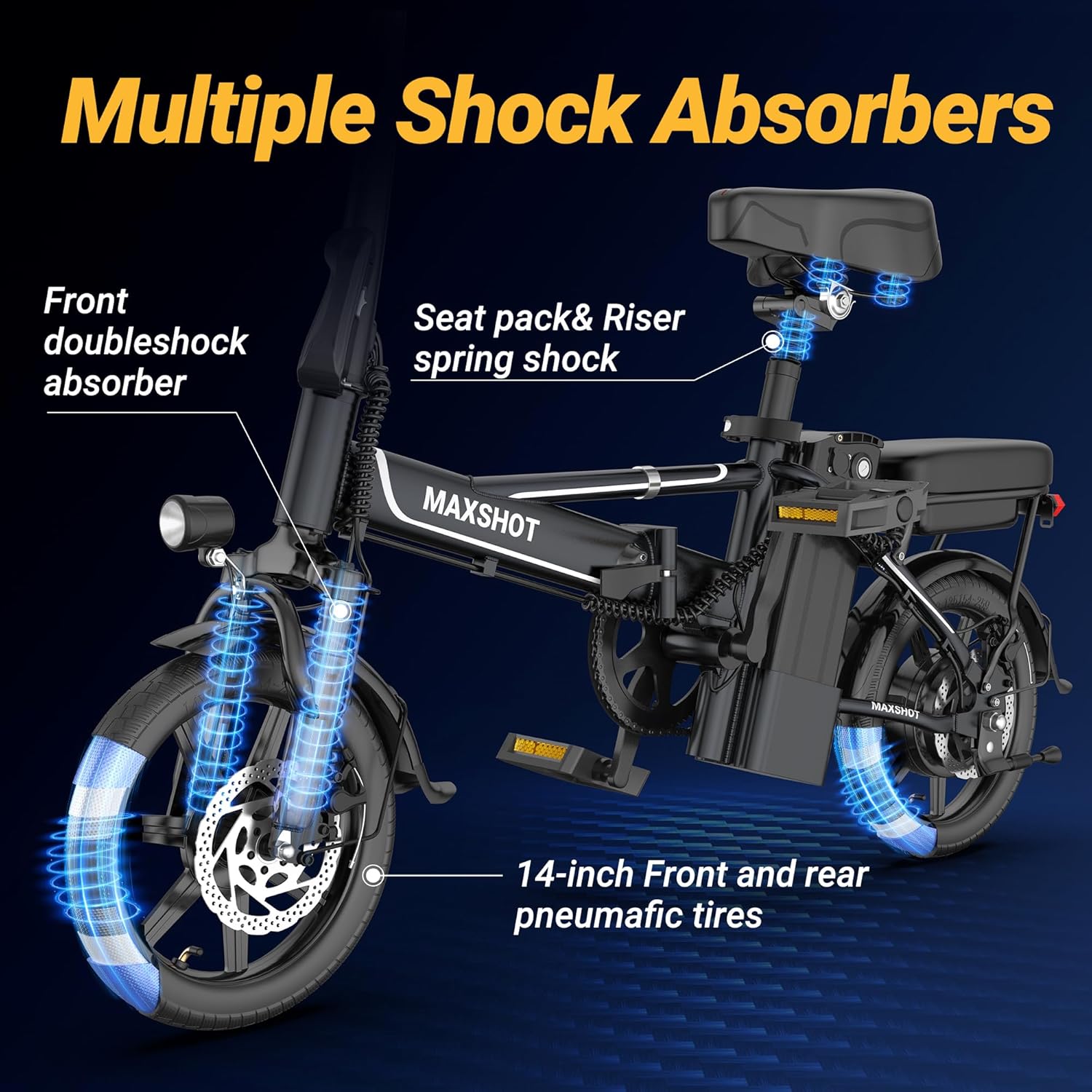 - __Safe & Secure: Ride with confidence thanks to the F1 bike dual braking system (front and rear disc brakes plus electronic brake). The bright lighting system (adjustable headlight, responsive taillight, and turn signals) ensures visibility in low-light conditions, while the 14-inch pneumatic tires and dual suspension system provide comfort and stability on any terrain.