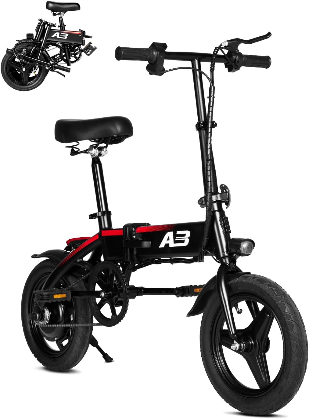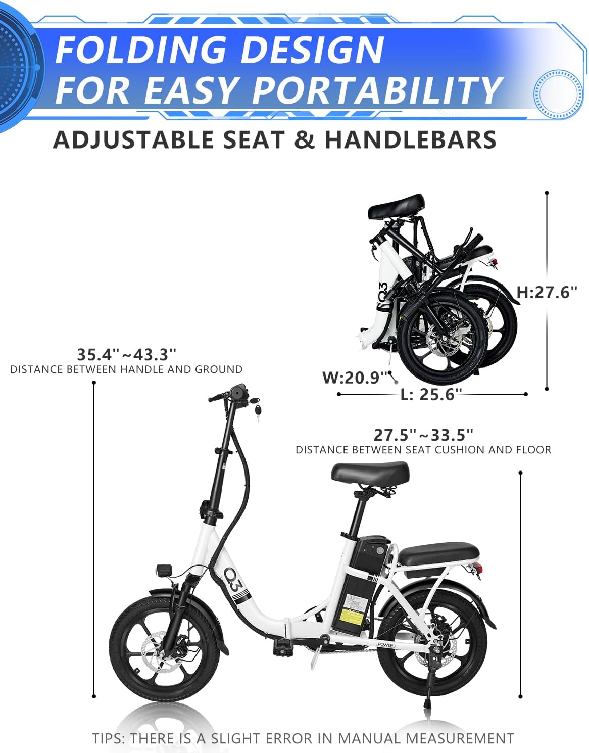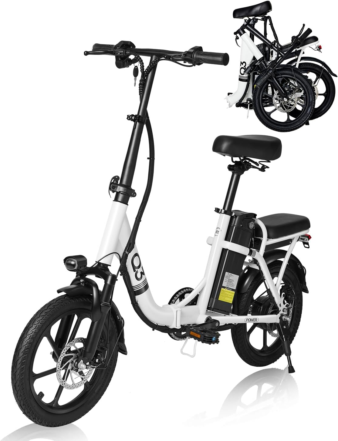 - __njoy Portability & Fun__PYEAR electric bike is made of a high-carbon steel frame with a high-density foam seat to provide ultimate comfort. The folded size is 28x19x23 inches, the actual measurement is slightly off. The folding design is portable and can easily fit into the trunk of your car, suitable for city commuting and traveling, providing convenience and fun for teenage students, commuters, retirees as well as newbies of both genders.