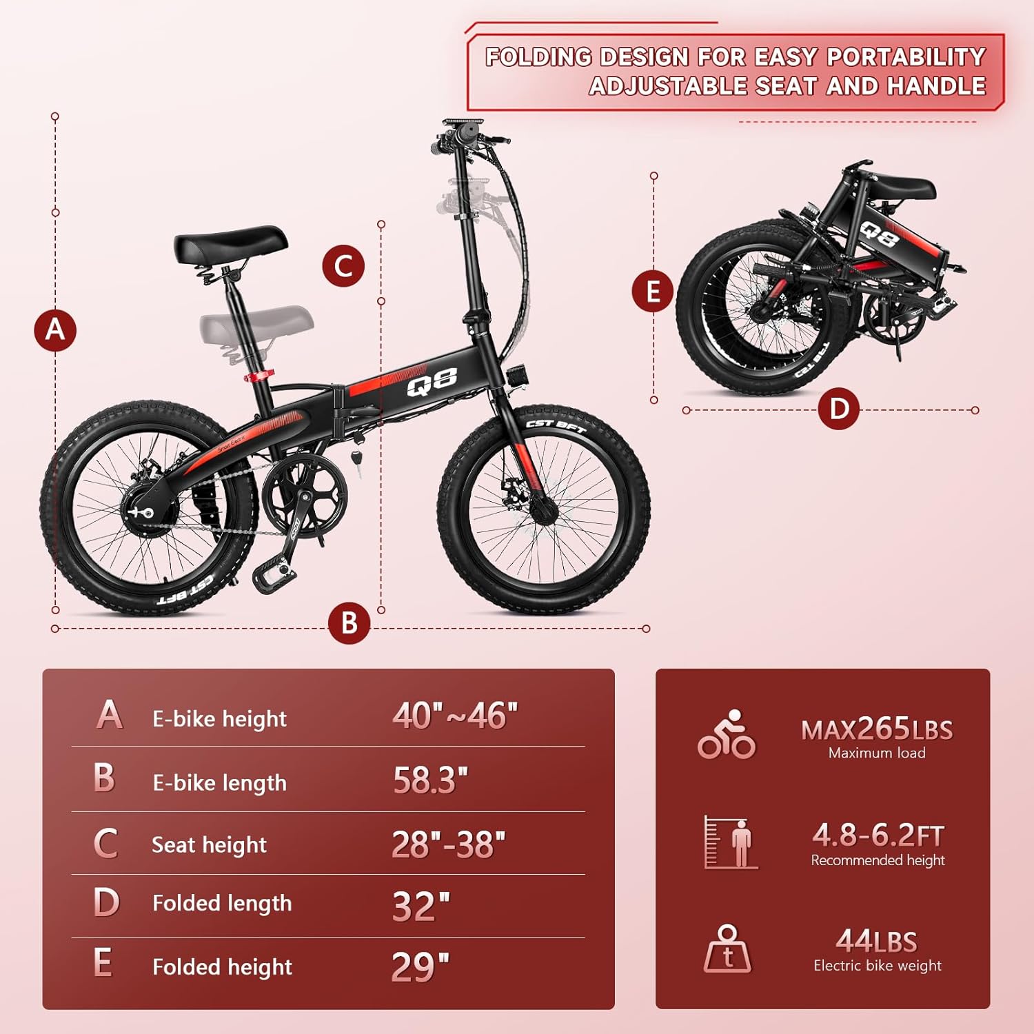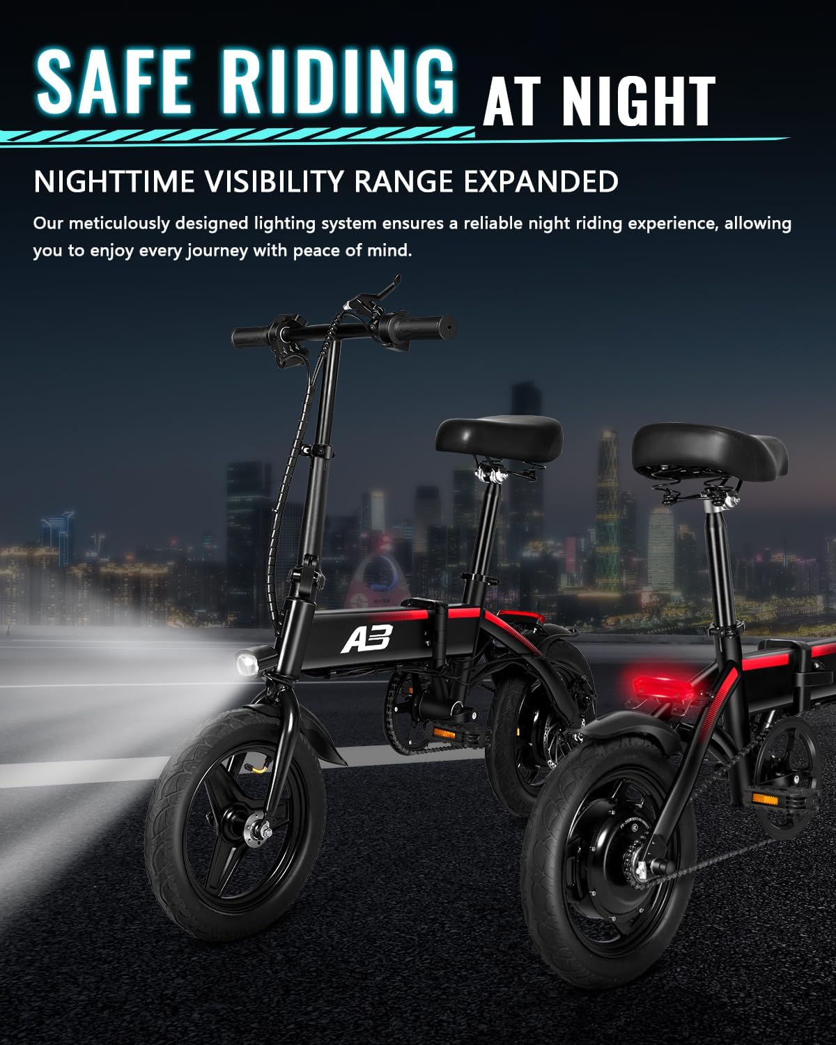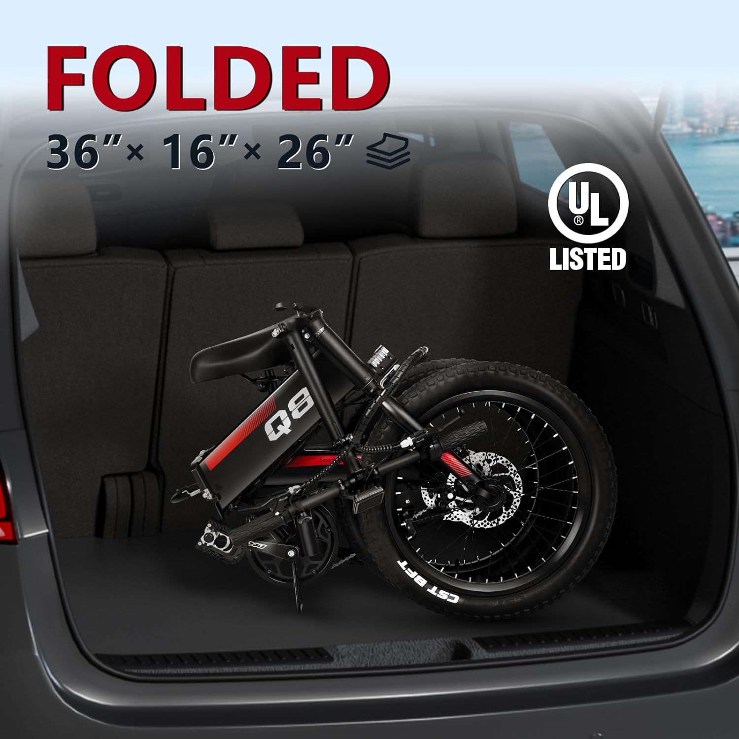- __njoy Portability & Fun__PYEAR electric bike is made of a high-carbon steel frame with a high-density foam seat to provide ultimate comfort. The folded size is 28x19x23 inches, the actual measurement is slightly off. The folding design is portable and can easily fit into the trunk of your car, suitable for city commuting and traveling, providing convenience and fun for teenage students, commuters, retirees as well as newbies of both genders.