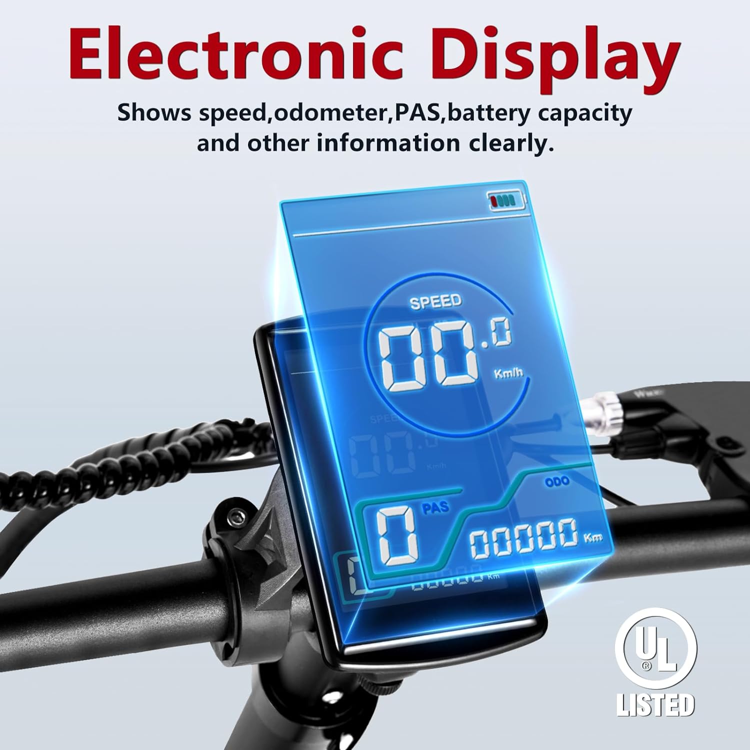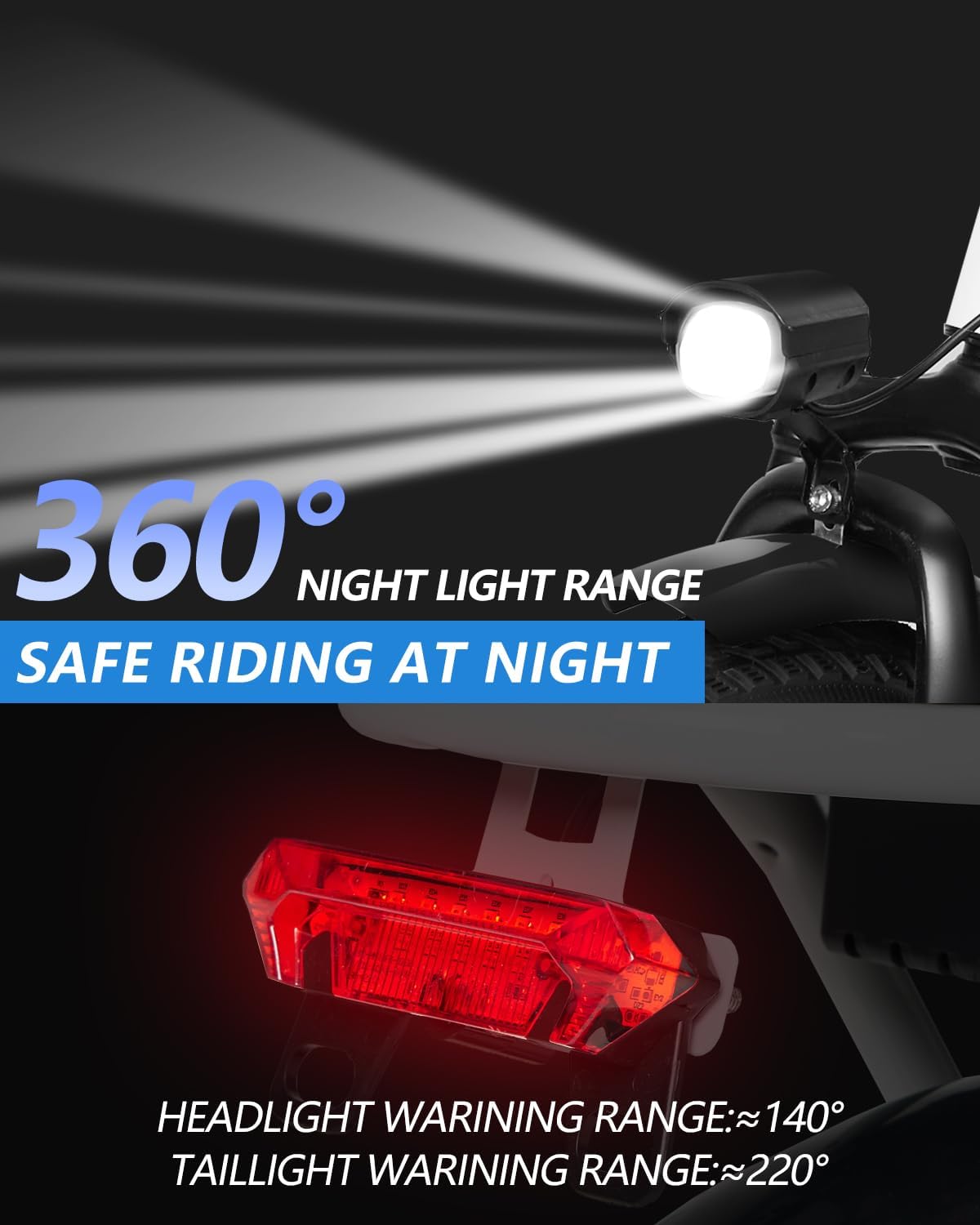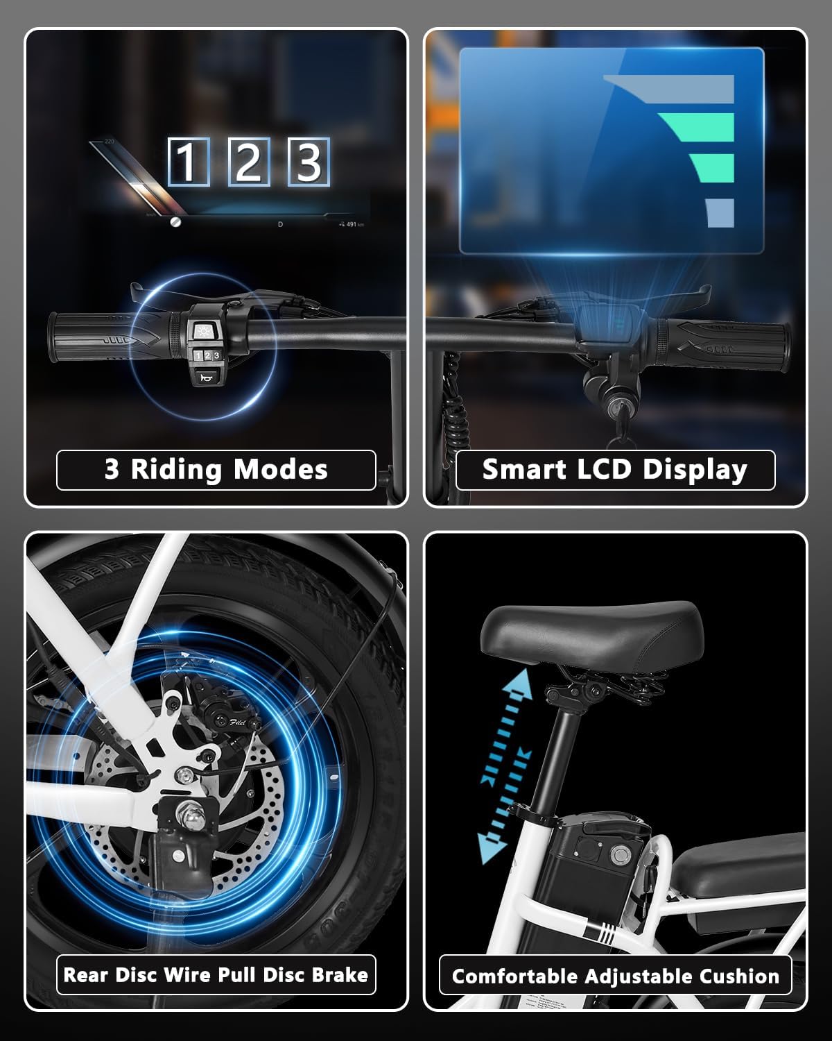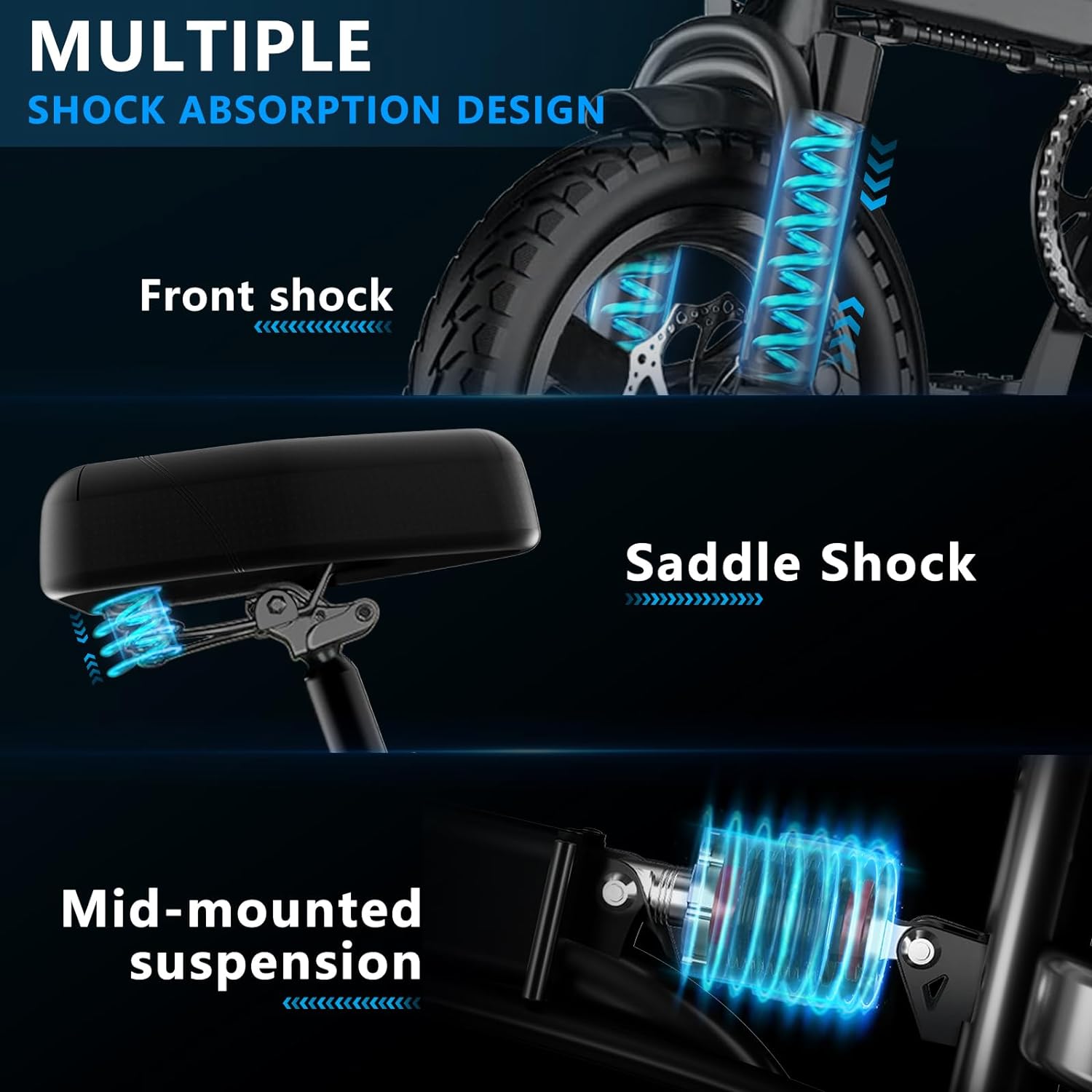- __afety & Comfort__he ebike has adjustable seat and handlebar heights and is equipped with the center, front fork, and seat suspension absorbers, providing a smooth and comfortable riding experience. Equipped with a disc brake system. The LED display shows the battery information, and the front and rear lights ensure safe riding at night.