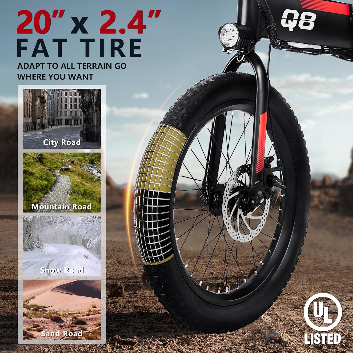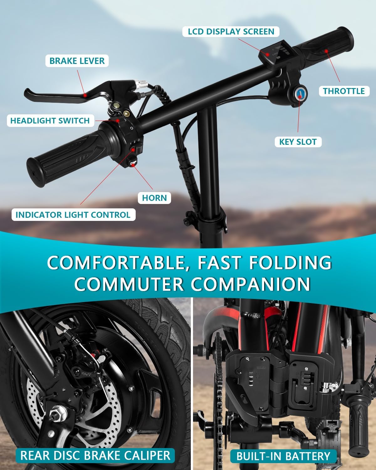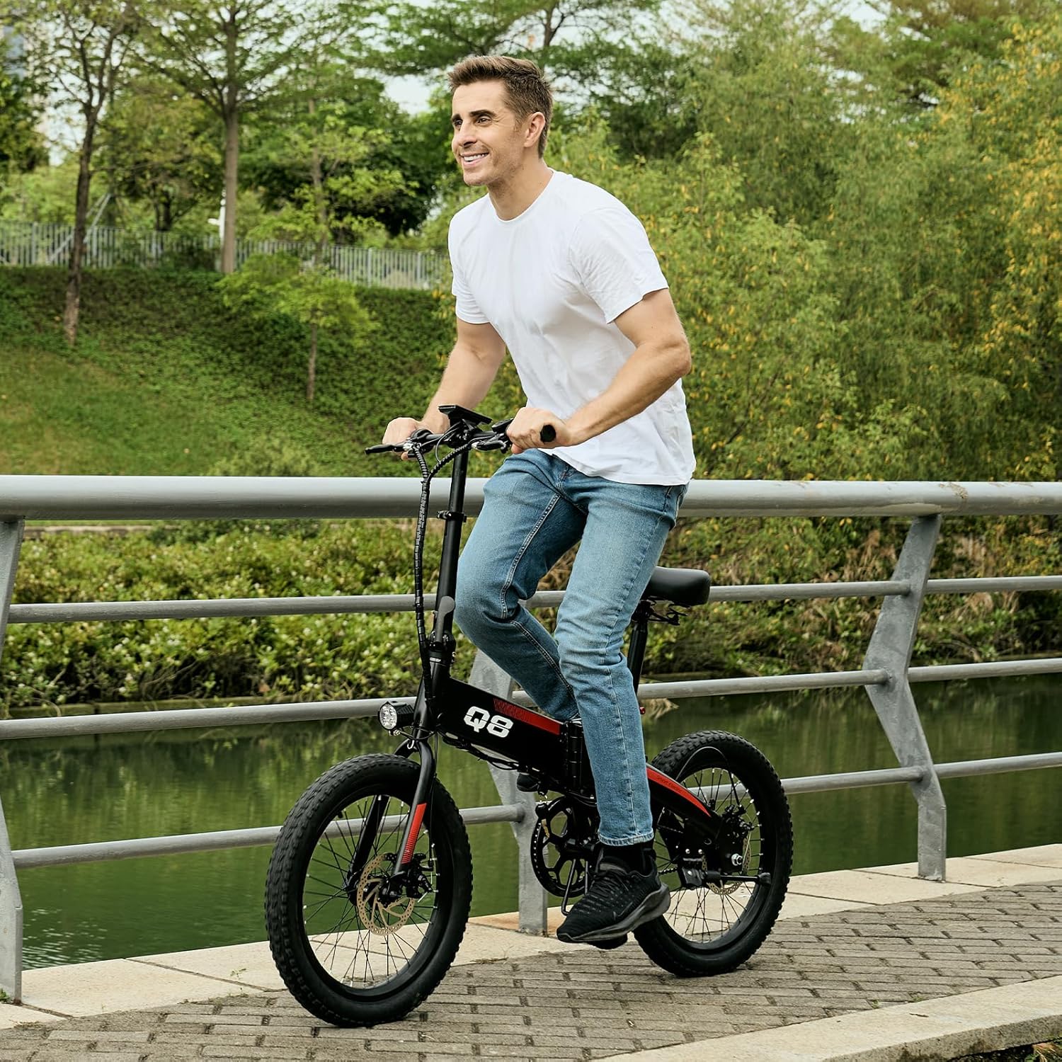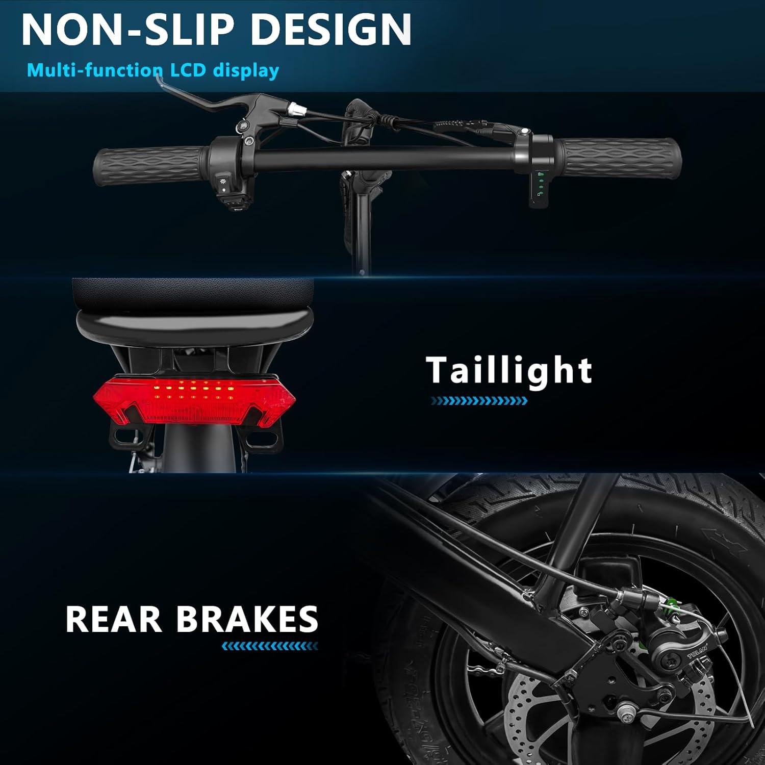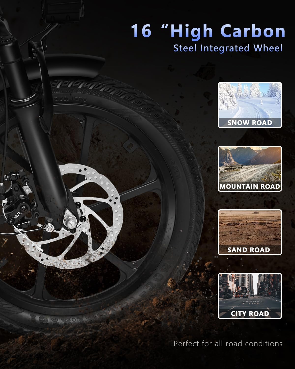 - __afety & Comfort__he ebike has adjustable seat and handlebar heights and is equipped with the center, front fork, and seat suspension absorbers, providing a smooth and comfortable riding experience. Equipped with a disc brake system. The LED display shows the battery information, and the front and rear lights ensure safe riding at night.