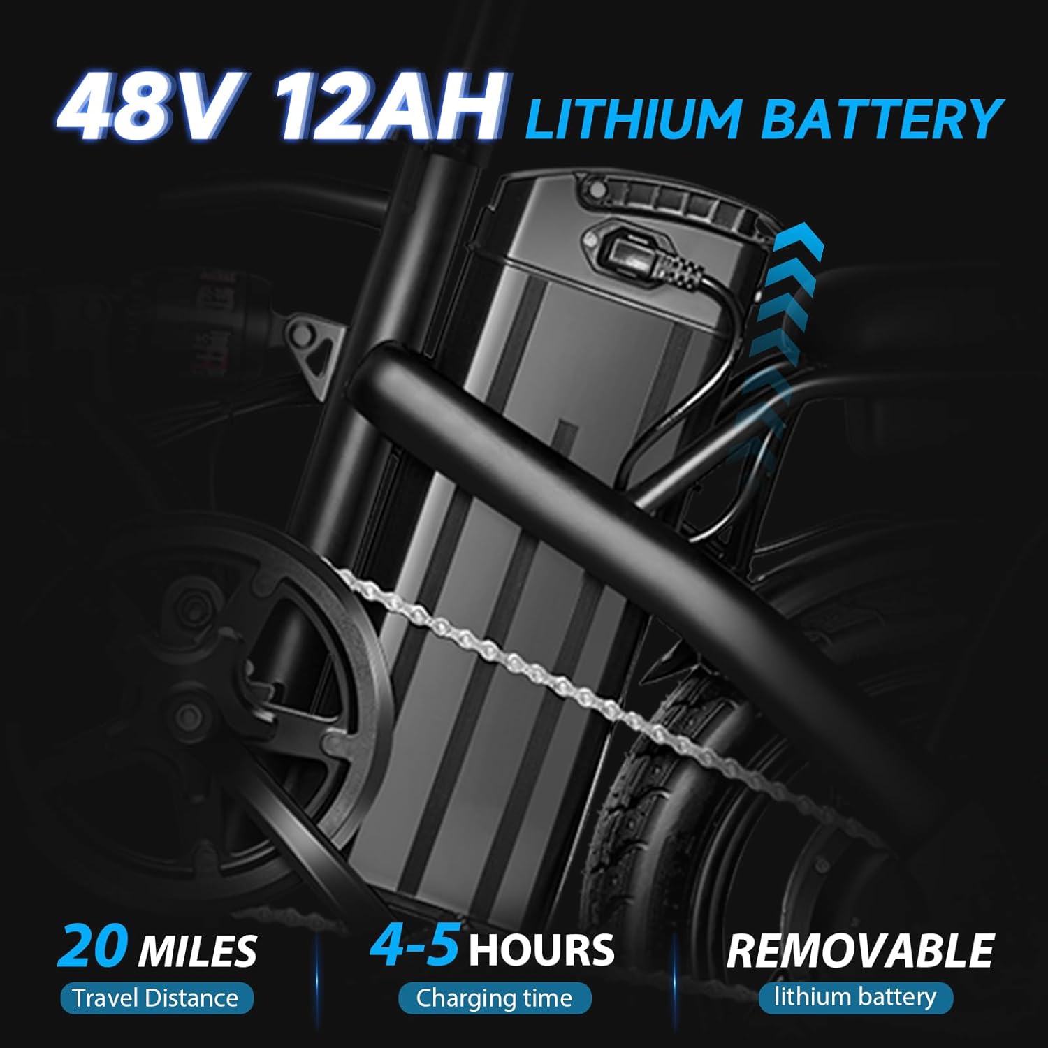- _576Wh Anti-theft Lithium Battery__he electric bicycle is equipped with a 48V 12Ah high-capacity lithium battery. The battery needs a key to open, and the anti-theft design is more reassuring. It takes 4-5 hours to charge for the first time, and the charger can continue to charge for 1-2 hours after the green light is on. It is recommended to keep the battery power above 20% to prevent power loss.