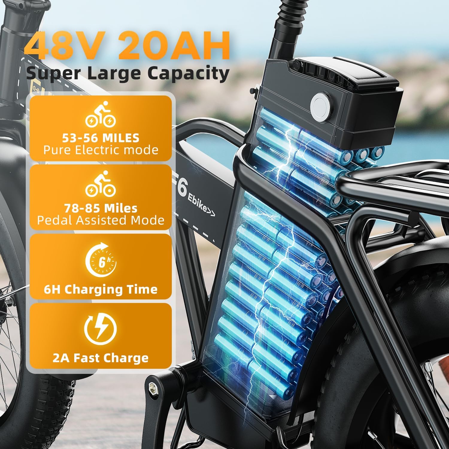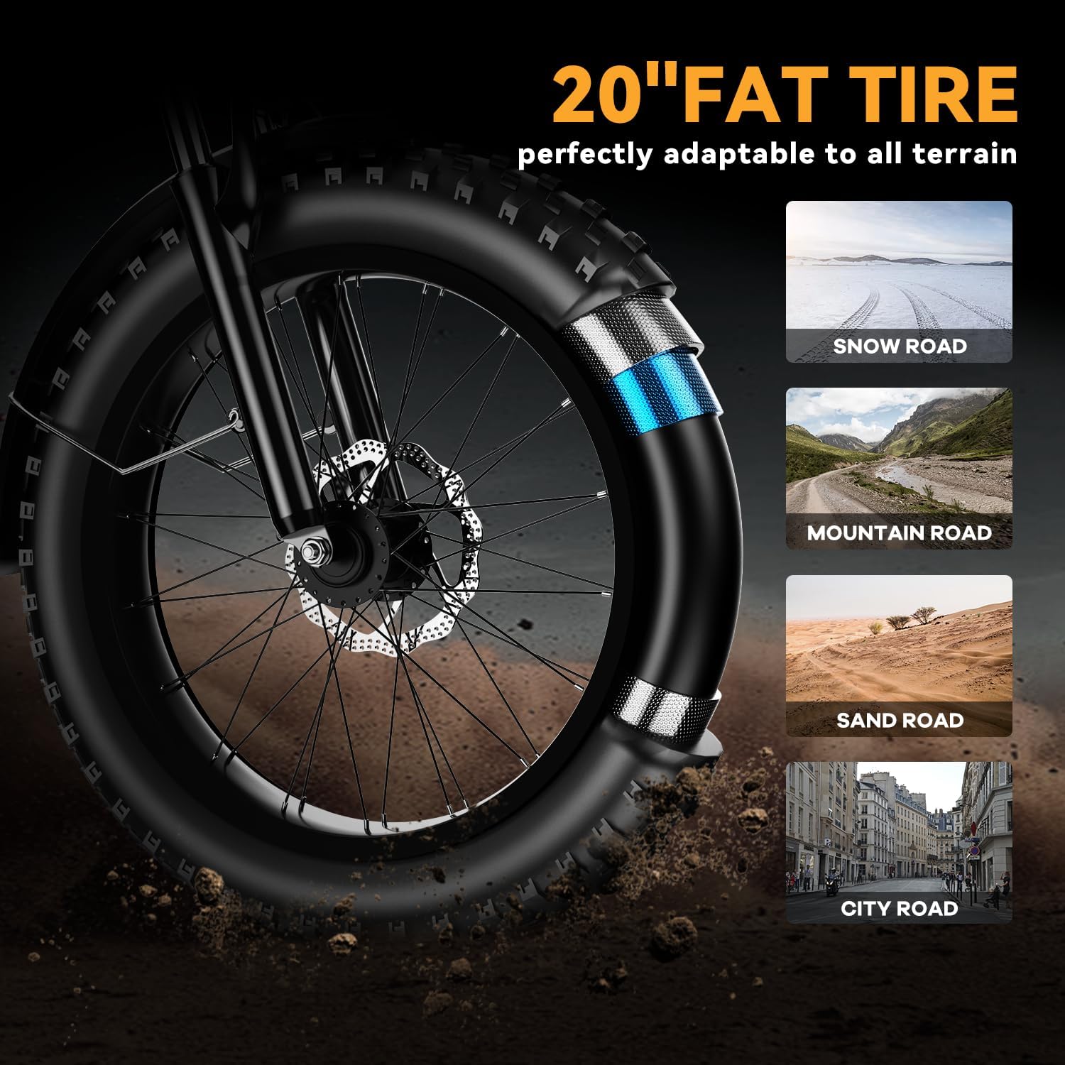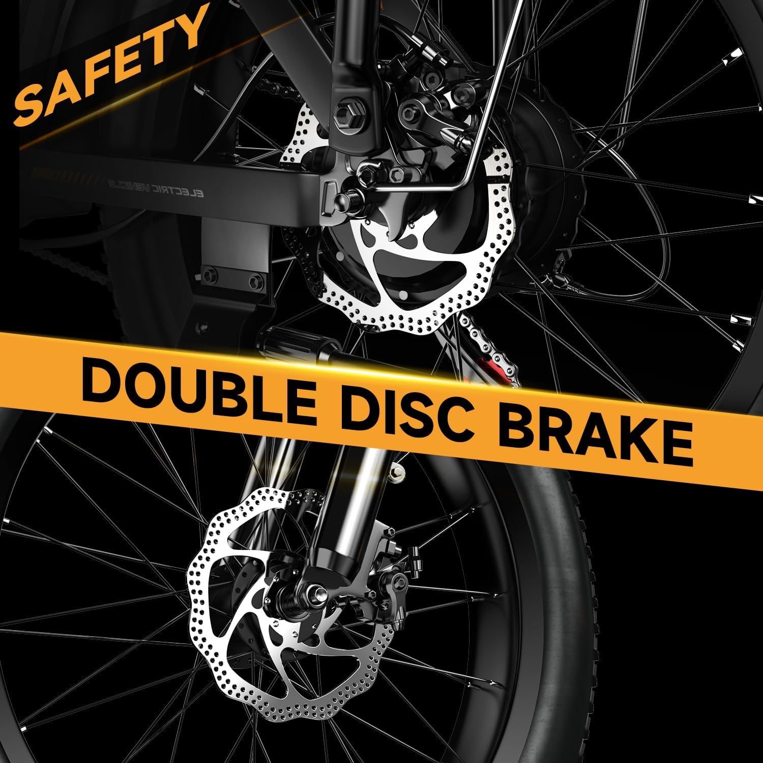 - ________ ______ ______________________ ____________: The electric bicycle adopts EABS power-off brake + front and rear double disc brakes for sensitive braking. It is designed with strong off-road performance, reliable braking force and high safety factor. High-strength shock-absorbing front fork and seatpost absorb the bumps of long, rough roads. The 20' fat tires are anti-slip and puncture-proof, ensuring you can ride like roads, snow, beaches, and rugged mountain roads.