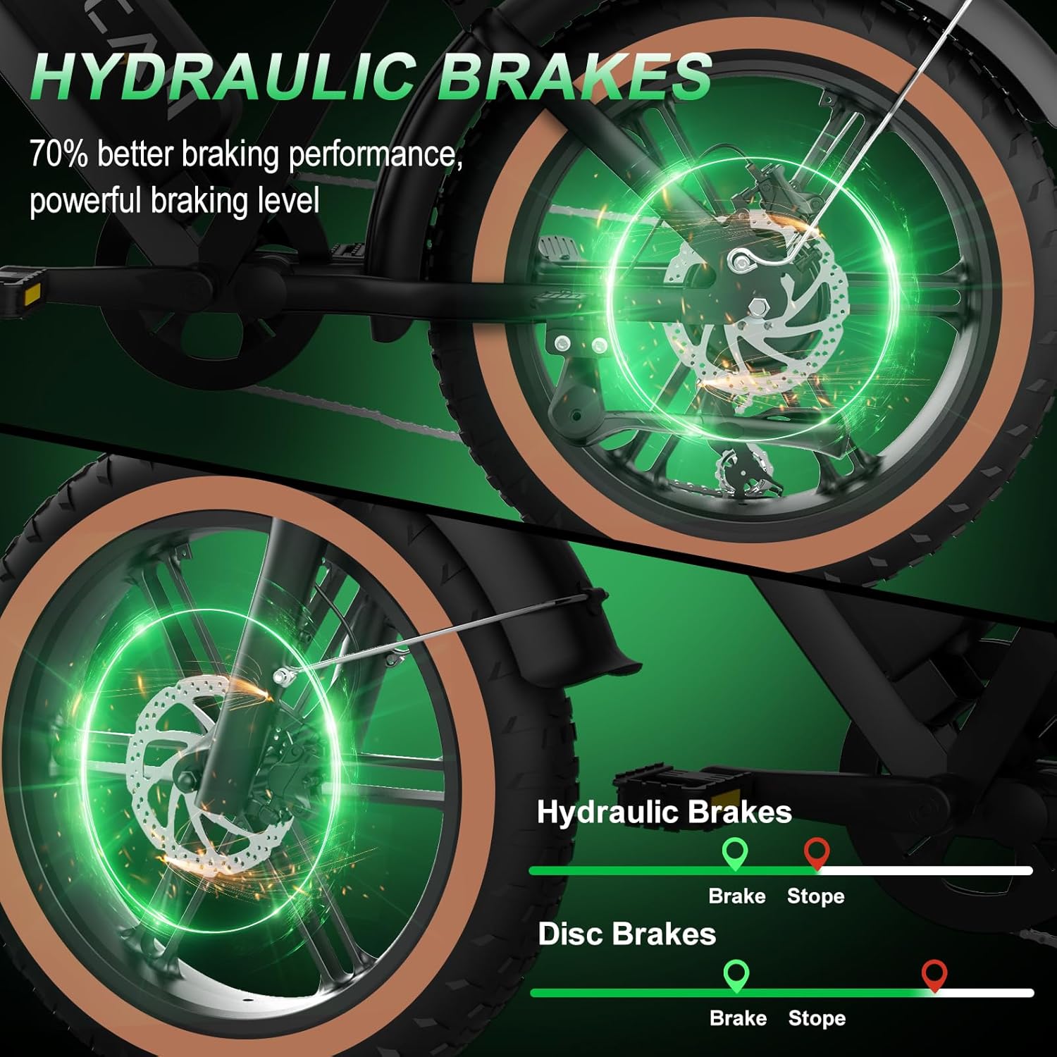 - __ll-Weather Dual Disc Brakes for Reliable Stopping_ The MOVCAN fat tire electric bike features high-performance dual disc brakes delivering instant stopping power in any condition. Designed for ebike for adults, this system provides faster response than standard brakes with superior heat dissipation for downhill riding, plus reliable rain/snow performance. Its durable, low-maintenance design ensures consistent braking power for confident control on city streets or mountain trails.