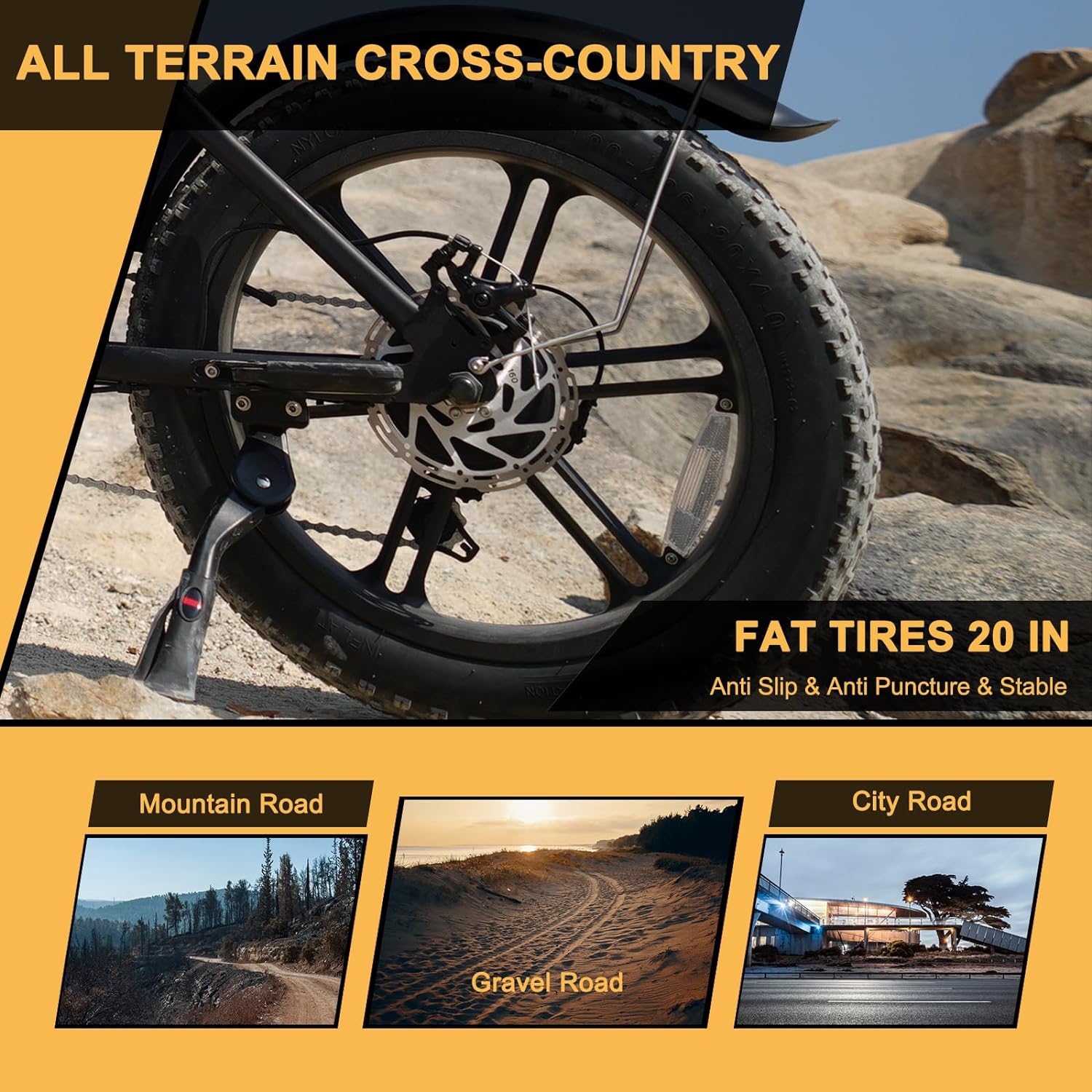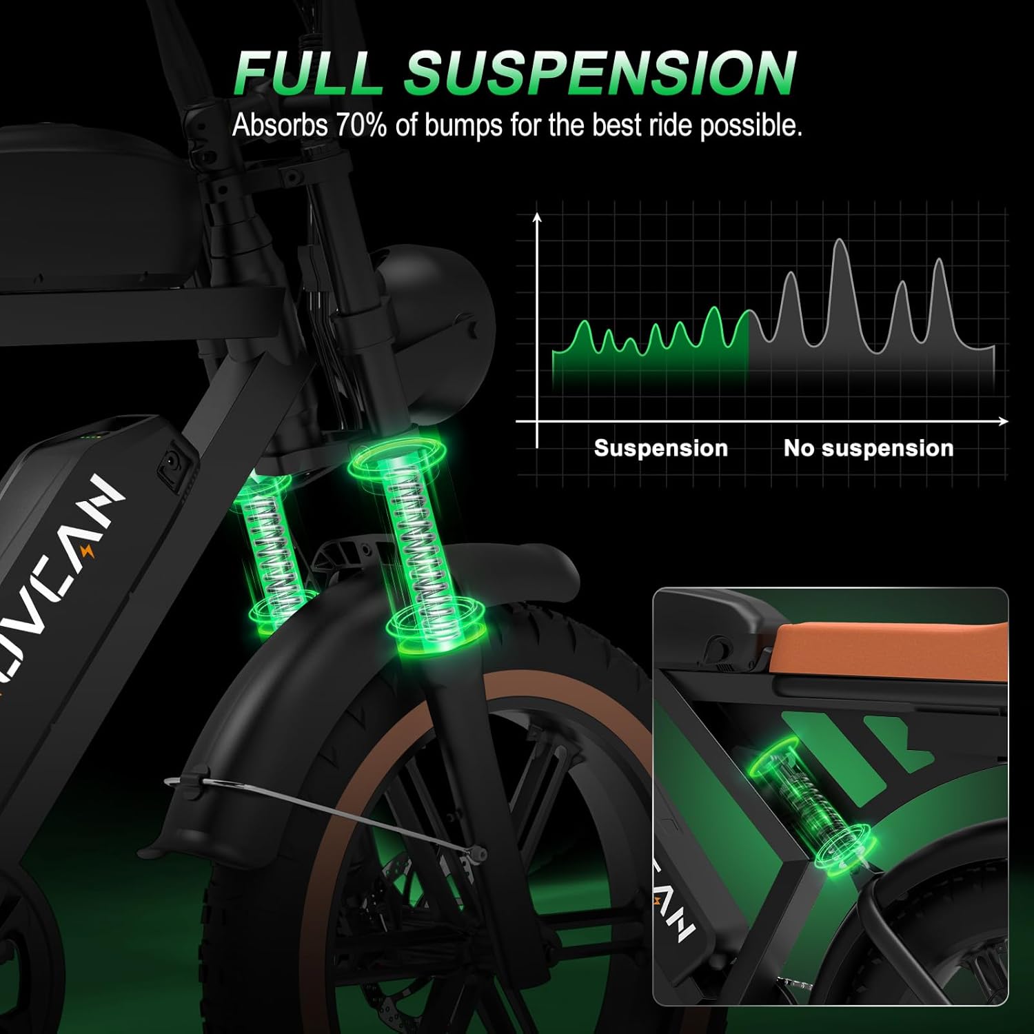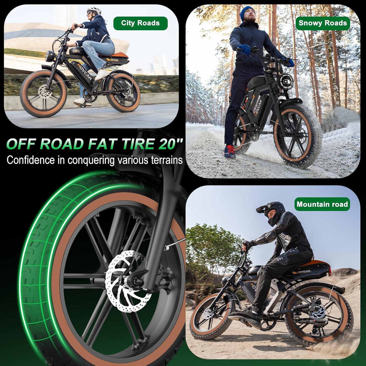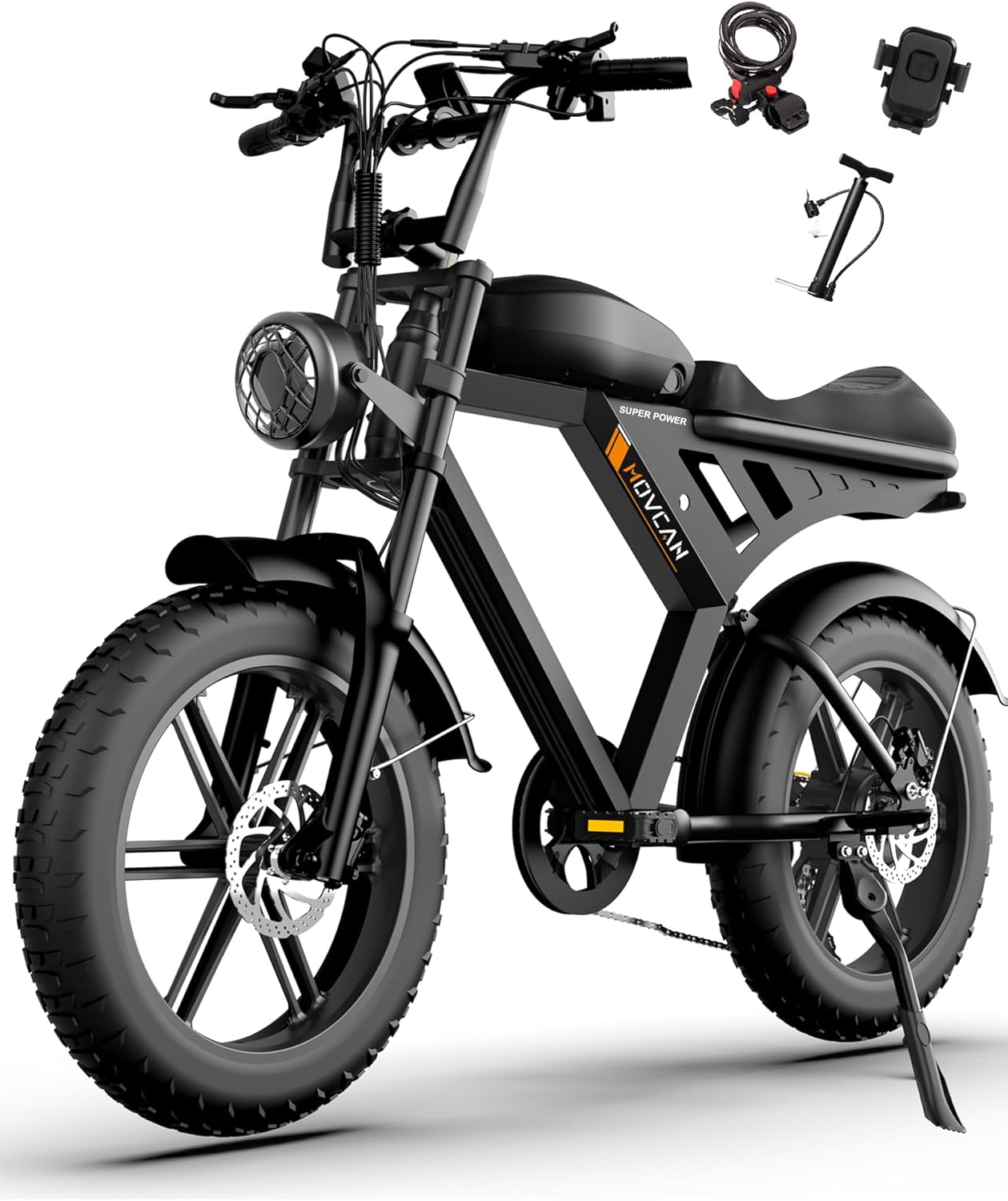 - __ll-Terrain Dominance with Fat Tires & Suspension_ The MOVCAN fat tire ebike tackles any landscape with 20_4' puncture-resistant tires and a 5-level suspension system (dual front fork + rear shock). This MOVCAN moped ebike delivers triple-layer comfort: tires absorb bumps, front suspension smooths rough terrain, and rear damping eliminates vibrations. Conquer sand, snow, or rocky trails with exceptional stability and traction, enjoying effortless control on every adventure.