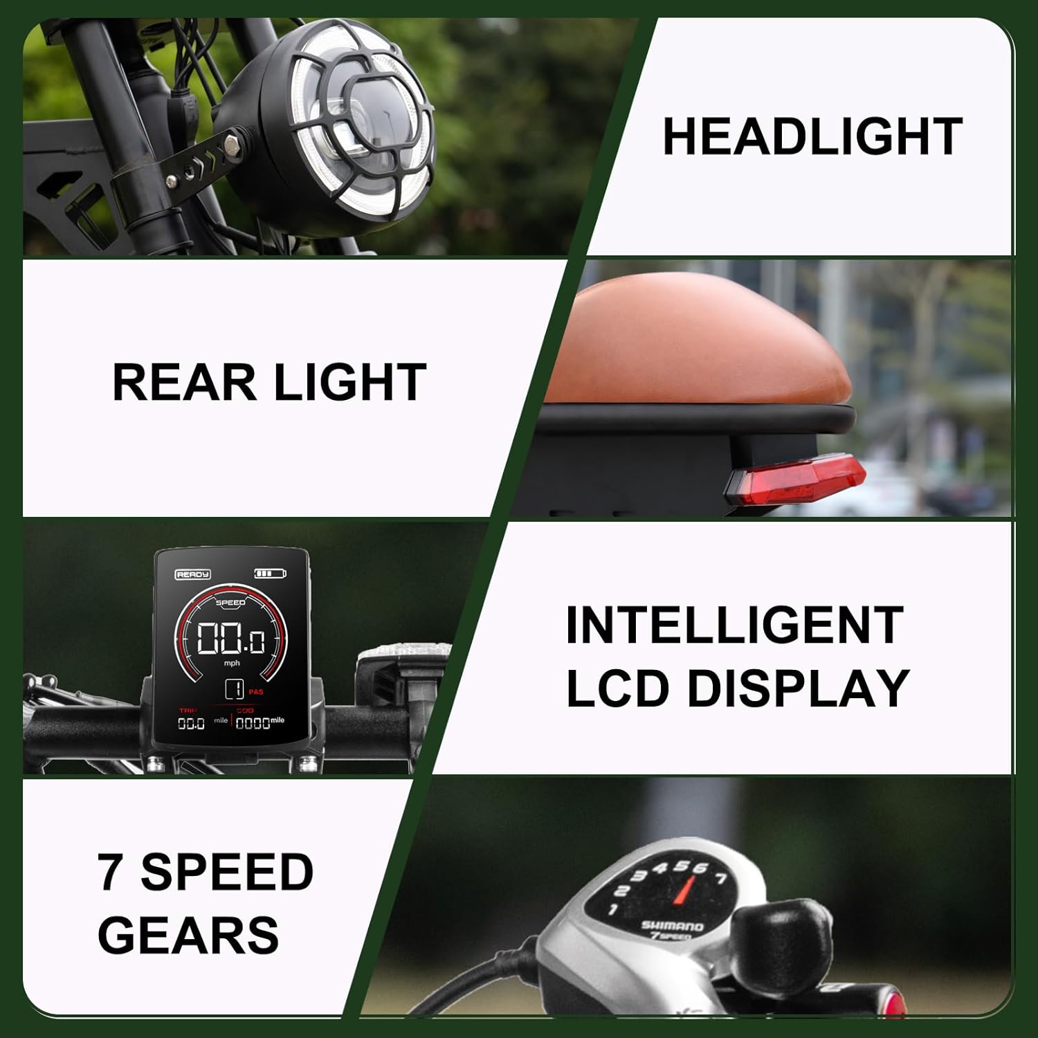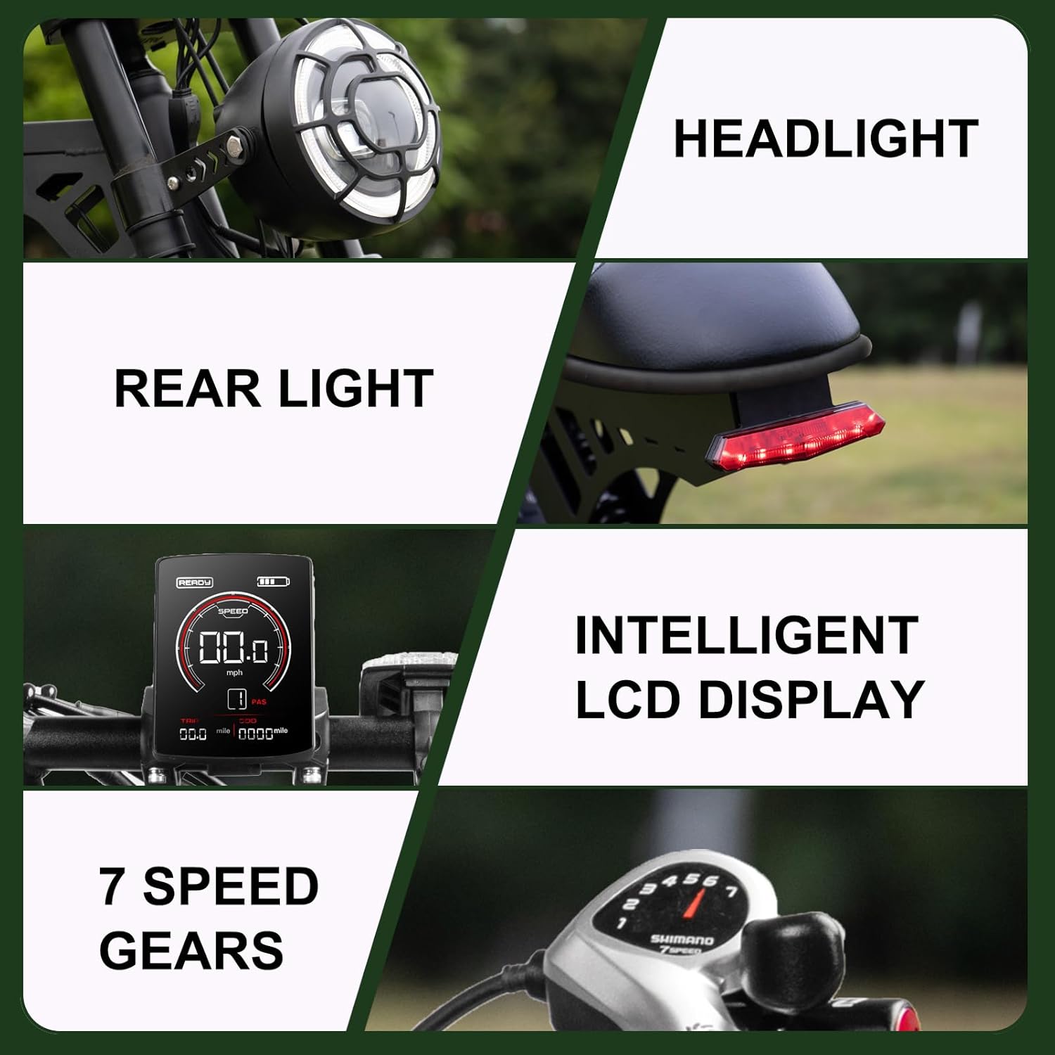 - __igh-Performance 1000W Motor for Thrilling Rides_ The Movcan electric motorcycle for adults delivers unmatched power with its 1000W (peak 1500W) motor, reaching 28 MPH top speed and conquering 30° slopes effortlessly. Experience smooth gear shifts with the professional 7-speed drivetrain, perfect for tackling mountains, trails, and rugged terrain. This electric bike offers an adrenaline-packed riding adventure you won't forget!