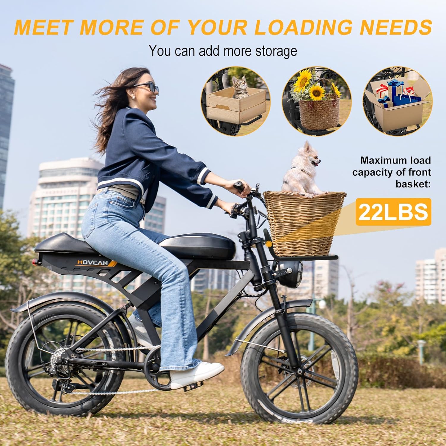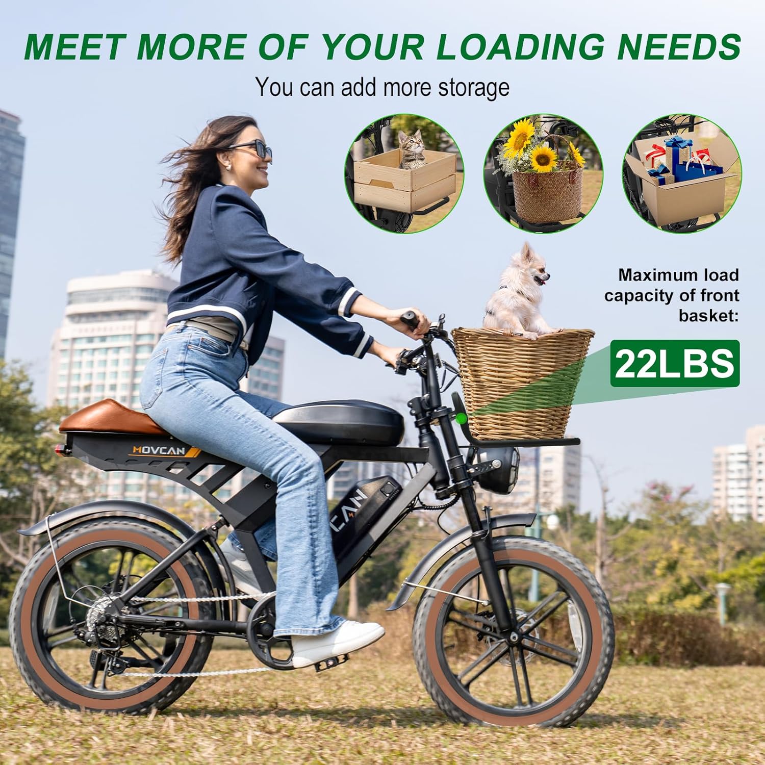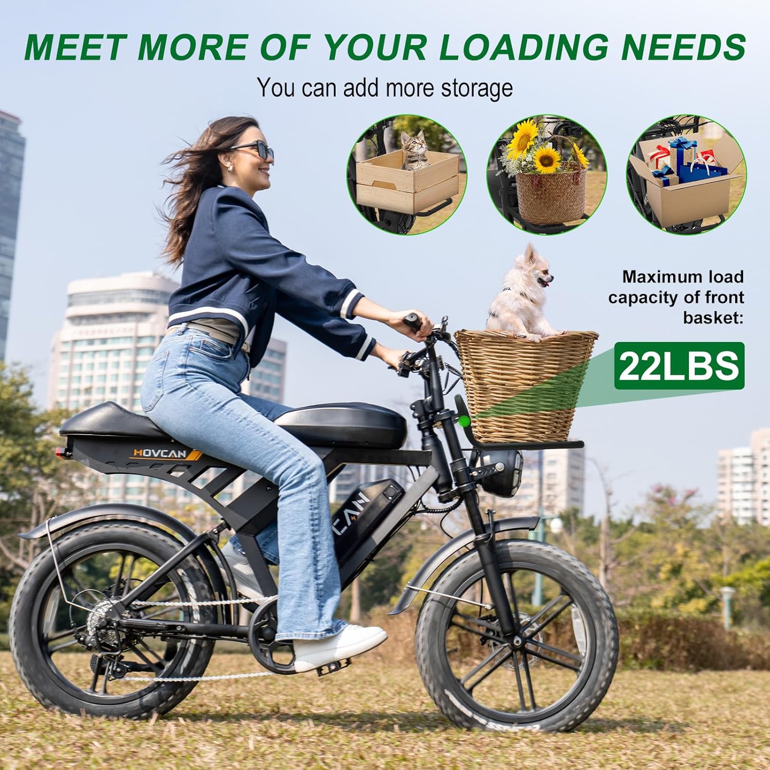 - __onvenient Storage for Your Adventures_ The MOVCAN electric dirt bike for adults features a spacious front basket with a 22lb capacity, perfect for carrying essentials on your rides. Whether commuting or exploring off-road trails, this electric bike off road ensures you have everything you need within easy reach. The sturdy, well-designed basket adds practicality without compromising performance, making every journey__hether urban or outdoor__ore enjoyable and hassle-free.