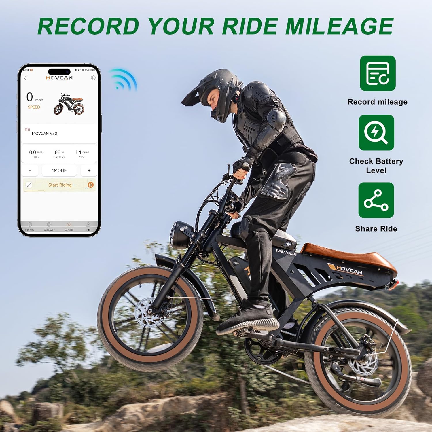 - __mart Safety & Digital Control System_ The MOVCAN ebike motorcycle delivers superior night visibility with its high-brightness lighting and reflective design. Perfect for e bikes for adults electric, it features a smart digital display showing real-time mileage, battery level, and 4 riding modes. The companion app tracks rides while the integrated safety system ensures protection day or night, offering enhanced control for every journey.
