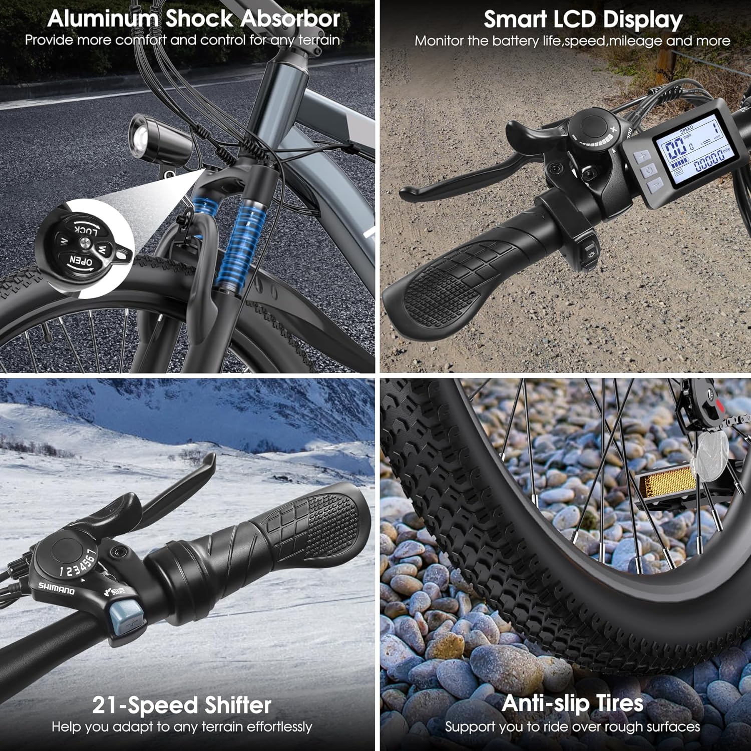 - Safe Ebike Configuration: 26 inch electric bike for adults adopts a lockable front shock absorber to smooth out bumps, rocky and uneven terrain. The added fenders protect your bike away from mud and water. The smart LCD display provides real-time data, including battery life, current speed, mileage, pedal assist level and more. Other reliable e-bike designs like mechanical dual disc brakes, LED headlight and electric horn system and reflectors, safeguard your safety.