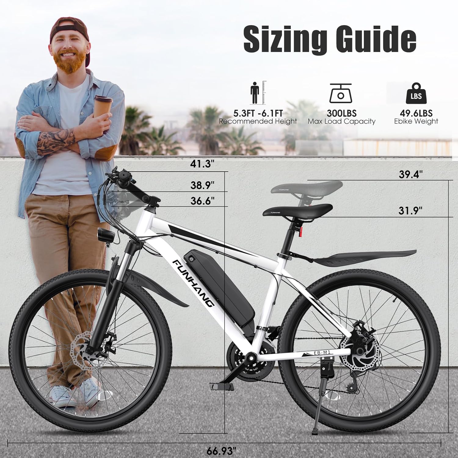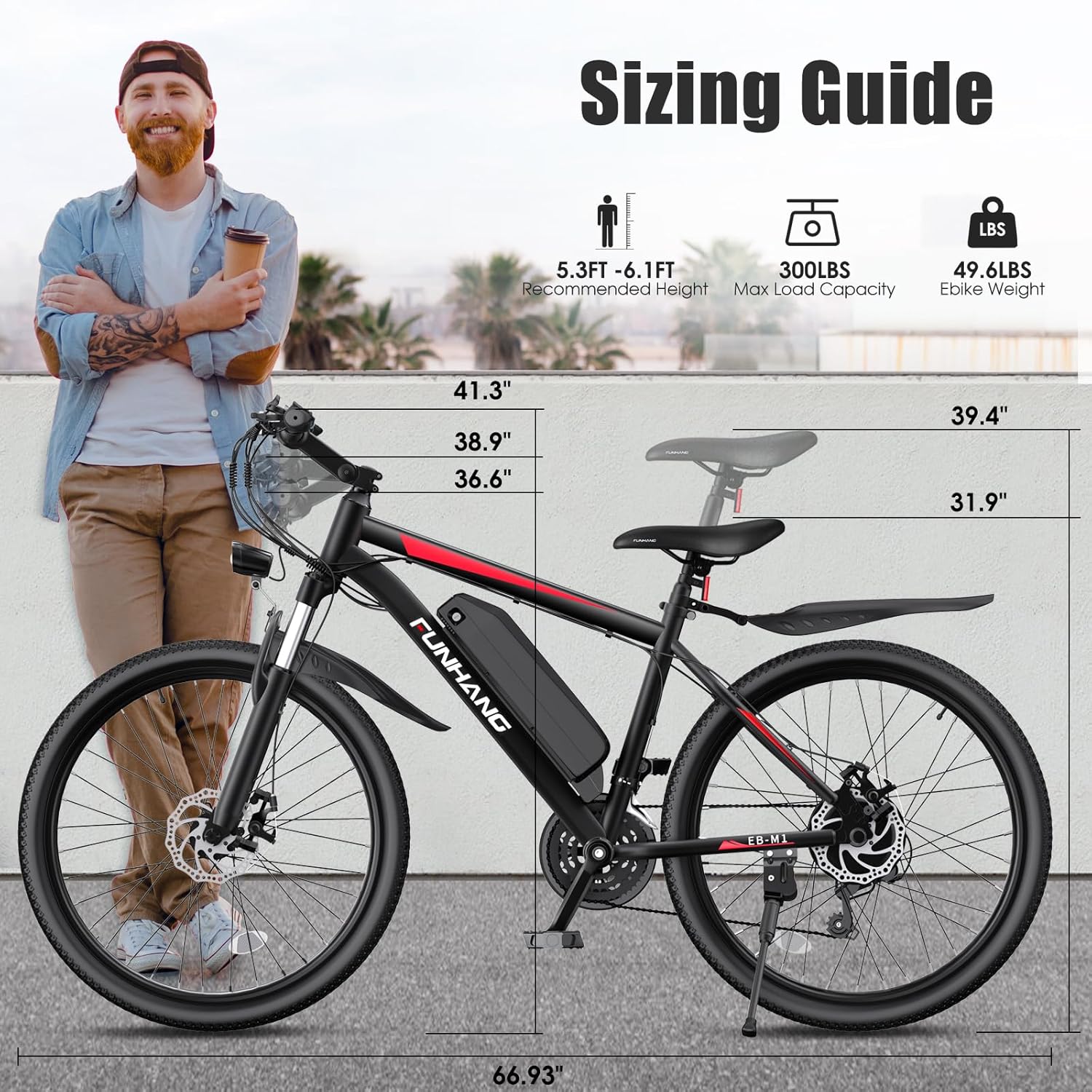 - Durable Frame & Adjustable Handlebar/Seat: Funhang EB-M1 model is made of a solid and durable frame, anti-slip 26' tires for a better grip in extreme conditions. The upgraded handlebar stem and comfy seat can be easily adjusted to your preferred riding positions. This electric bicycle comfortably suits adult and teen riders between 5_3_-6_1_ tall and up to 300 lbs/135kg.
