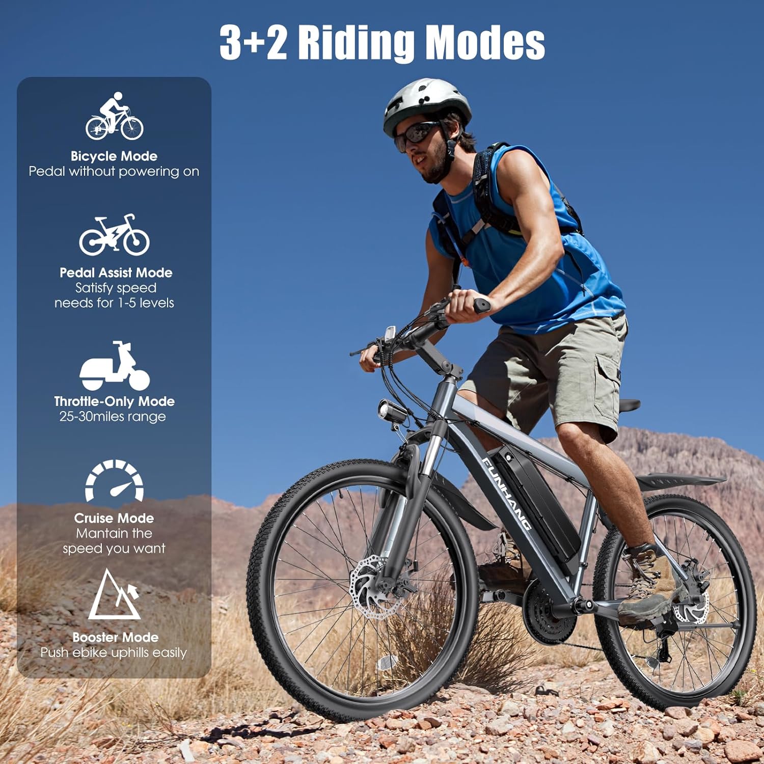 - Customized Riding Experience: The electric mountain bike features 5 working modes and 5 pedal assist levels. Throttle Ebike & Assisted Bicycle & Normal Bike & Cruise Mode & Booster Mode for your option. Kicking in 1-5 PAS levels or twisting the throttle will make your ride a breeze. Booster Mode helps you push your bike effortlessly. Combined with the 21-speed shifting gears on the adult electric bicycle, you can customize your speed needs and riding style for any biking terrain.