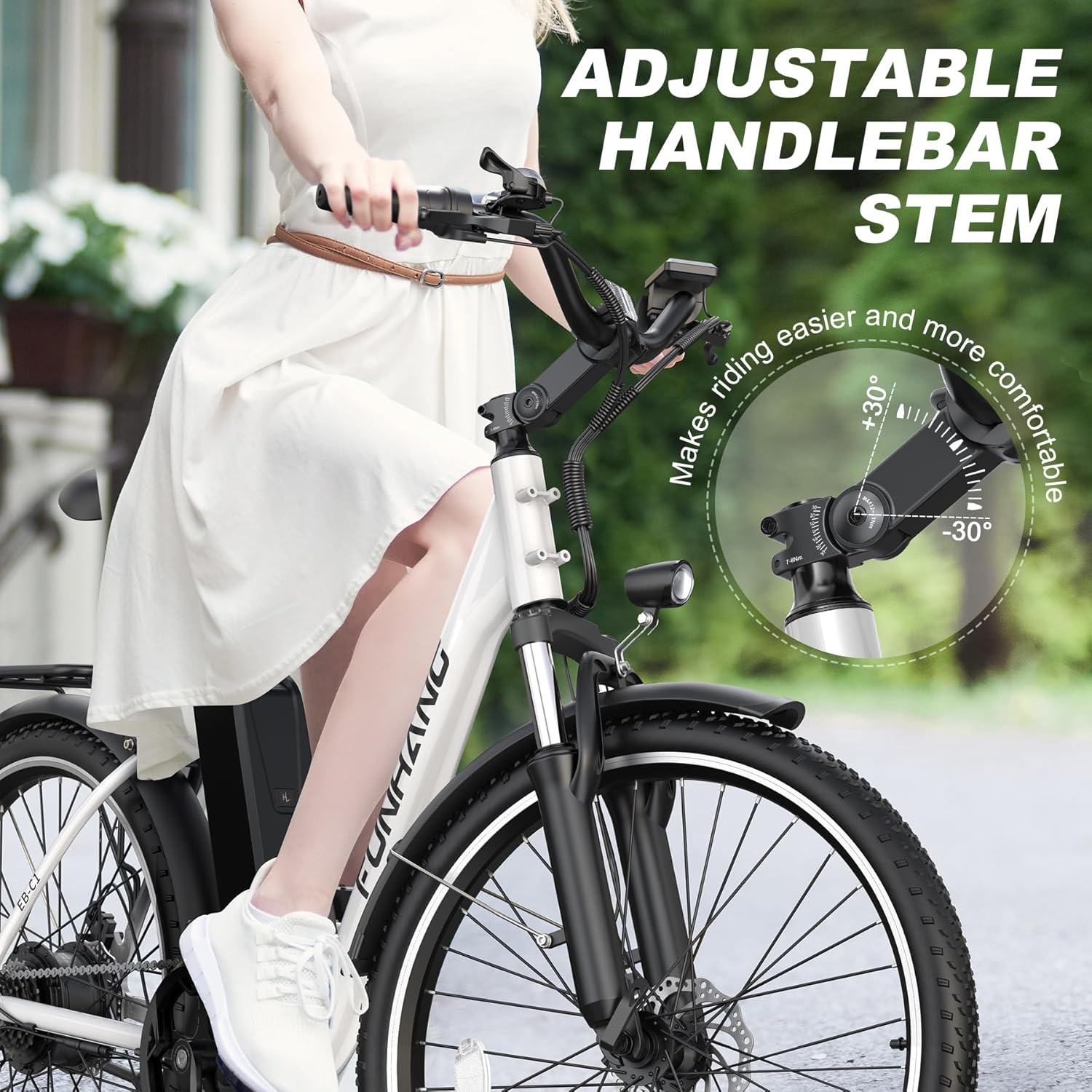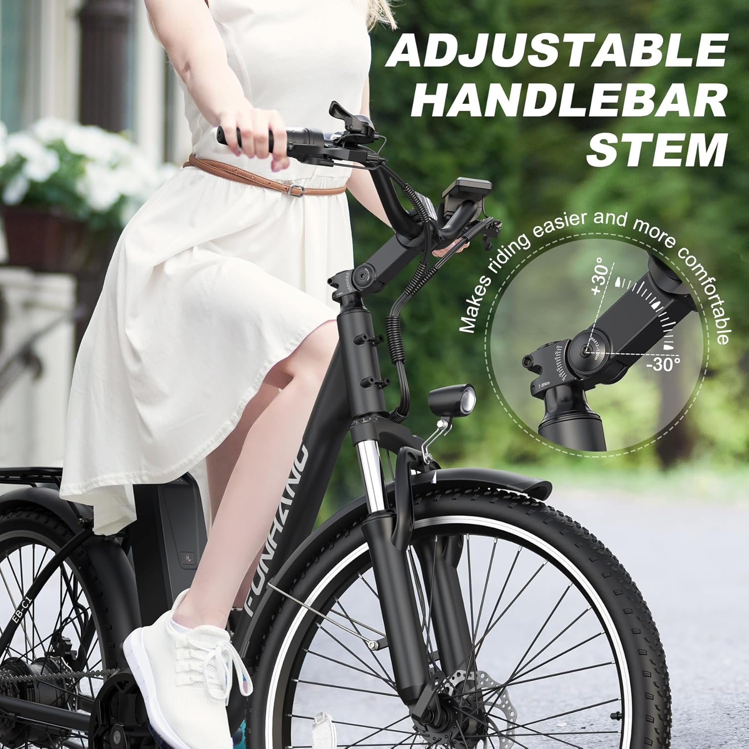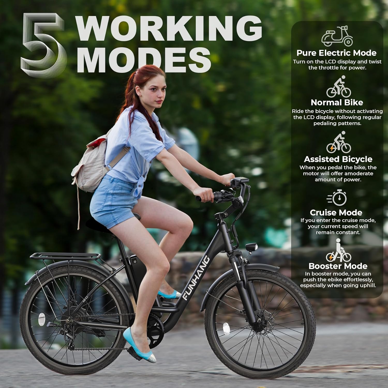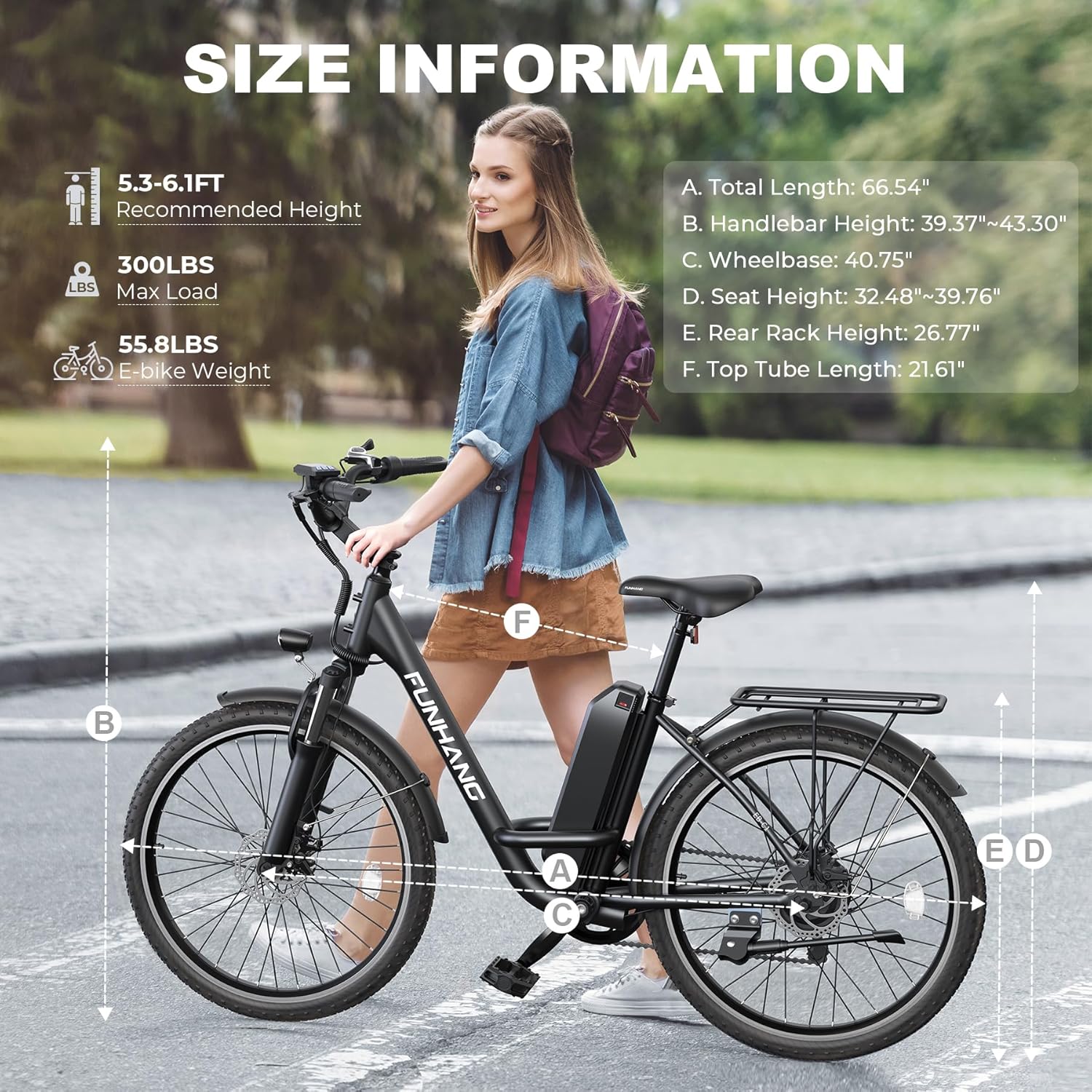 - 100% SATISFACTION SERVICE: Funhang EB-C1 commuter ebike is 85% pre-assembled. Please follow the steps in the user manual and assembly video on our product page to complete the rest of the installation. The recommended height of the Funhang electric bike for women is 5.3-6.1ft, and the max load is 300lbs. We provide a 365-day warranty and 24-hour online response. If you have any questions or suggestions about Funhang ebikes, please feel free to reach out to us. We will get back to you soon.