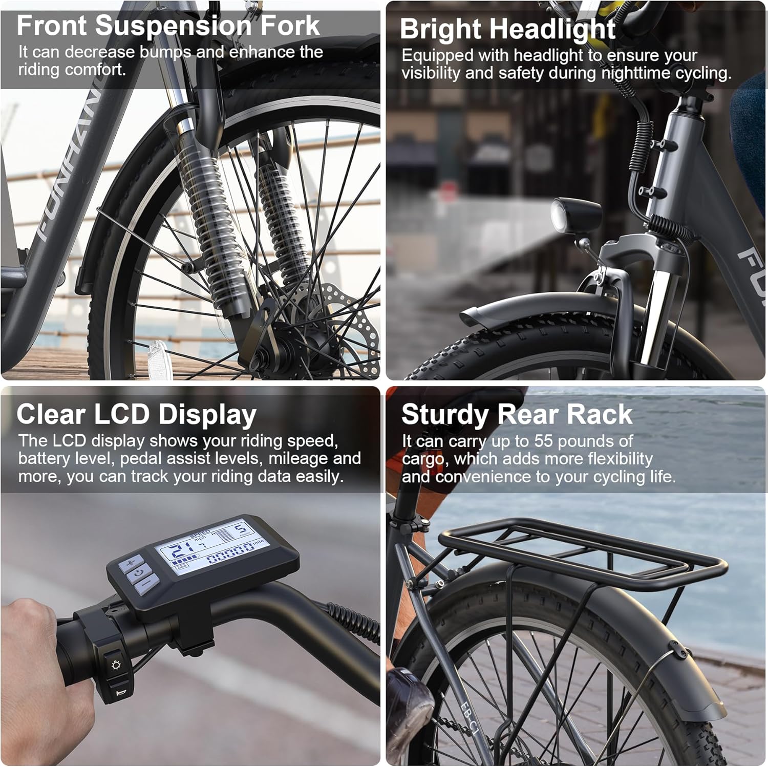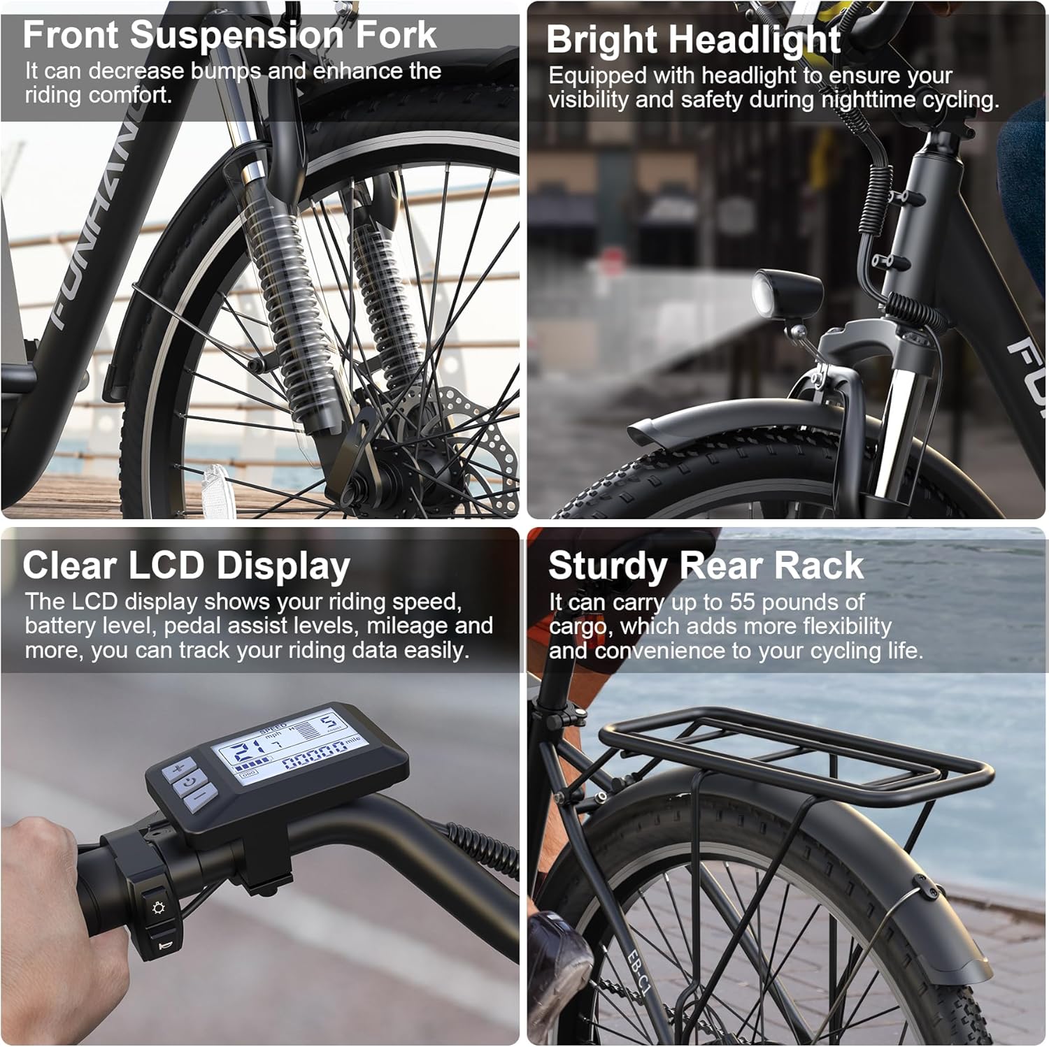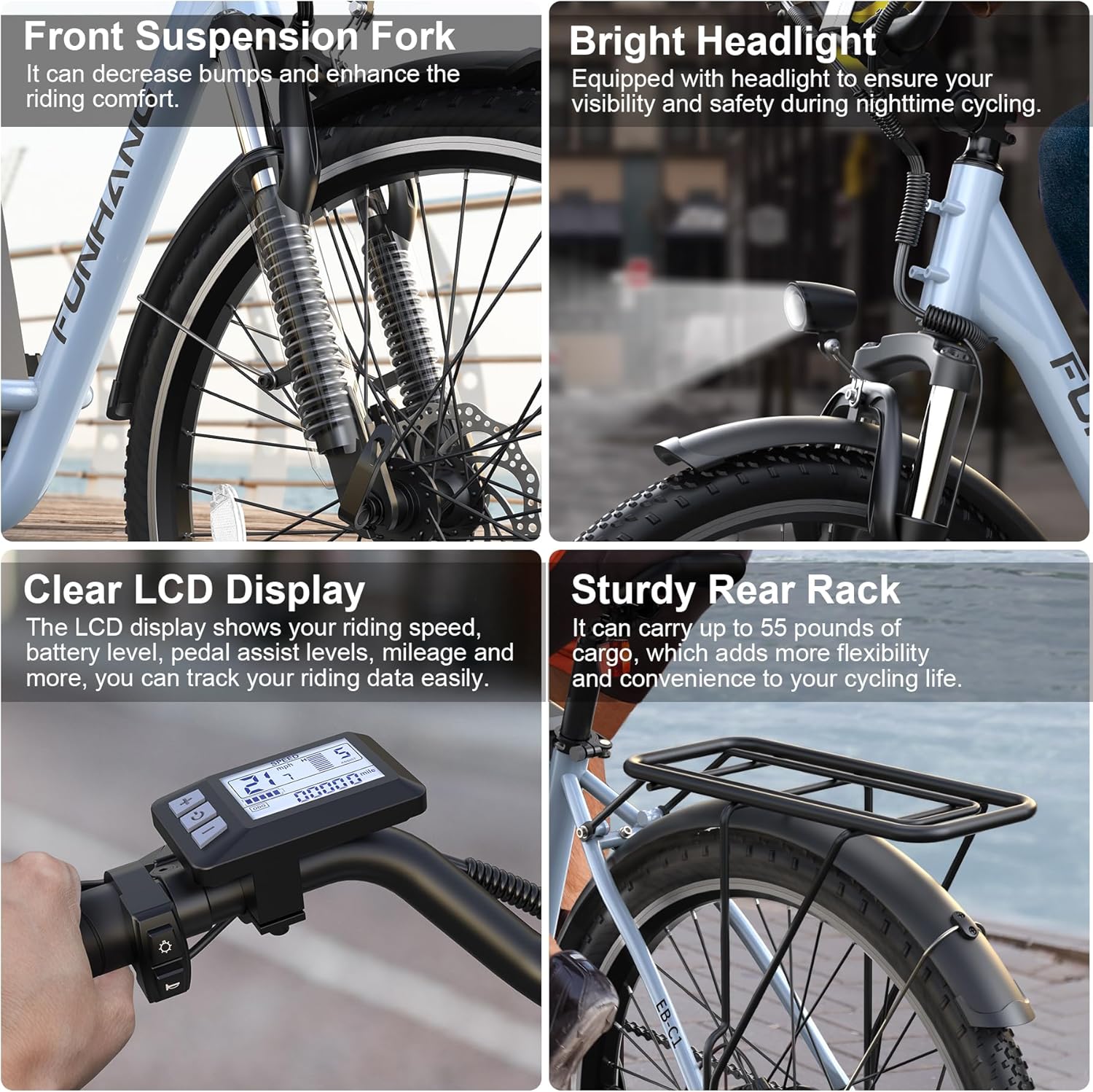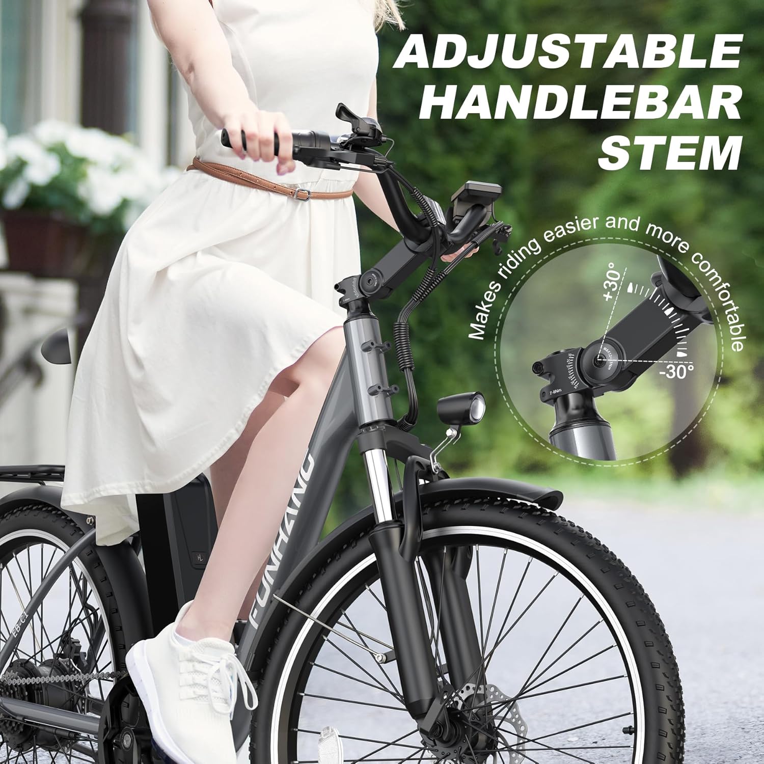 - 100% SATISFACTION SERVICE: Funhang EB-C1 commuter ebike is 85% pre-assembled. Please follow the steps in the user manual and assembly video on our product page to complete the rest of the installation. The recommended height of the Funhang electric bike for women is 5.3-6.1ft, and the max load is 300lbs. We provide a 365-day warranty and 24-hour online response. If you have any questions or suggestions about Funhang ebikes, please feel free to reach out to us. We will get back to you soon.