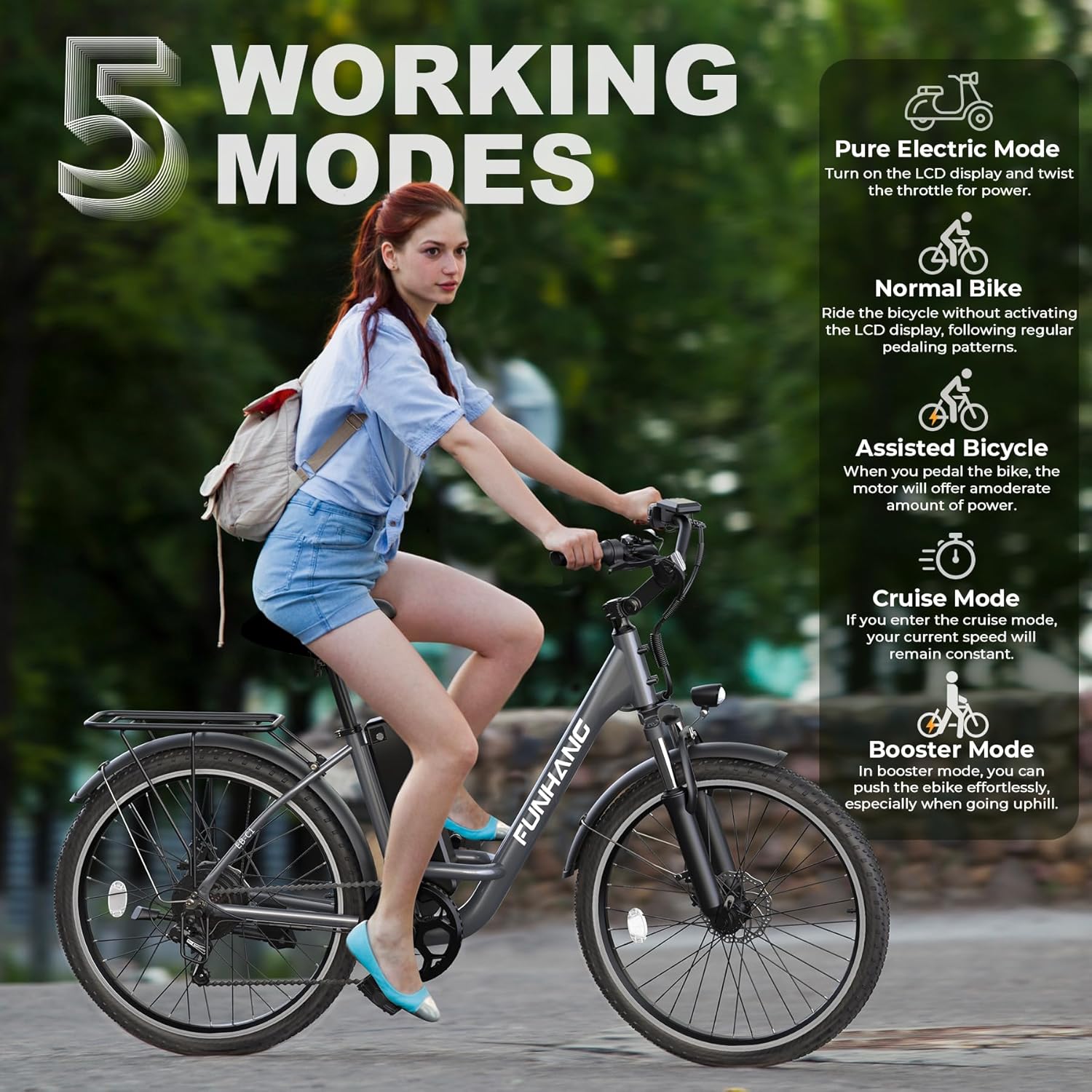 - 5 VERSATILE WORKING MODES: This electric bike for women features five working modes and five pedal assist levels to suit all your cycling needs. You can experience the ultimate flexibility in pure electric mode, assisted bicycle mode, normal bike mode, cruise mode, and booster mode. It allows you to explore new paths, handle varied terrains, and make every journey enjoyable. Whether you're an experienced cyclist or new to riding, this ebike is the perfect companion for your cycling life.