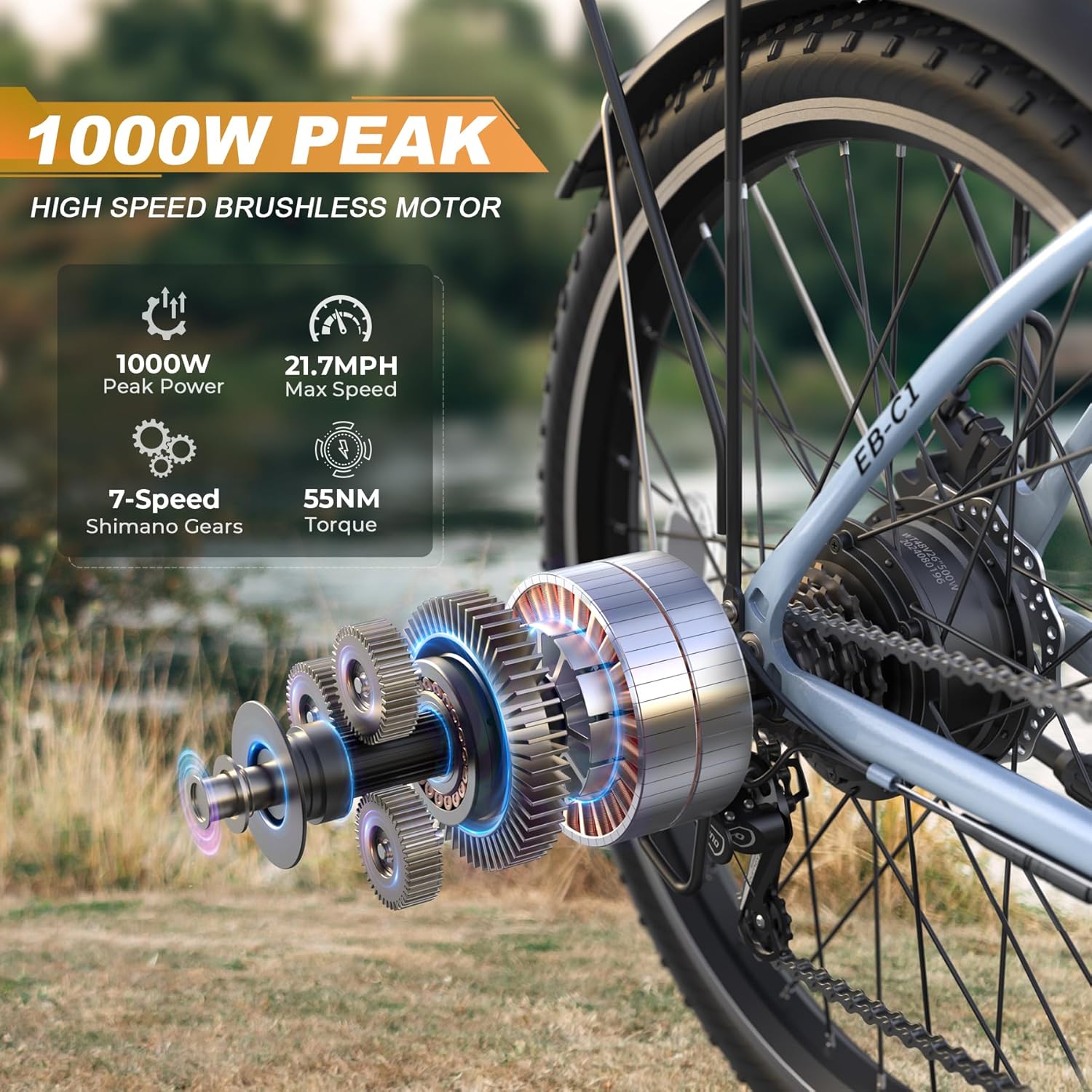 - EXCELLENT EBIKE CONFIGURATION: Equipped with 7-speed gears, this adult electric bicycle allows riders to effortlessly switch gears and adapt to various terrains for a smooth ride. The front suspension absorbs shocks from bumps and uneven roads. The LCD screen keeps you informed with essential ride data, such as speed, mileage, battery level, and more. The front headlight illuminates your path during nighttime rides. The reliable braking system ensures confident braking force for a safer ride.