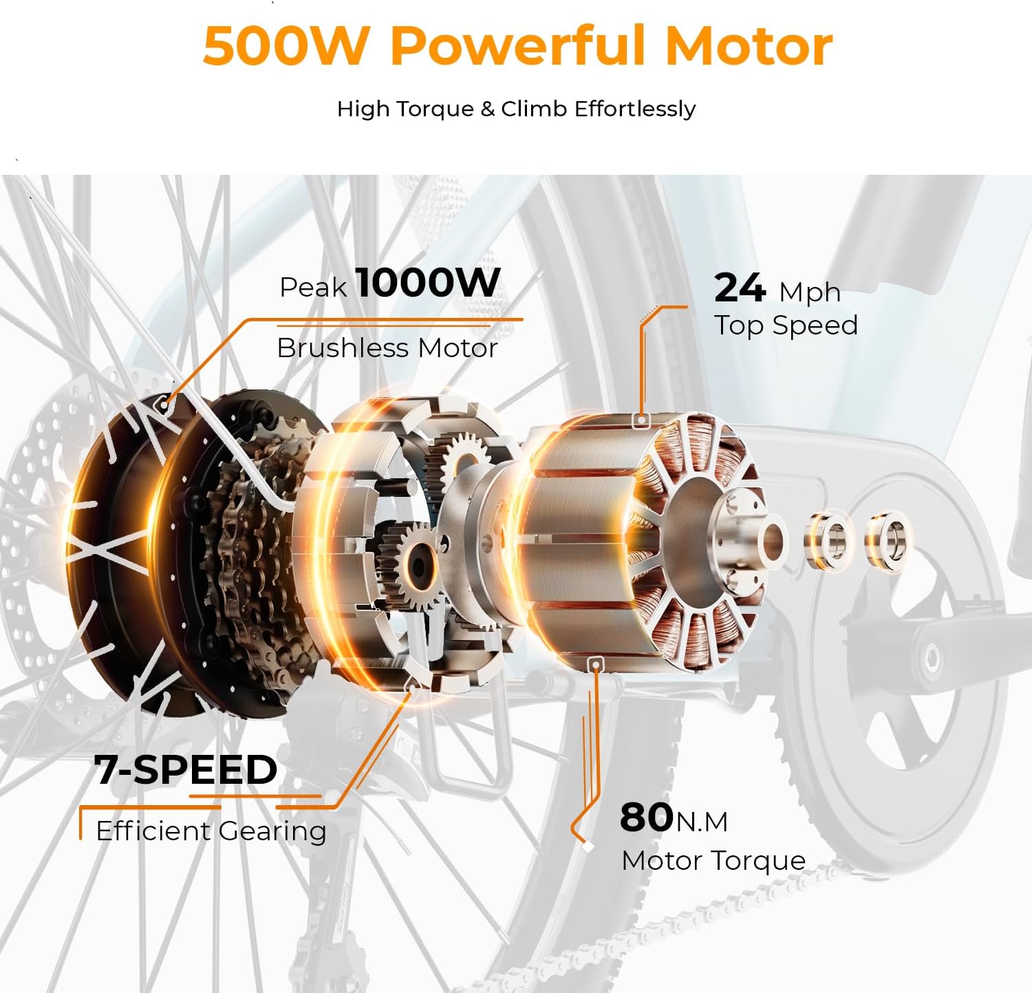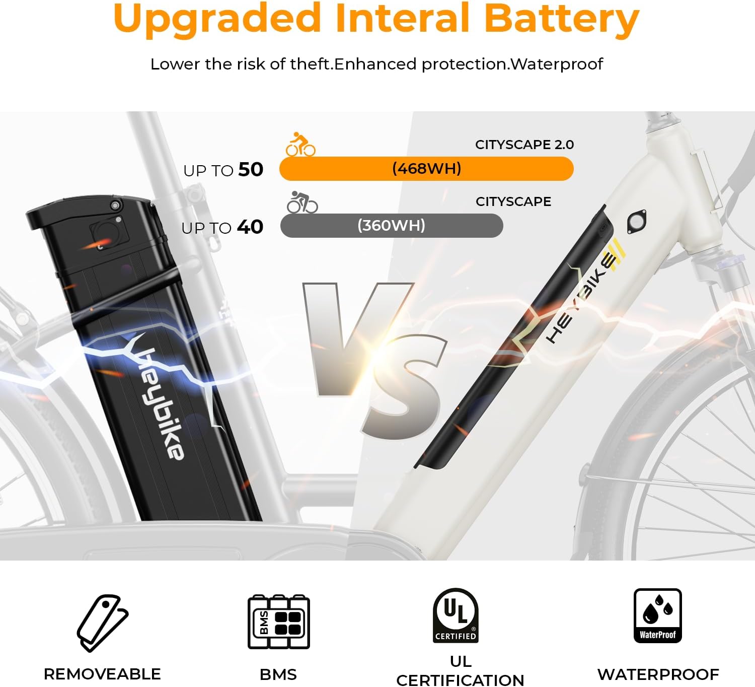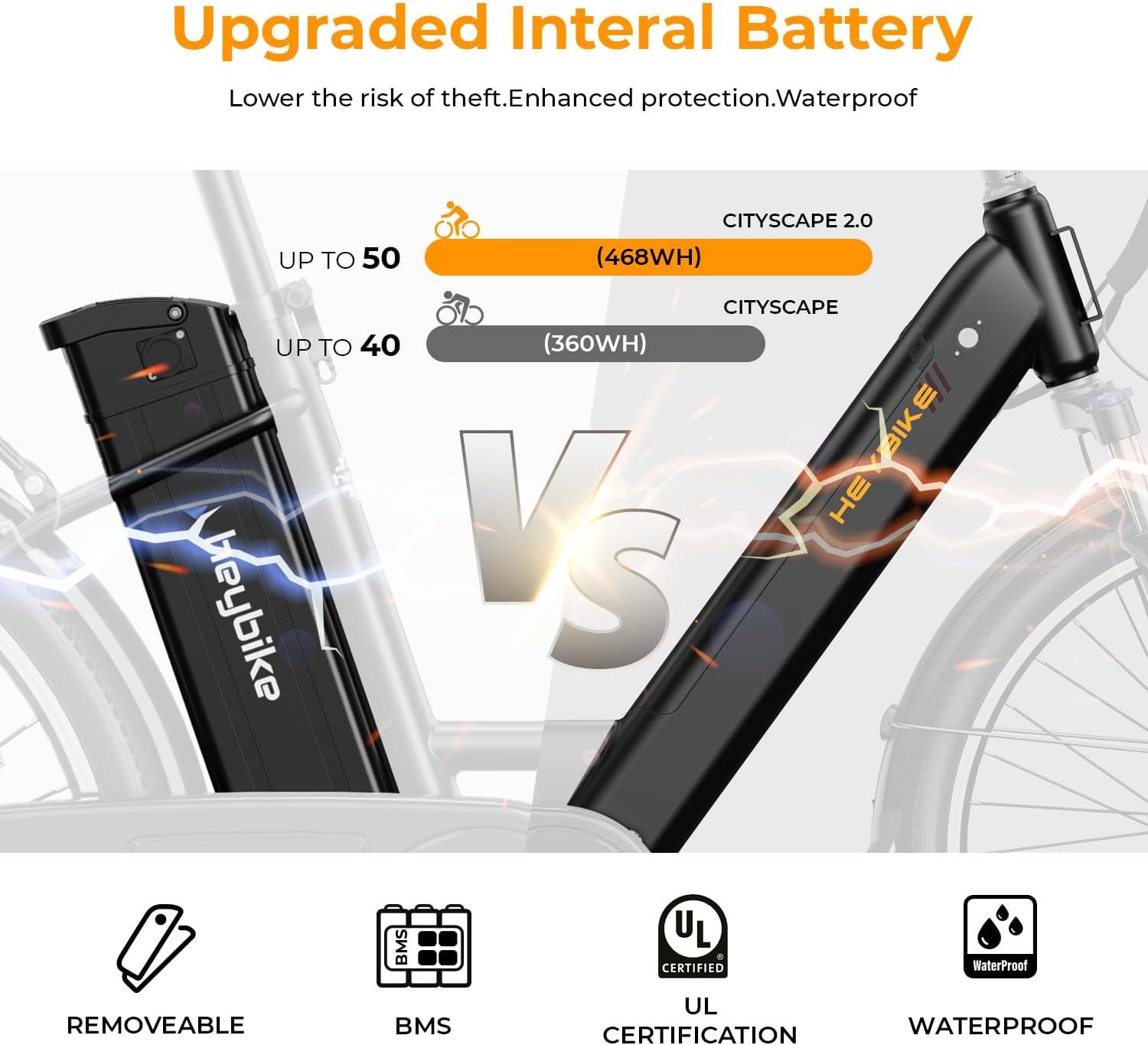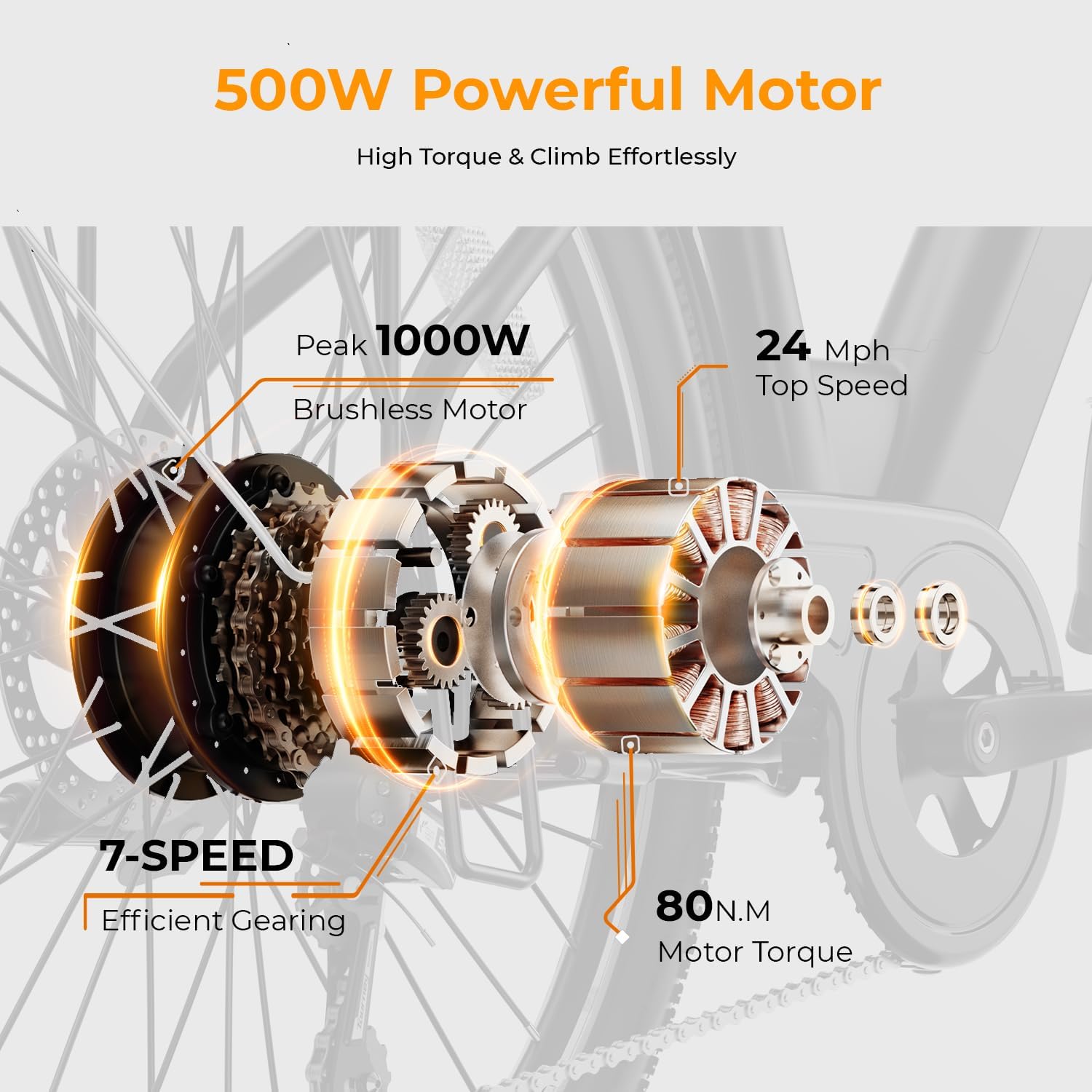 - 500W High Torque Motor-Equipped with a 500W brushless motor (peak 1000W), Heybike Cityscape 2.0 boasts such powerful power that riders can effortlessly maneuver through traffic and tackle steep hills or challenging terrains with a maximum speed of up to 24MPH.