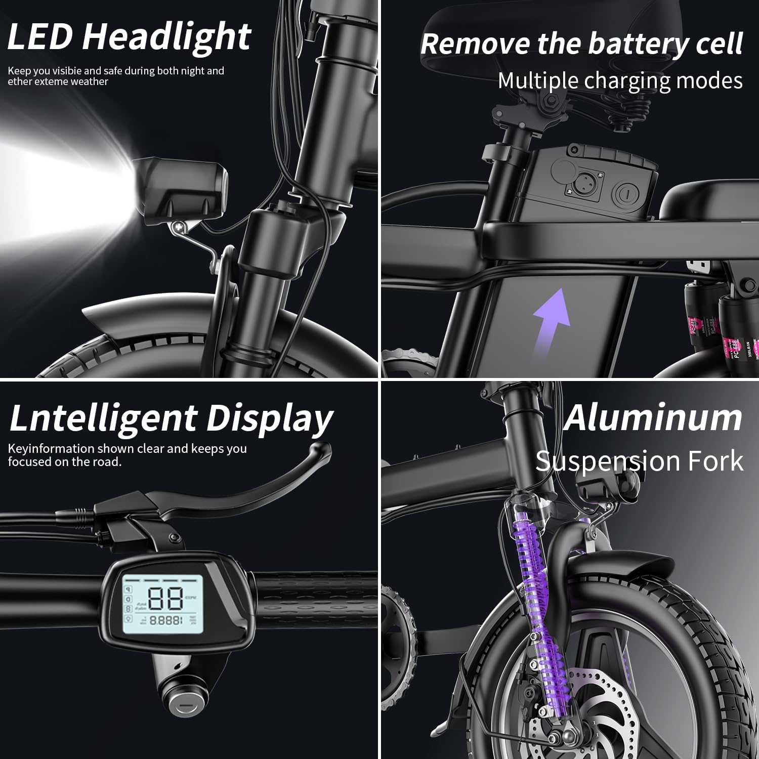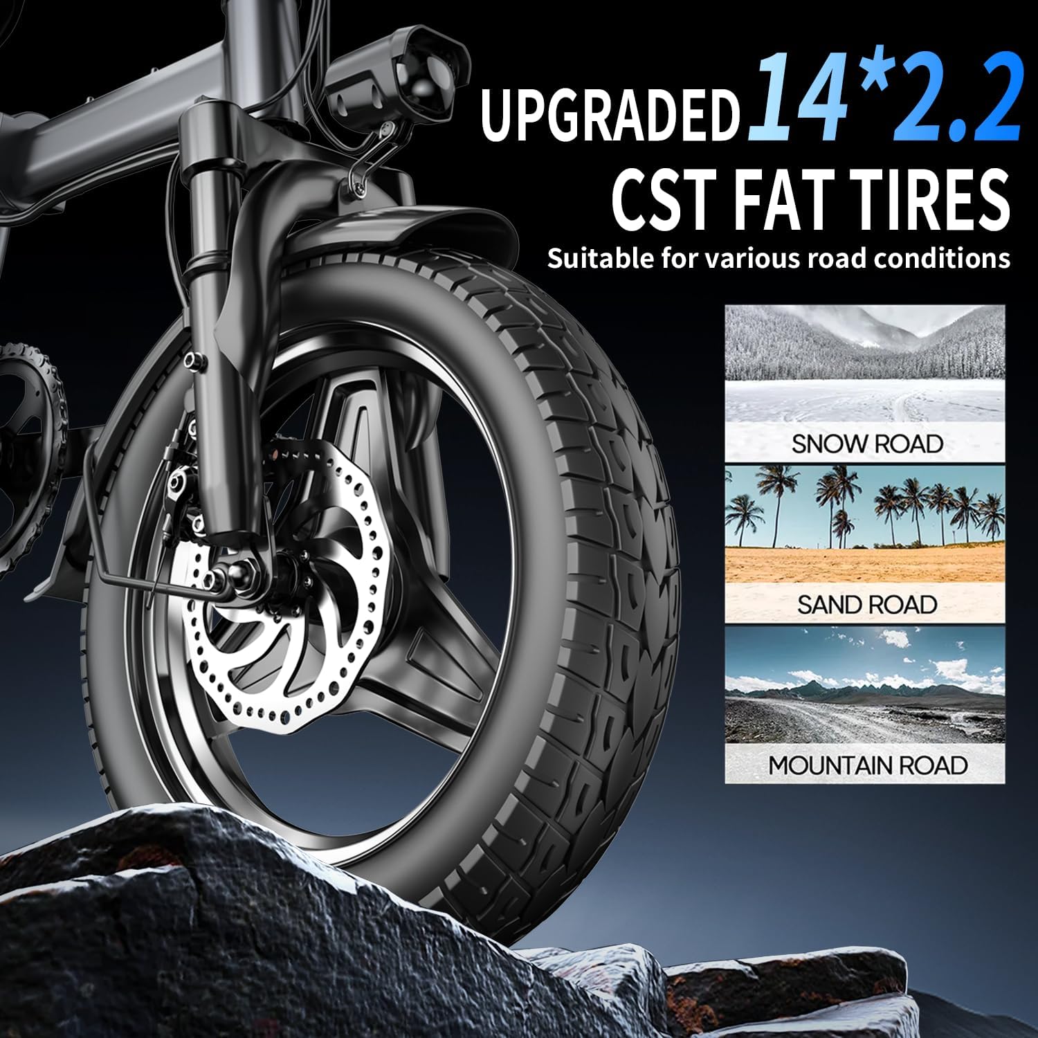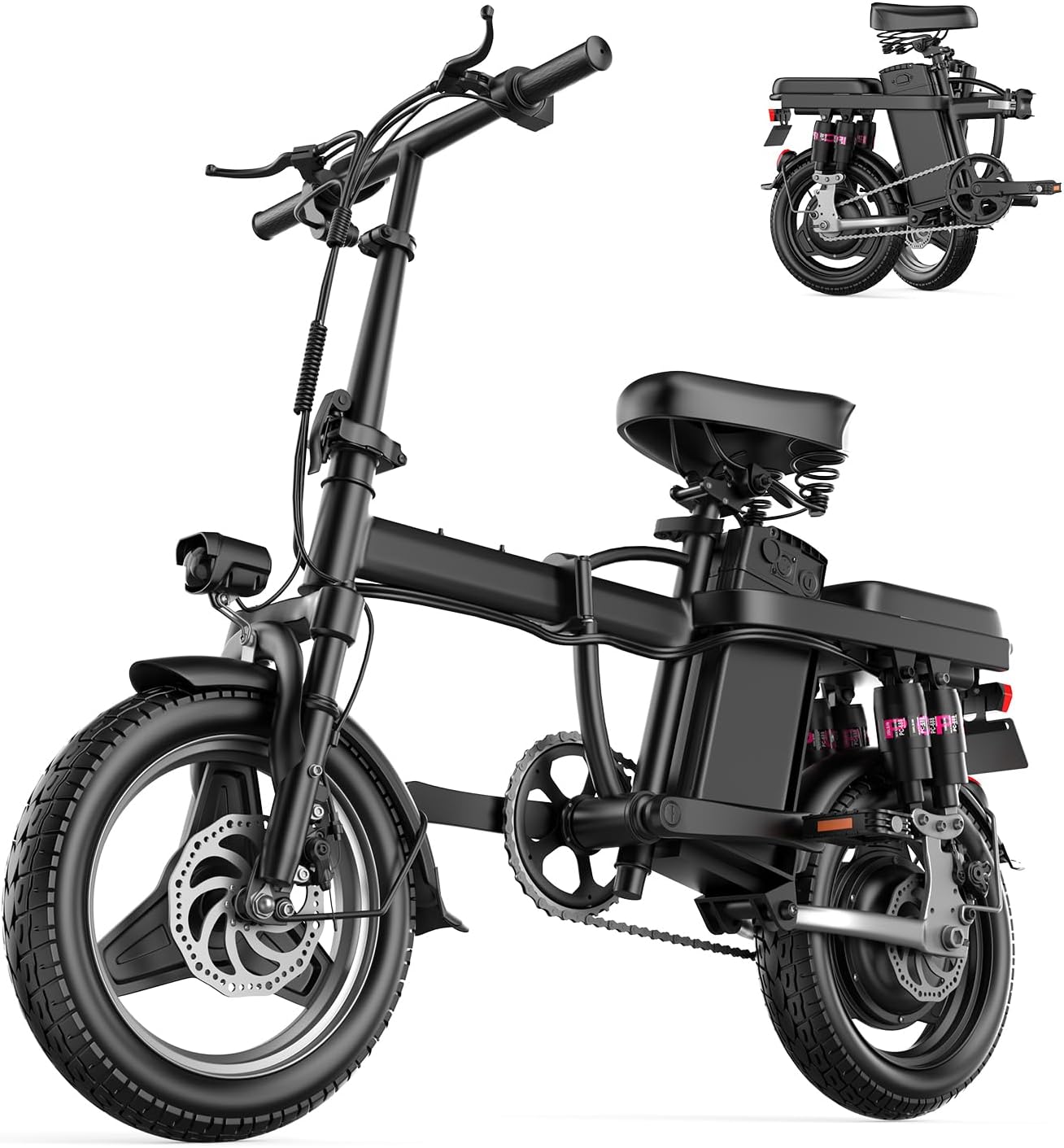 - __omfortable Riding Experience__he 14' pneumatic tires adult electric bike adopts multiple shock absorption systems and dual braking systems. We could enjoy a smooth, comfortable ride even on bumpy road.
