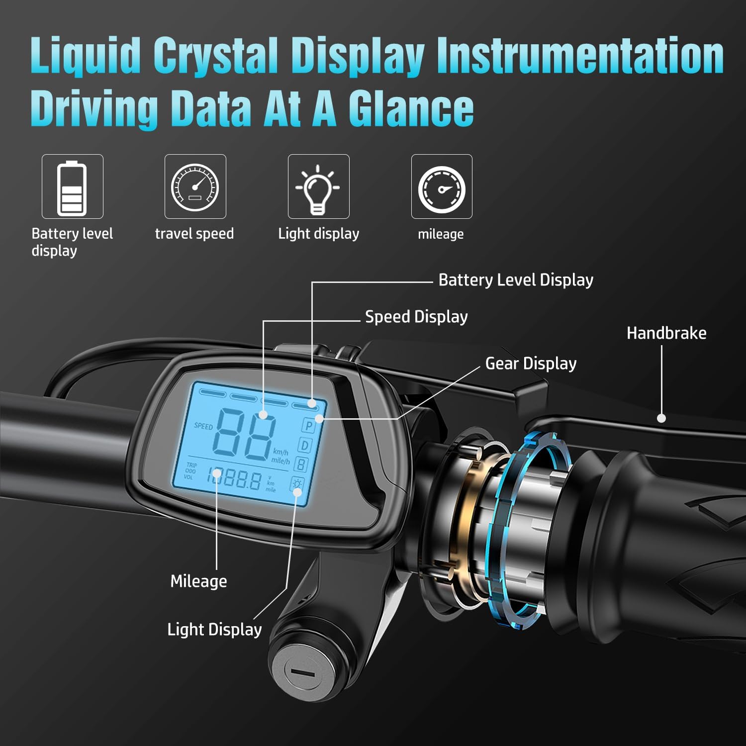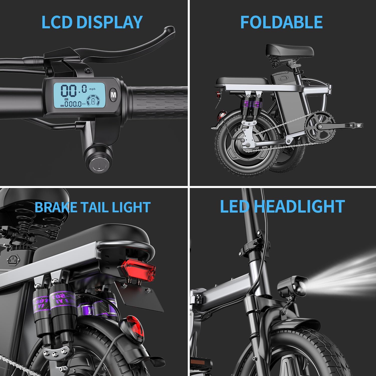 - __afe and Reliable__he folding electric bicycle is equipped with a high-brightness front light and a safety warning tail light to improve the safety of night riding. The perfect front and rear double brake system allows the ride to stop at any time.