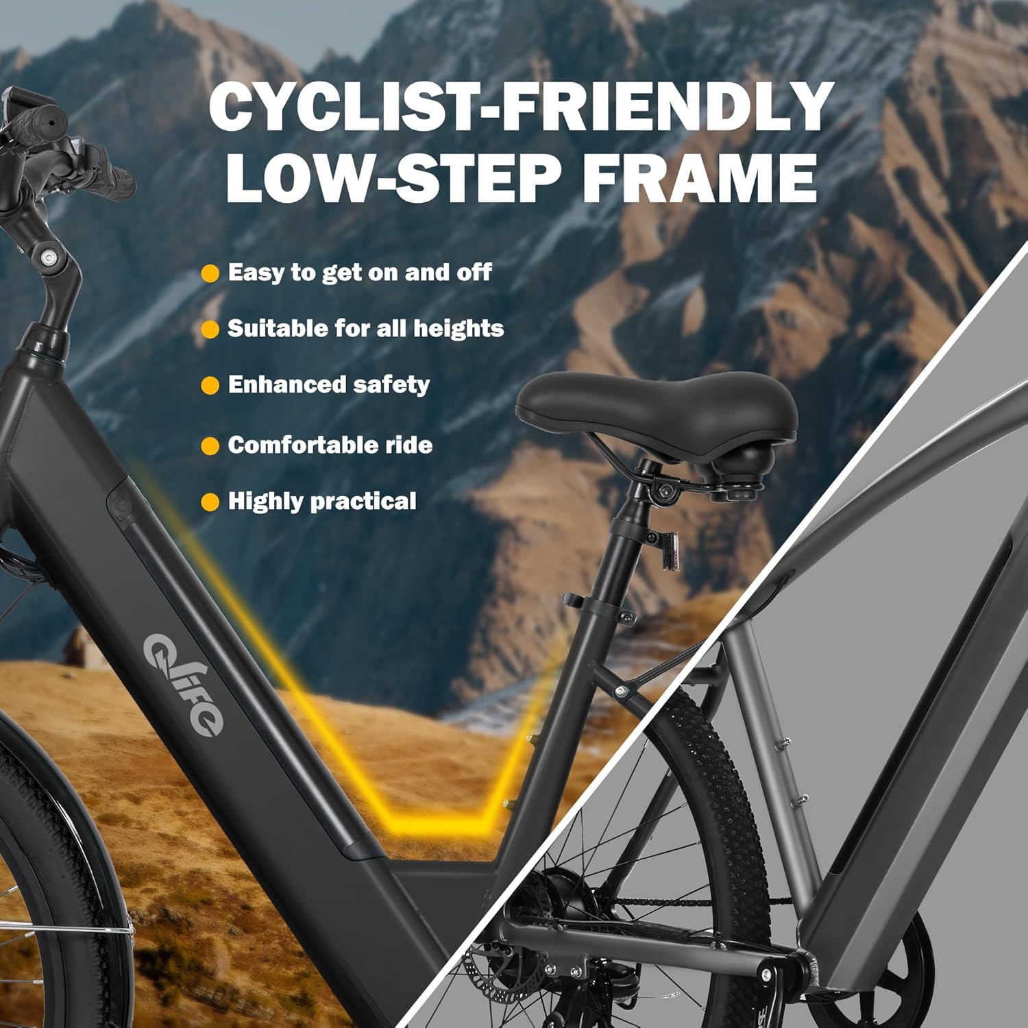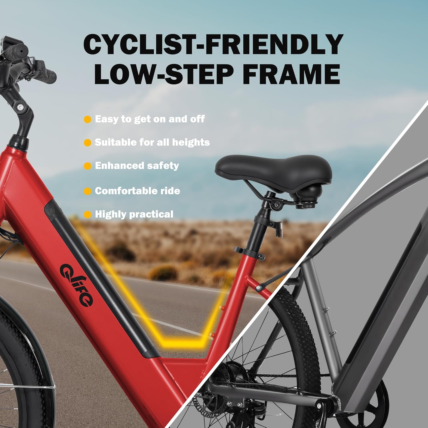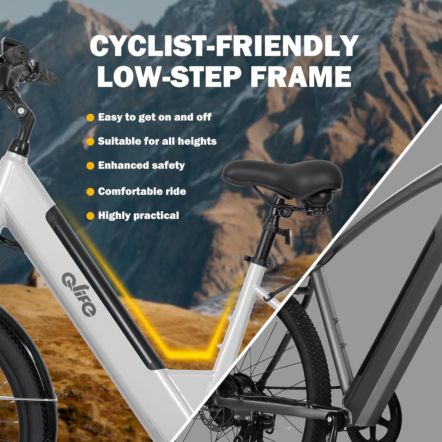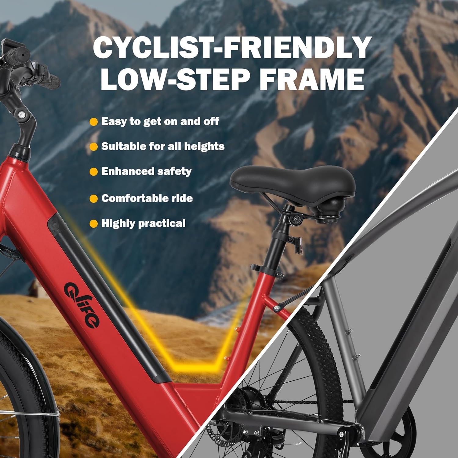 - __ow-Step design__he unique step through frame design of the electric bicycle makes it easy for riders of any height to get on and off the bike. The ergonomically designed wide and comfortable seat and upright riding posture reduce riding fatigue and are suitable for long-term use.