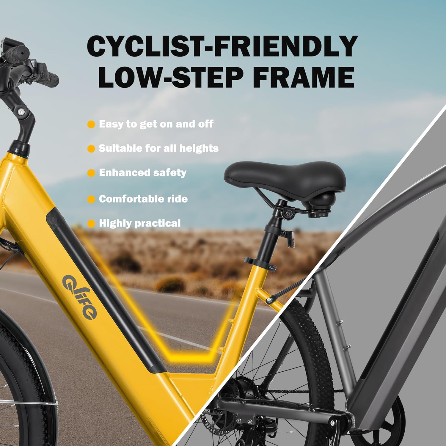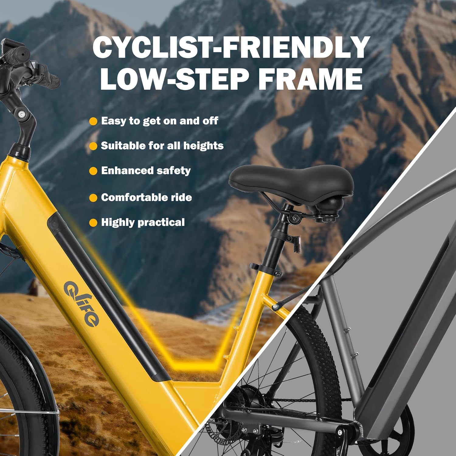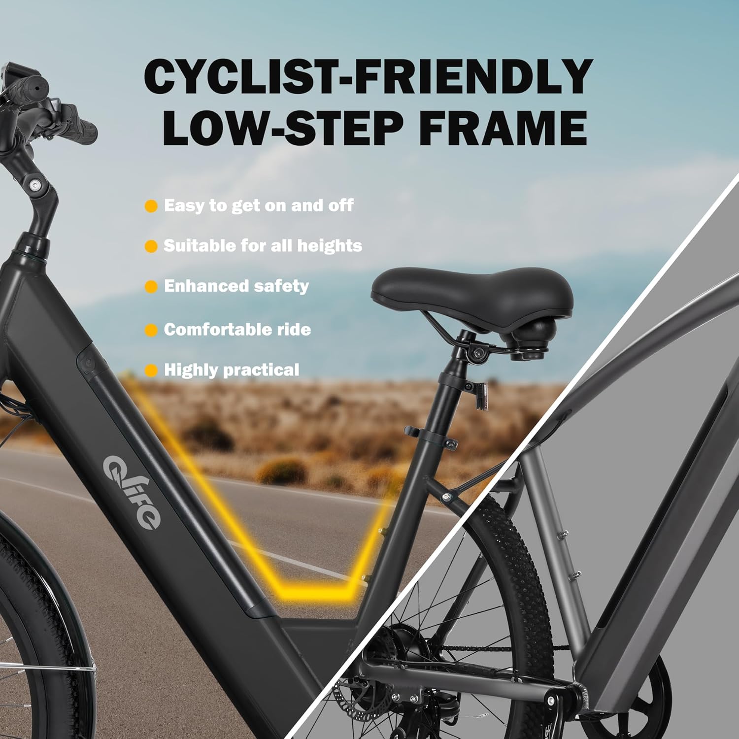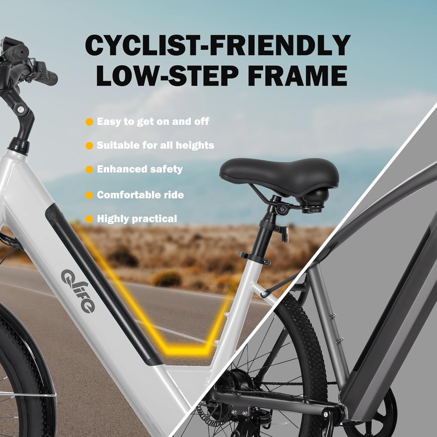 - __ow-Step design__he unique step through frame design of the electric bicycle makes it easy for riders of any height to get on and off the bike. The ergonomically designed wide and comfortable seat and upright riding posture reduce riding fatigue and are suitable for long-term use.