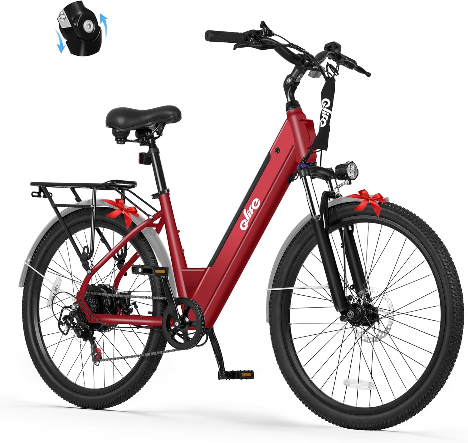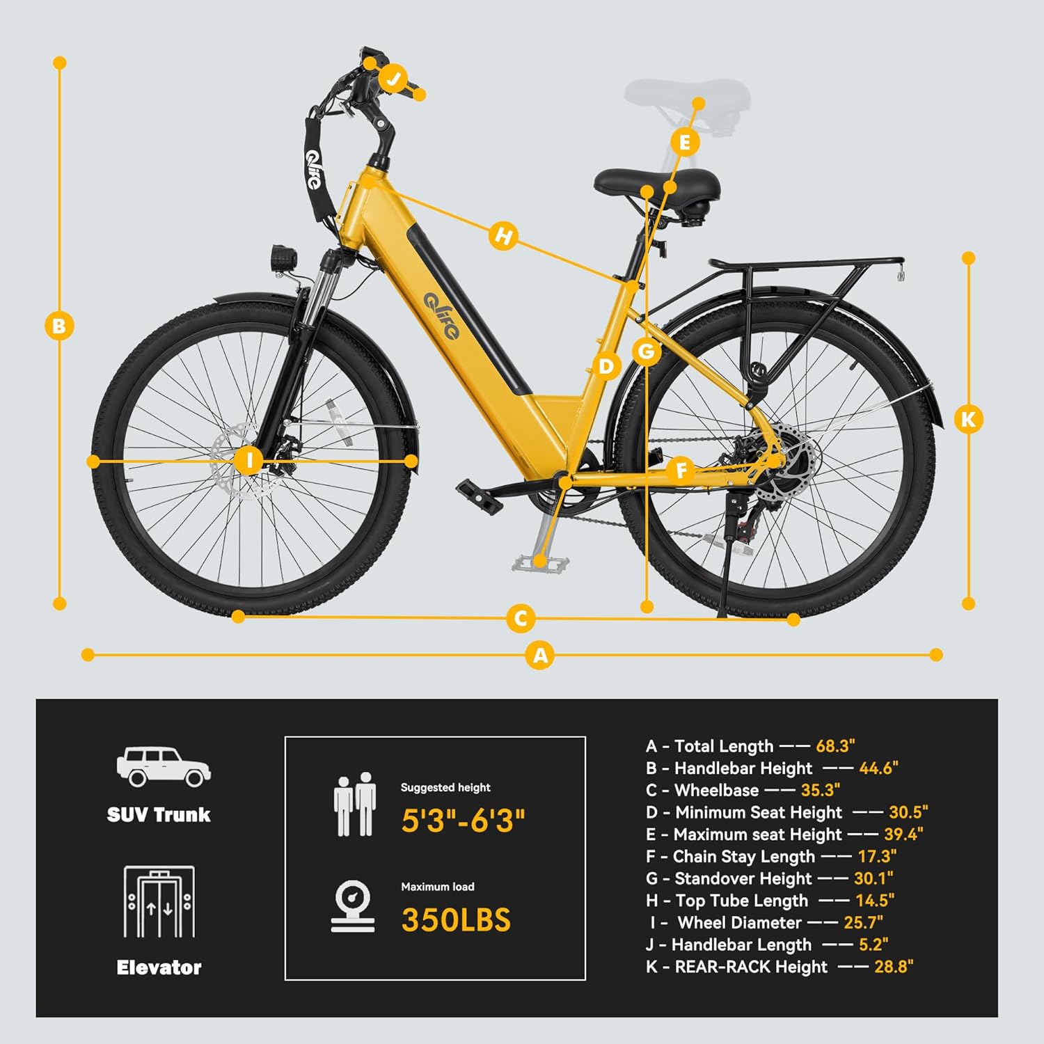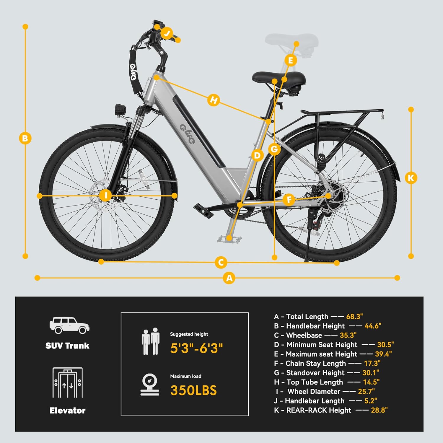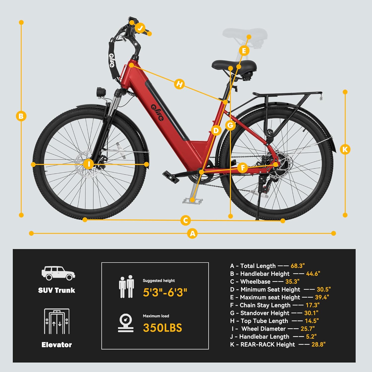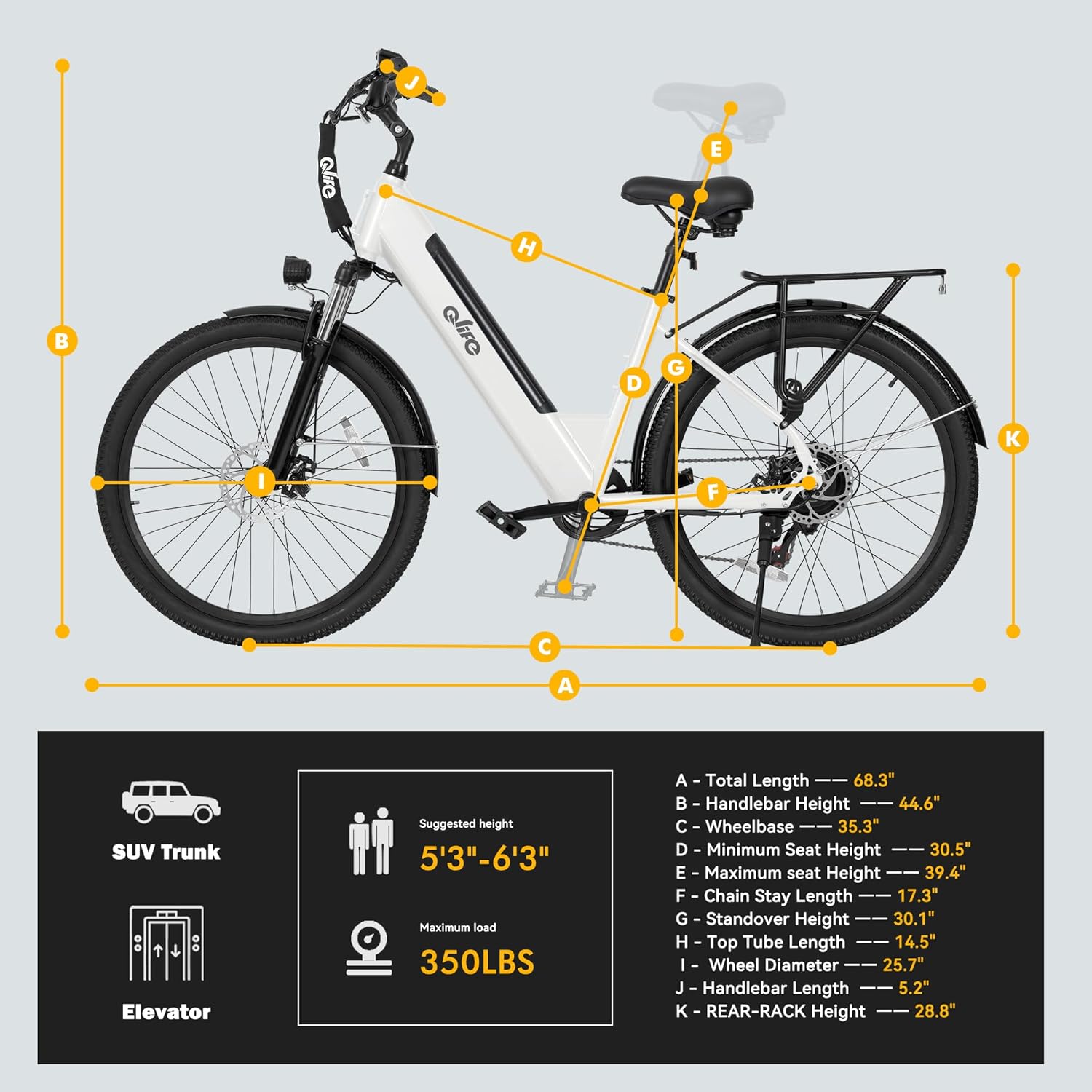 - __ow-Step design__he unique step through frame design of the electric bicycle makes it easy for riders of any height to get on and off the bike. The ergonomically designed wide and comfortable seat and upright riding posture reduce riding fatigue and are suitable for long-term use.