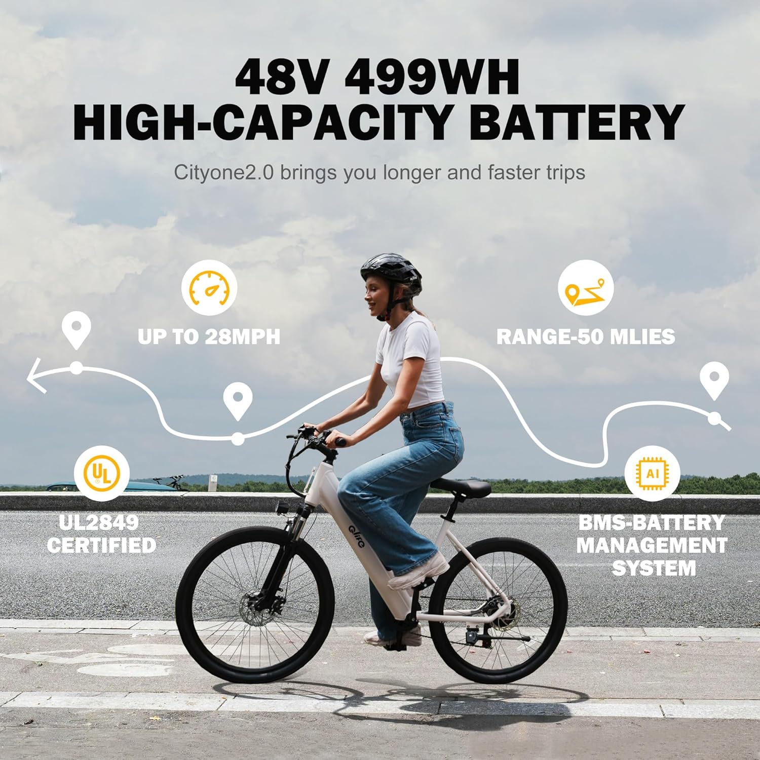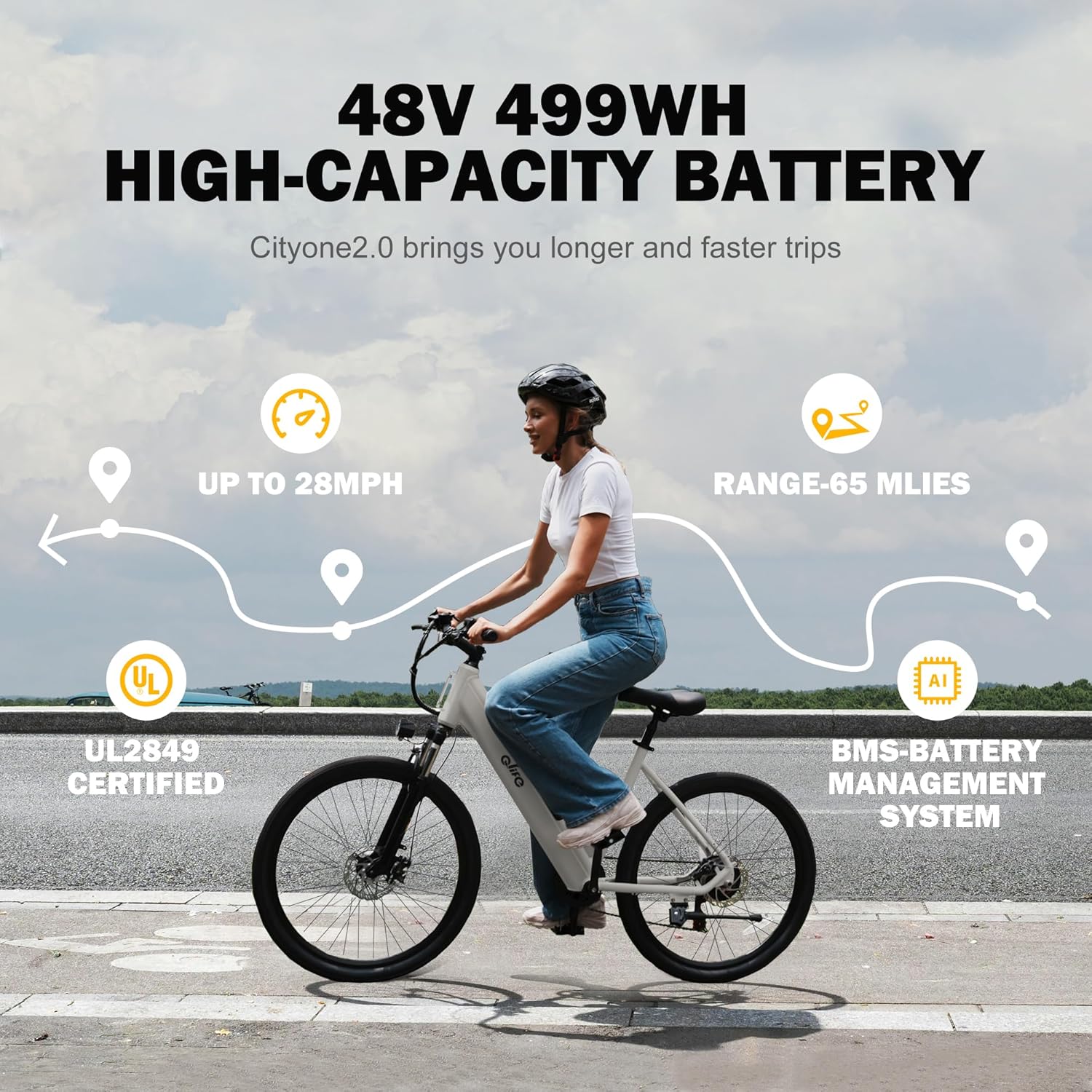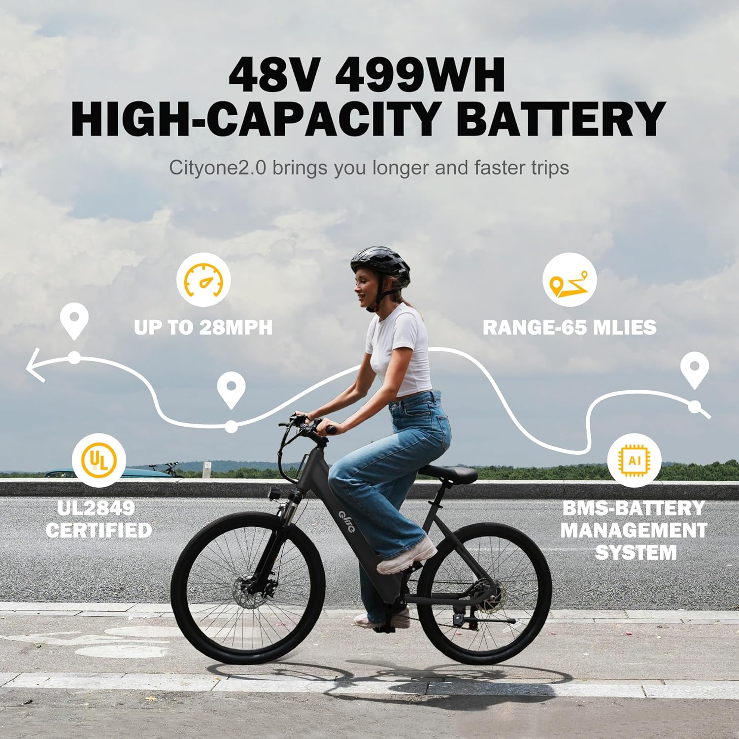 - _48V 499WH Battery & 65 Miles Range__he electric bike is equipped with a 48V 499Wh lithium battery design that can support up to 65 miles of travel on a single charge, allowing you to enjoy long-distance riding. The commute ebike built-in battery design is durable, shockproof, dustproof, and waterproof (IPX5), adapting to a variety of road conditions and weather conditions.