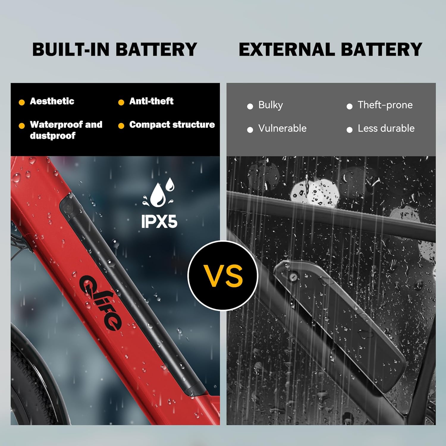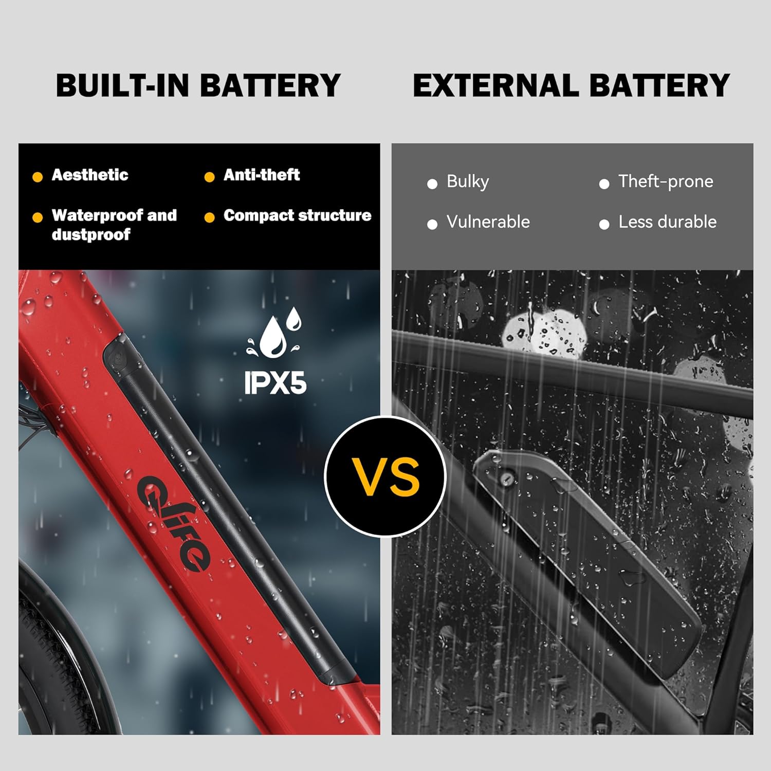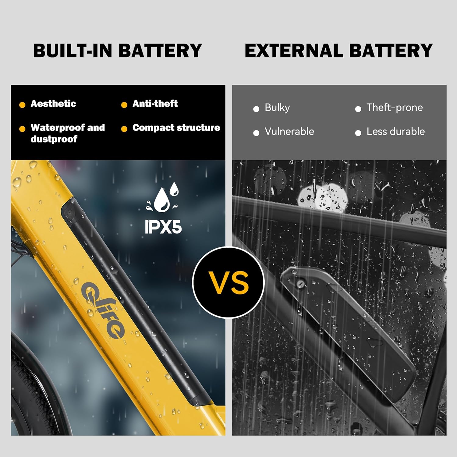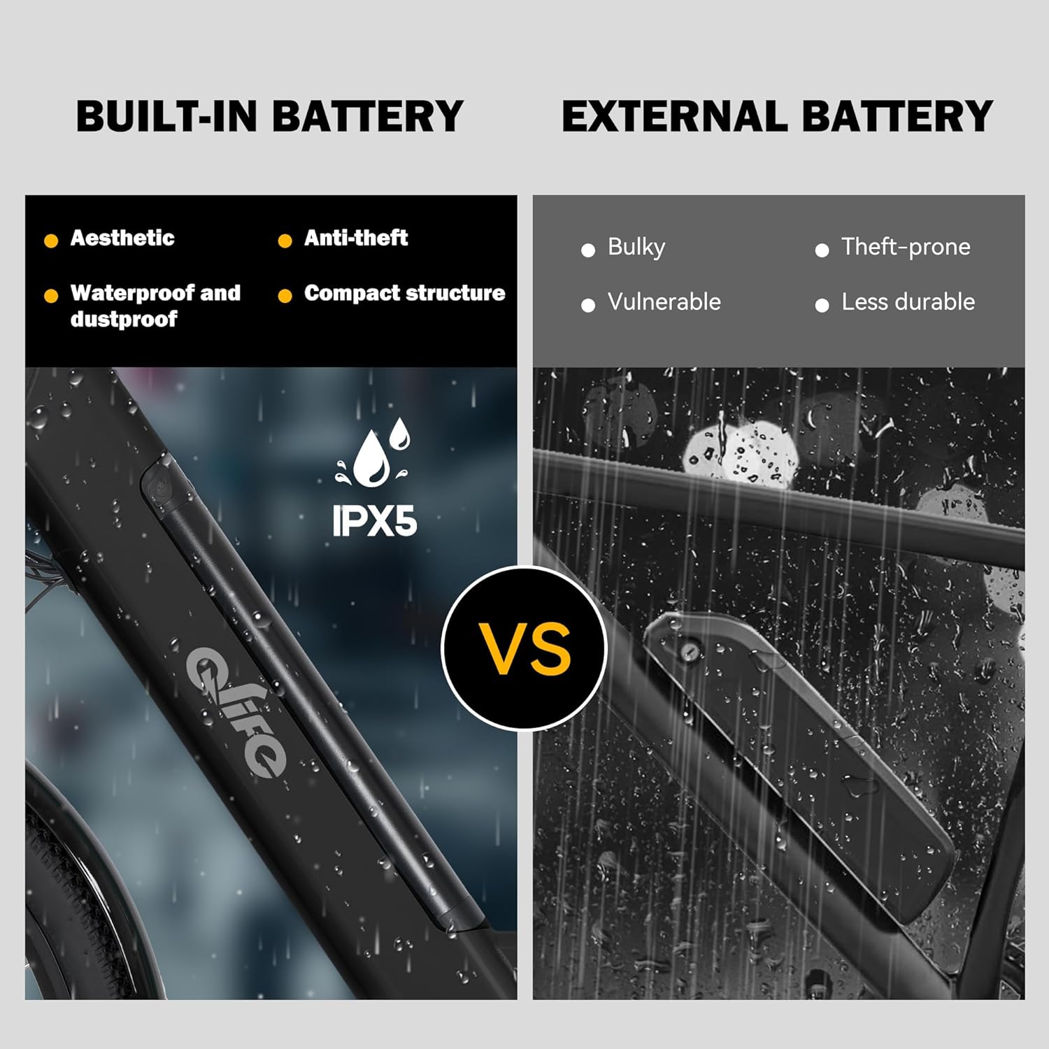 - _48V 499WH Battery & 65 Miles Range__he electric bike is equipped with a 48V 499Wh lithium battery design that can support up to 65 miles of travel on a single charge, allowing you to enjoy long-distance riding. The commute ebike built-in battery design is durable, shockproof, dustproof, and waterproof (IPX5), adapting to a variety of road conditions and weather conditions.