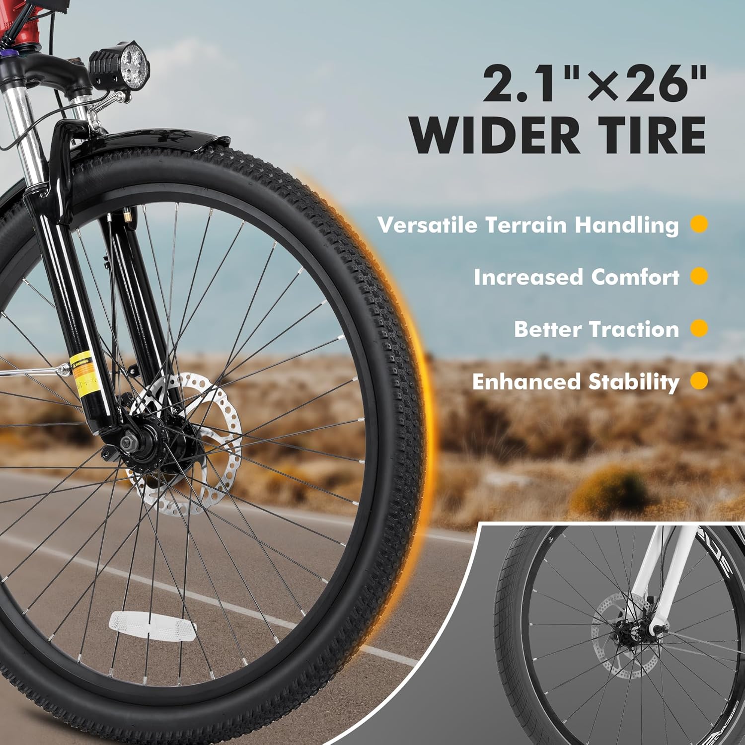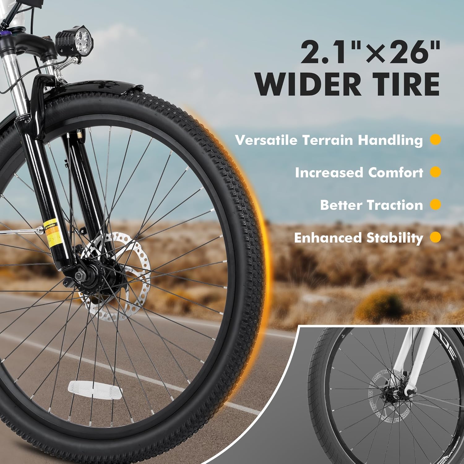- __ront fork suspension and 2.1' wide tire__quipped with a high-performance front fork shock absorption system and a wear-resistant, anti-skid 2.1'wide tire structure to increase grip and stability, significantly improve the riding experience, and reduce the impact of vibration on the arms and body , while enhancing vehicle controllability and safety.