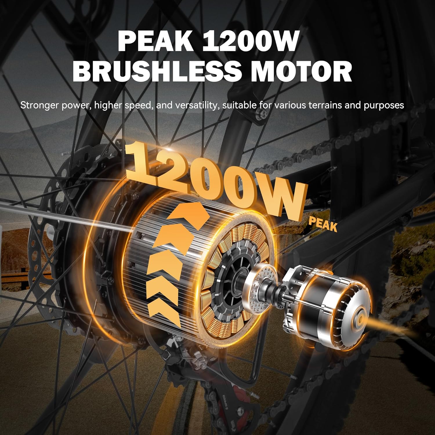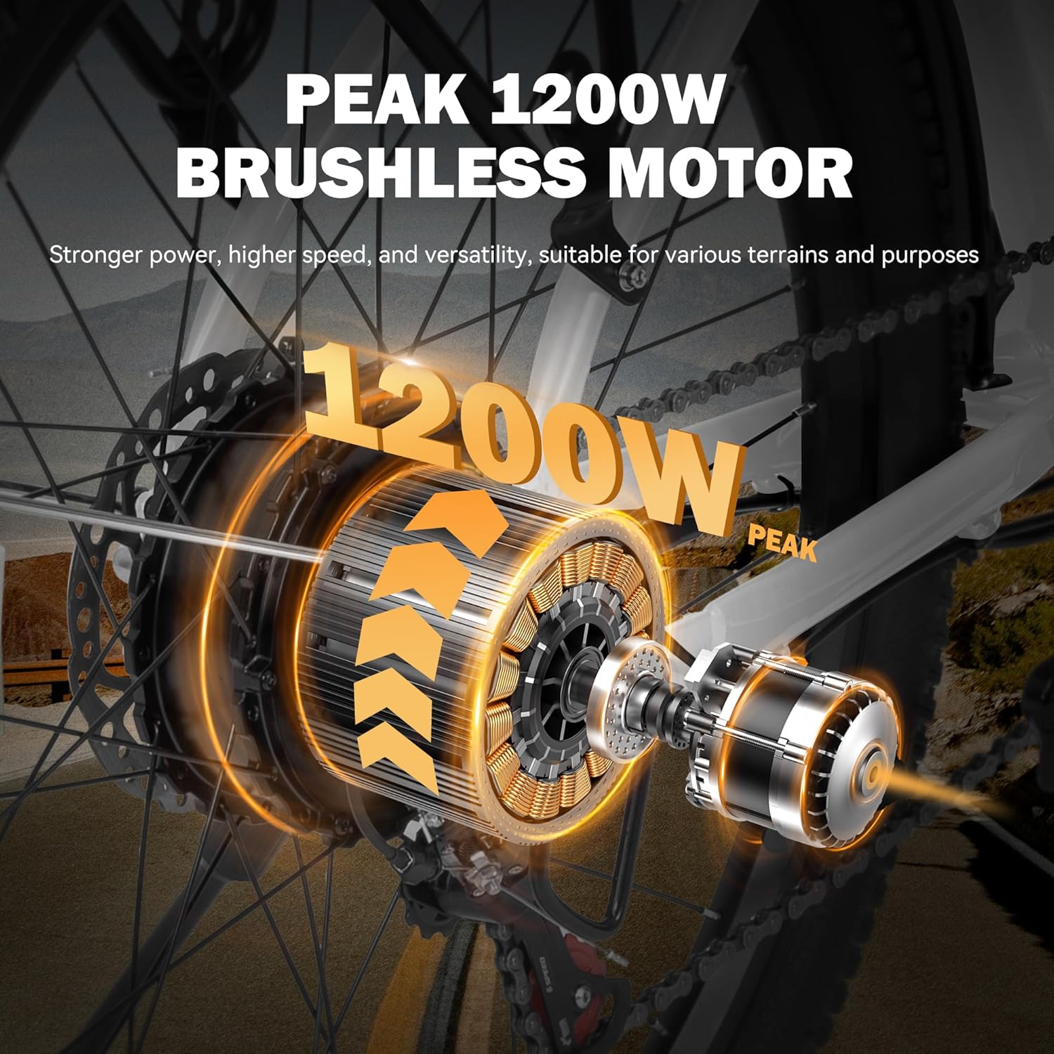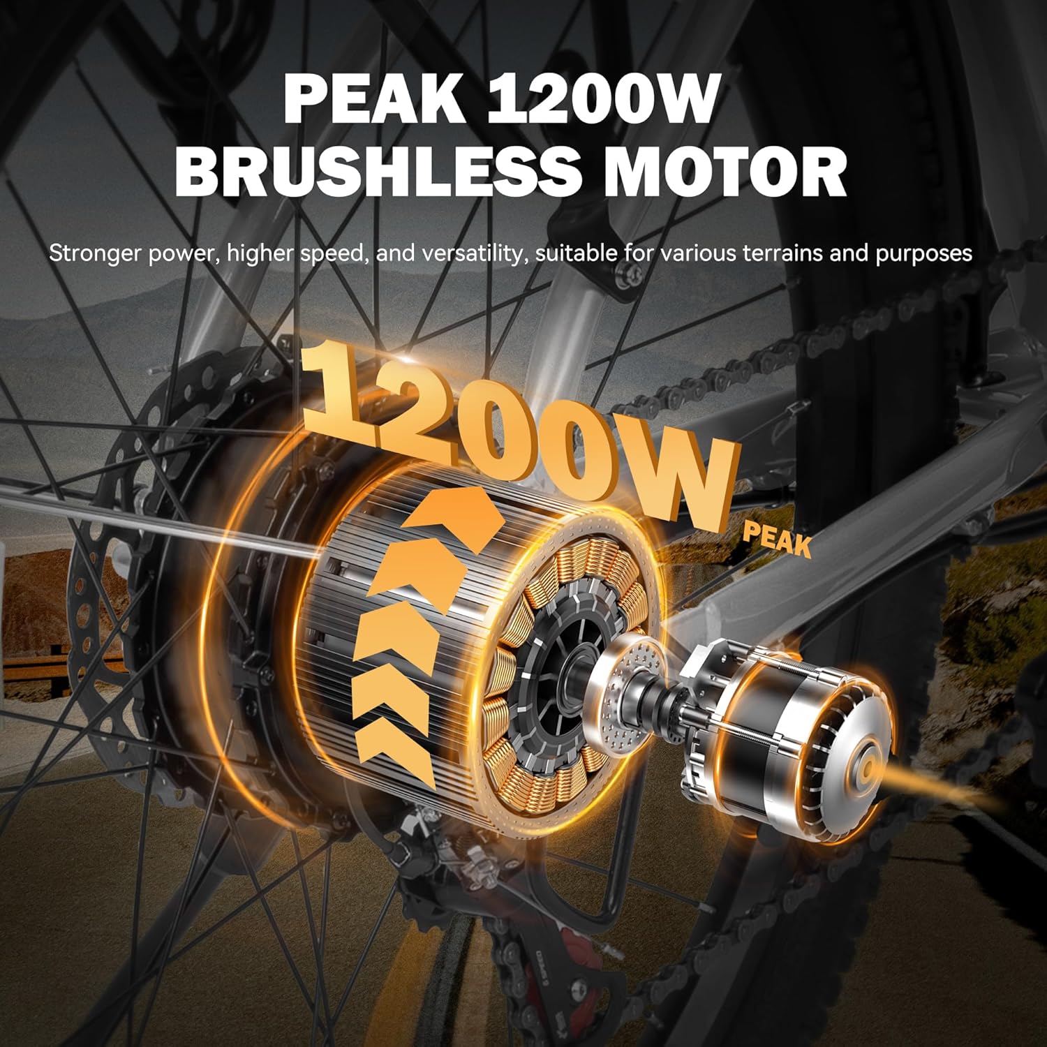 - __xplosive PEAK 1200W Motor__he electric bicycle with a peak 1200W powerful brushless motor supports a maximum speed of 28MPH, combining powerful performance with long battery life, while improving commuting efficiency, saving valuable time, and making cycling more economical and environmentally friendly.