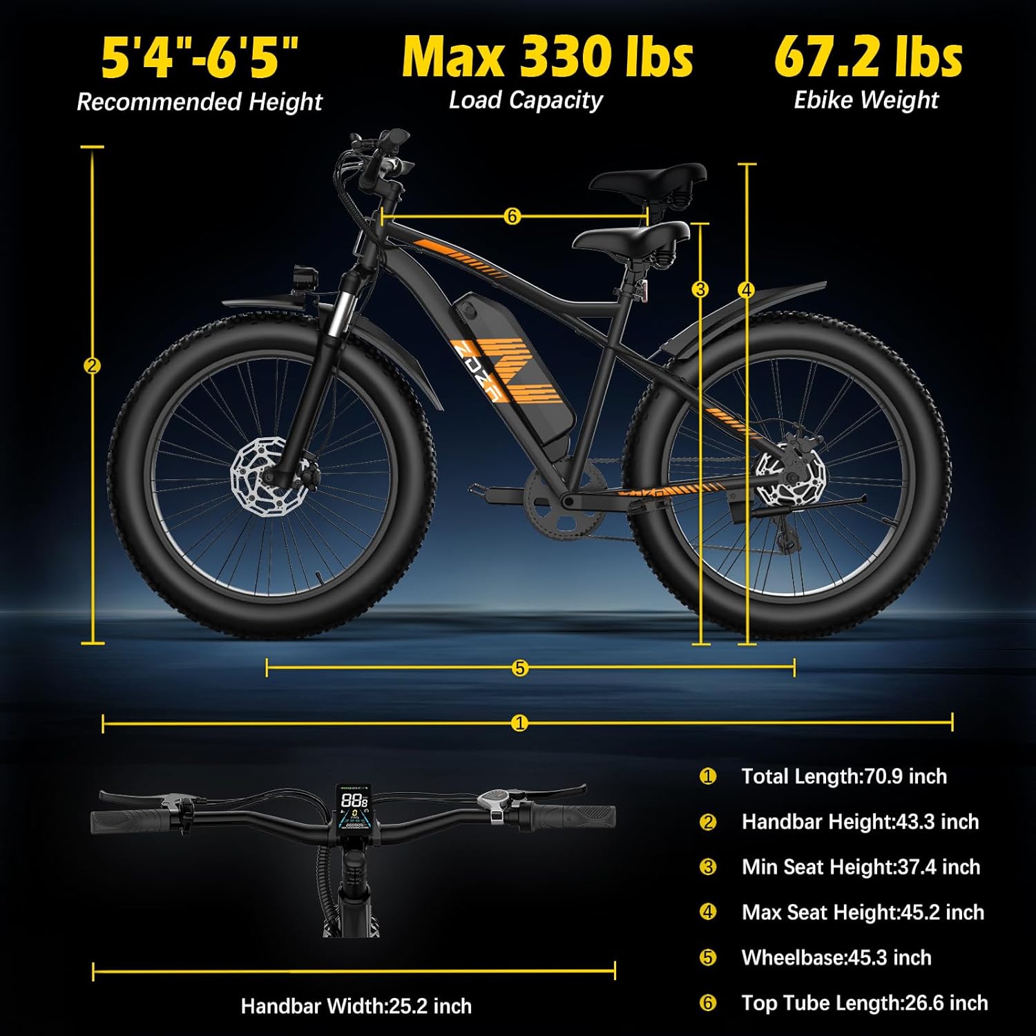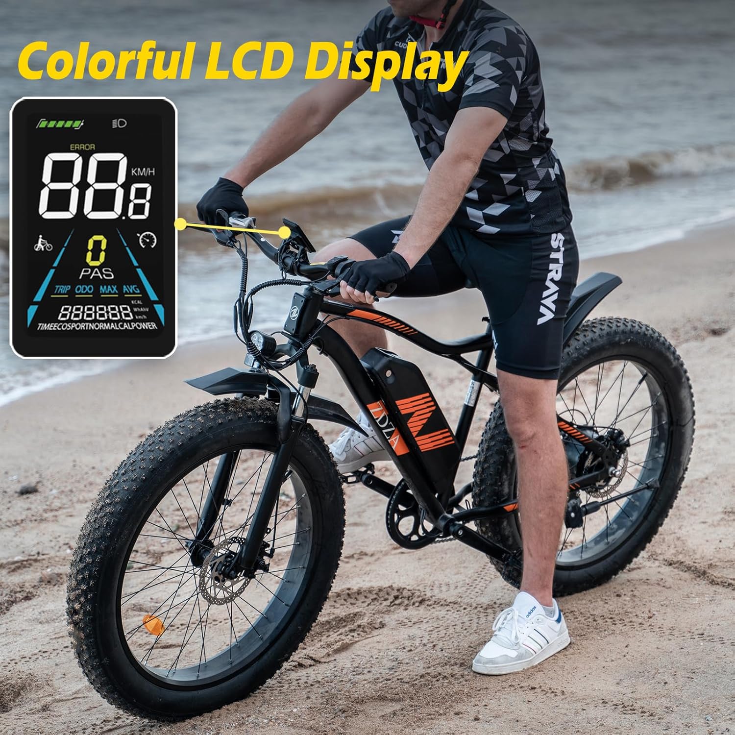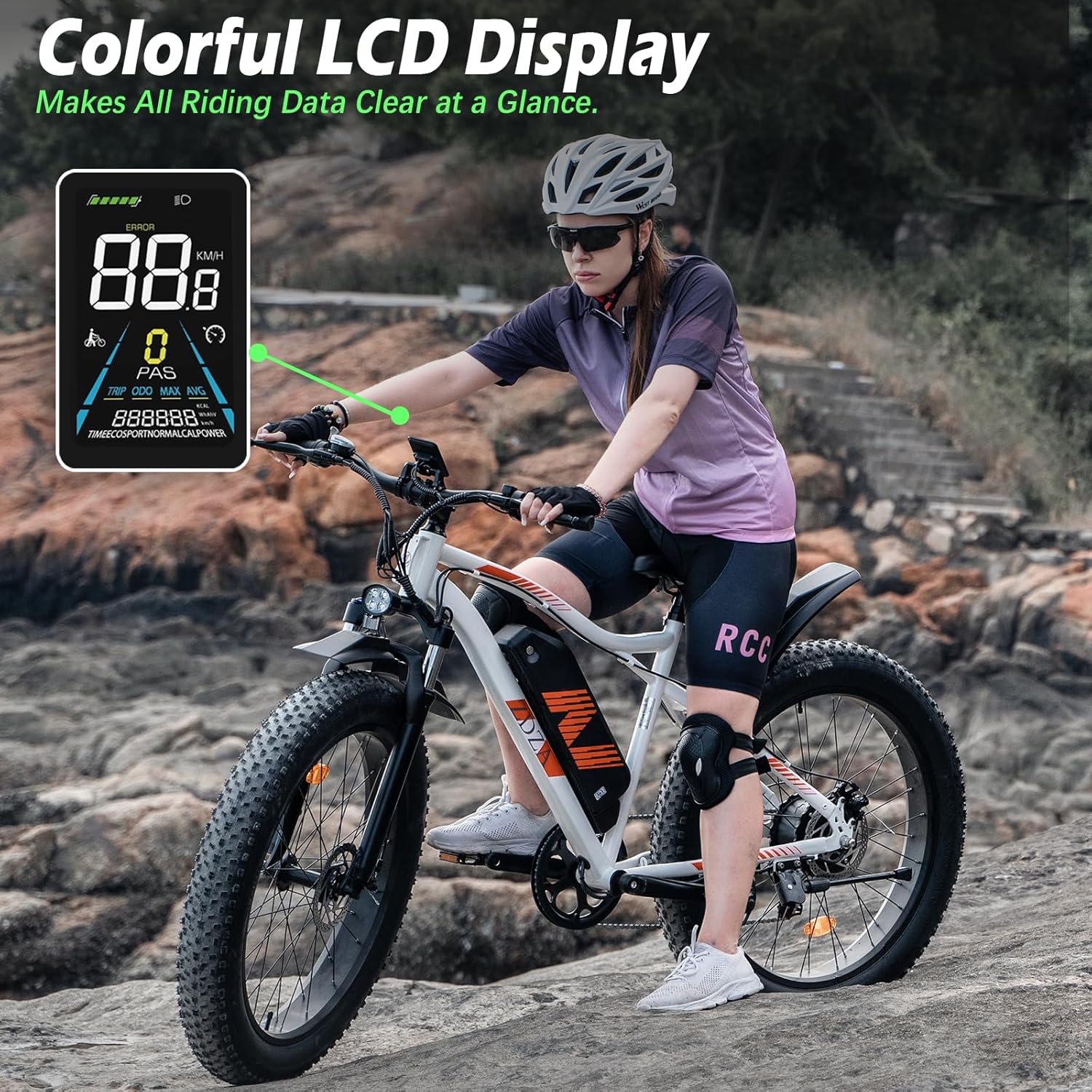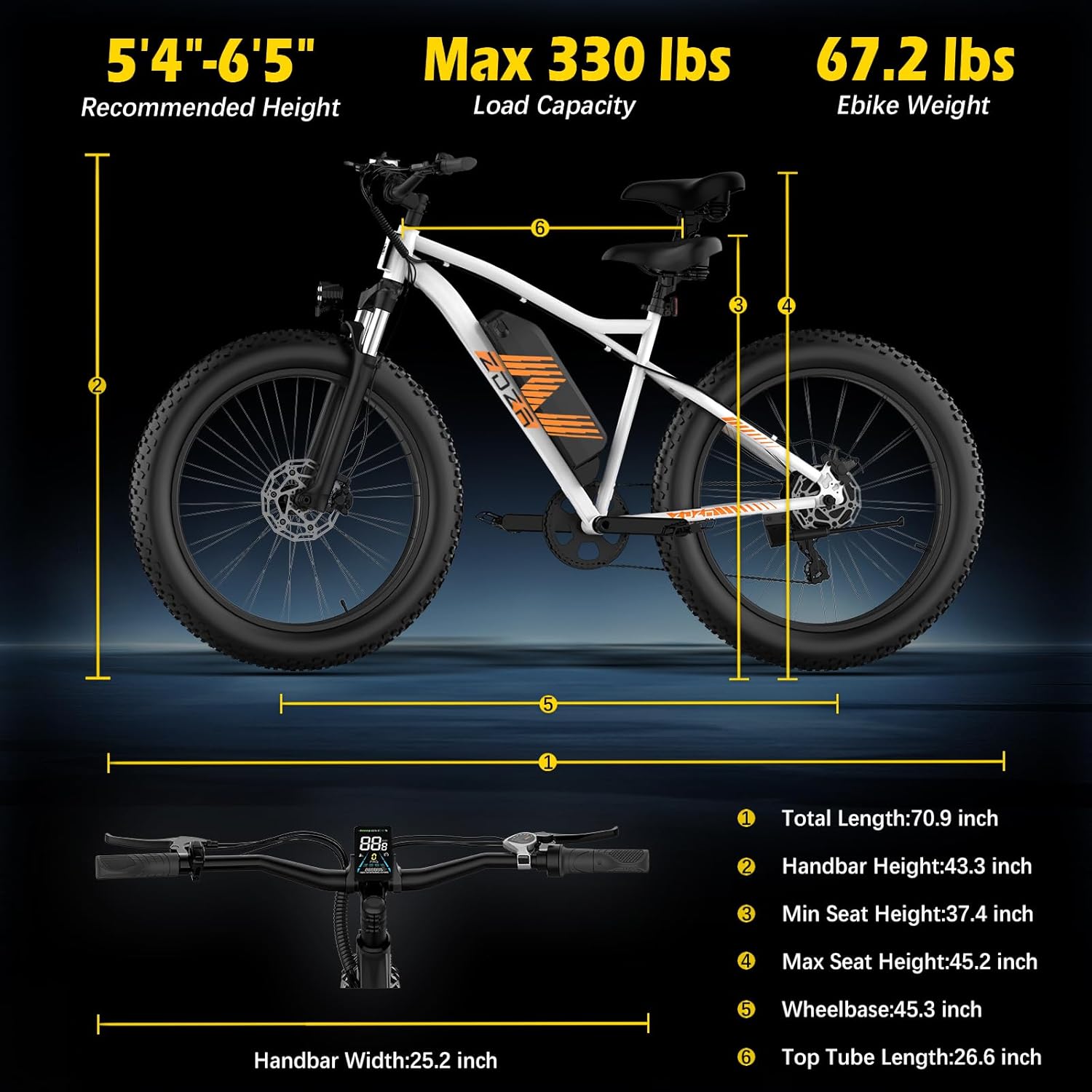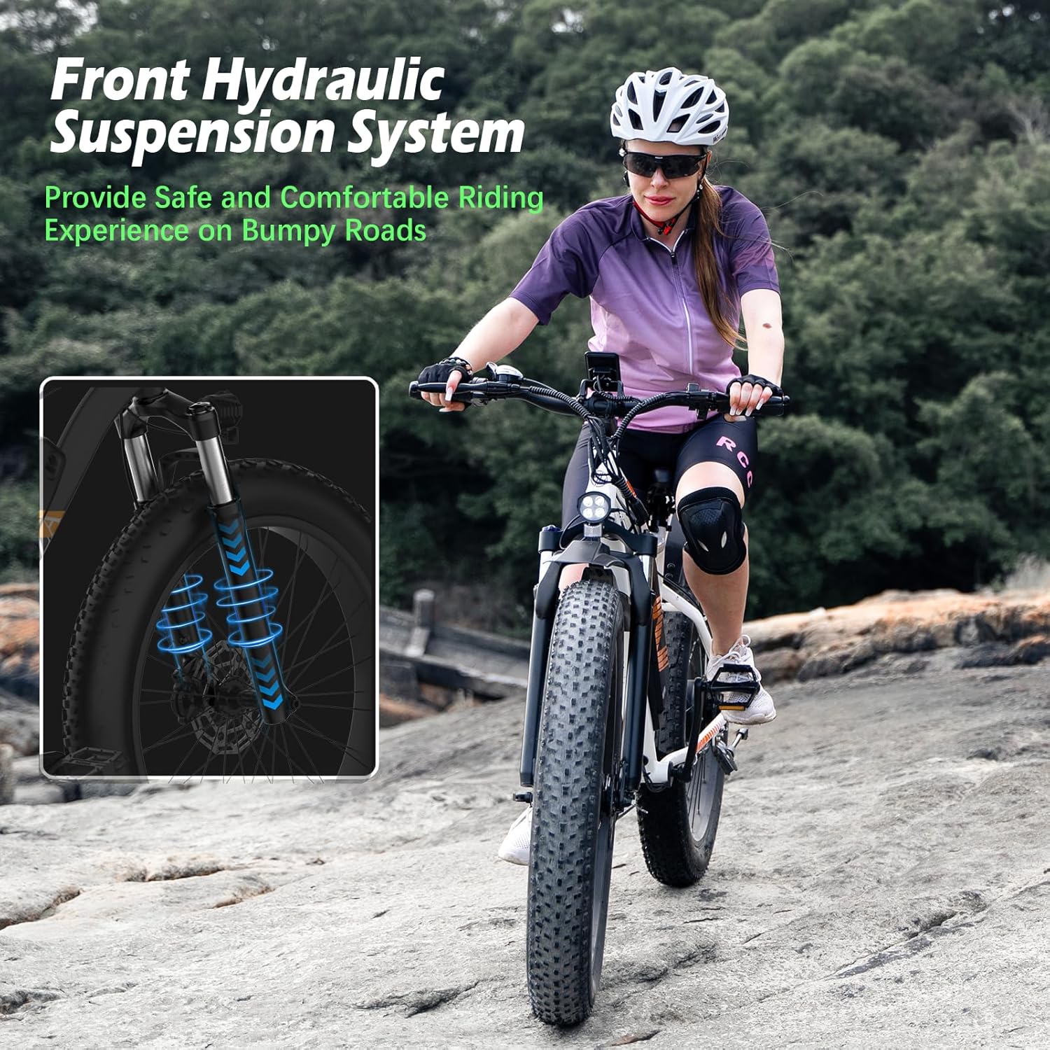 - [______________________ ______ ____________ ________] - ZA01 electric mountain bike has 26'x4.0' fat tires and dual lockable front suspension, which make you can enjoy smooth and comfortable riding experience whether you ride the electric bicycle for daily commuting or outdoor adventure. The combination of the fat tires and front suspension absorb bumps well and conquer all sorts of terrains, including mountain roads, snow roads, beach roads, rocky roads, and even urban jungles.