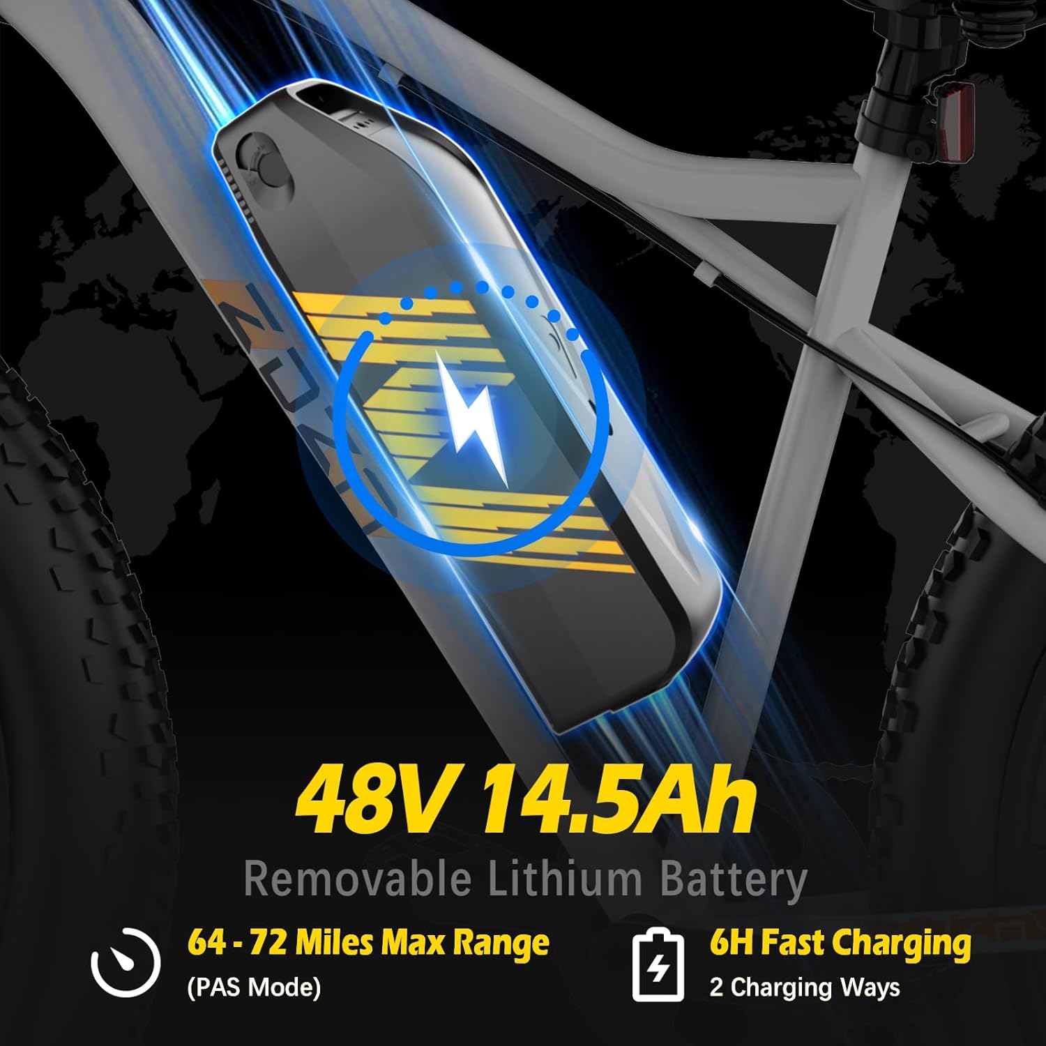 - [48__ 14.5____ __________________ ______________] - - ZA01 electric bike for adults has a 48V 14.5Ah rechargeable and removable lithium battery. It could guarantee a range of 40 miles in pure electric mode and 72 miles in PAS mode, so you don't need to worry about power.
