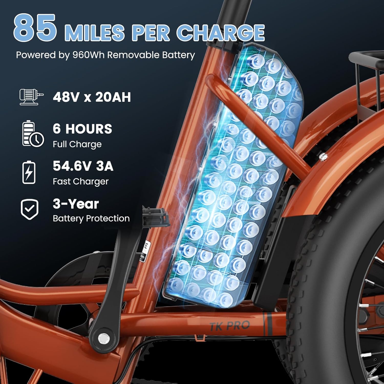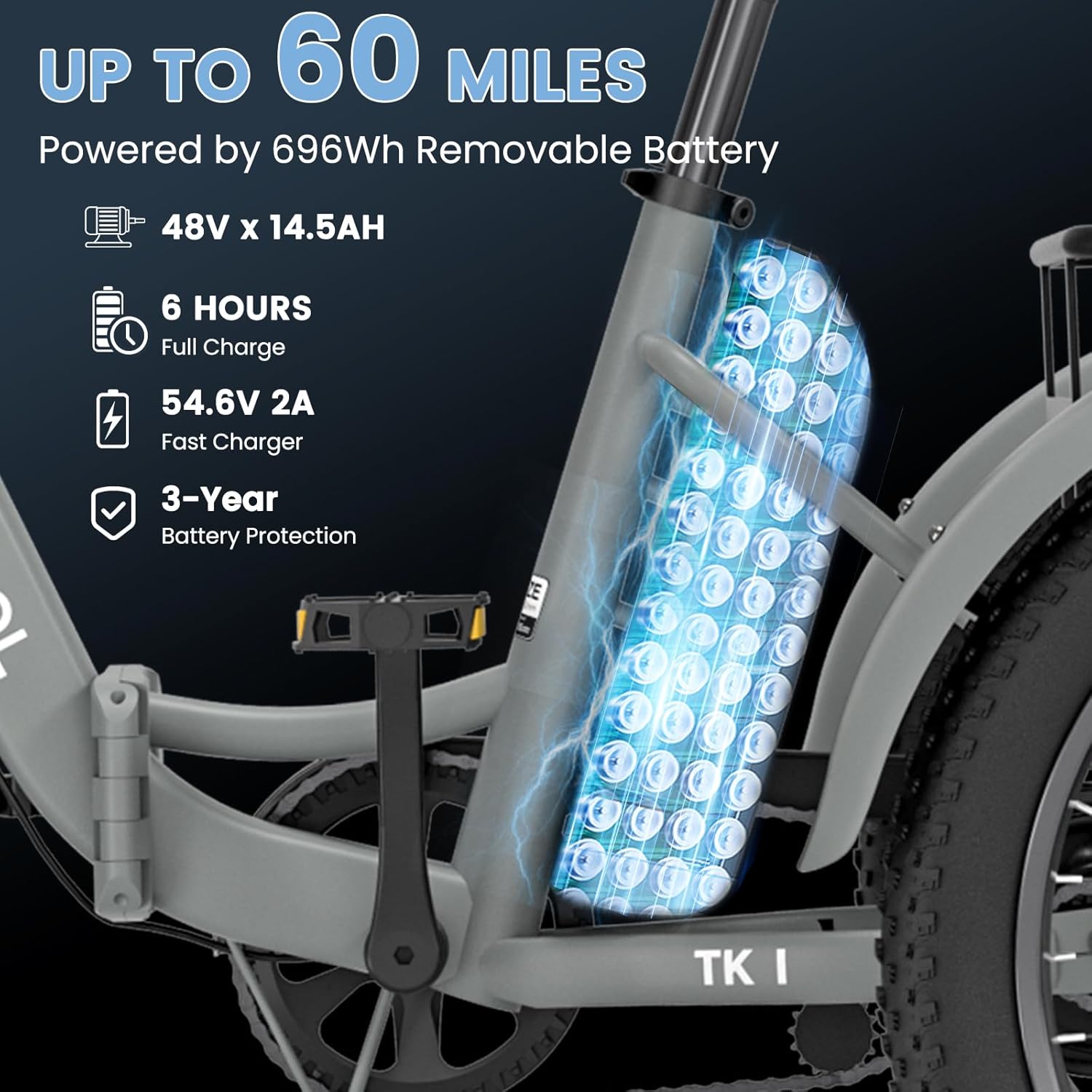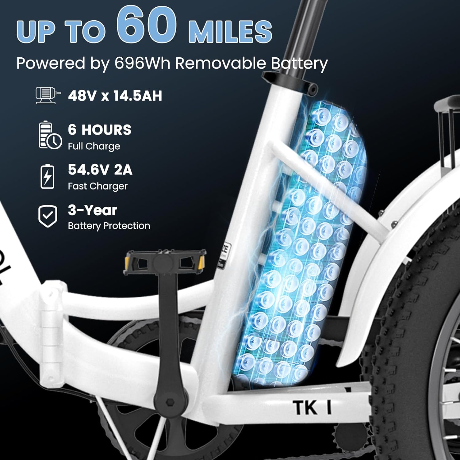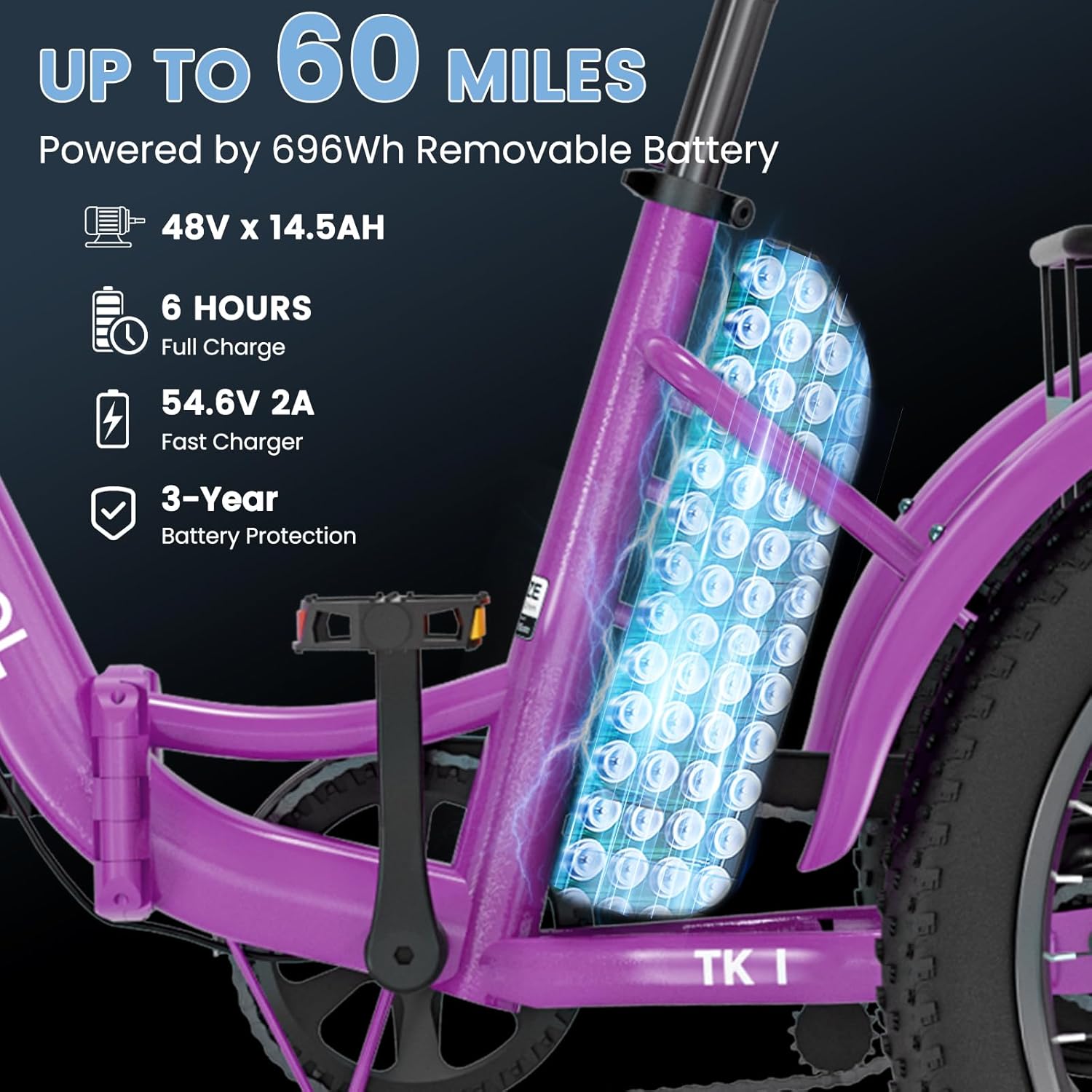 - Removable Battery Pack: Comes with a 48V 14.5Ah removable battery, covering a range of 35-45 miles per full charge., you'll experience extended riding time and the flexibility to charge on the go