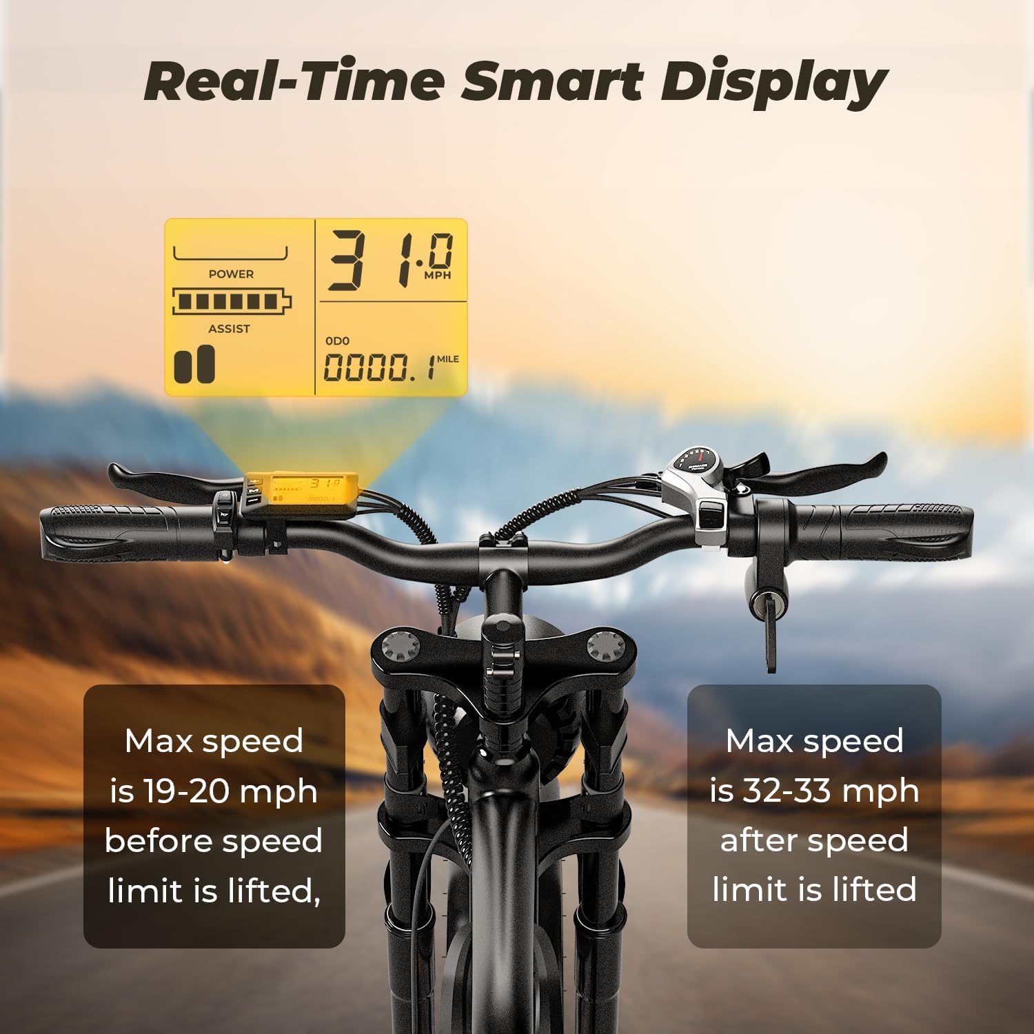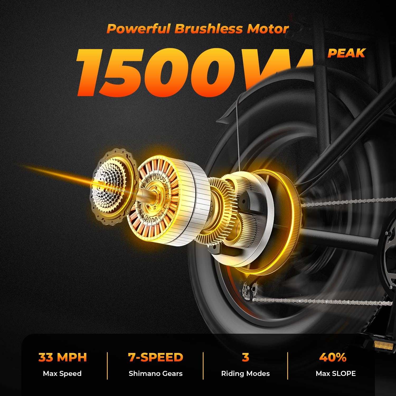 - __eak 1500W Motor & 7-Speed Gear System__he strong power brushless hub motor delivers impressive power, reaching speeds of up to 32-33 MPH in electric mode. Conquer inclines up to 35 degrees with ease. The 7-speed gear system offers smooth shifting, making it easy to adjust to different terrains. Brighter LED headlights and taillights ensure visibility and safety during nighttime rides.
