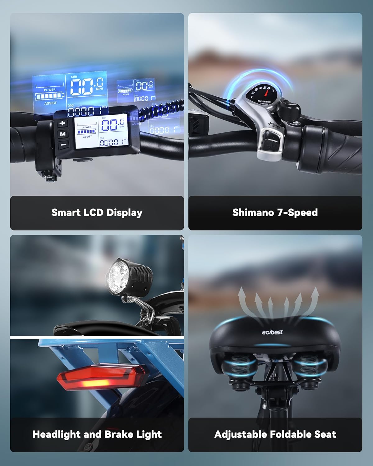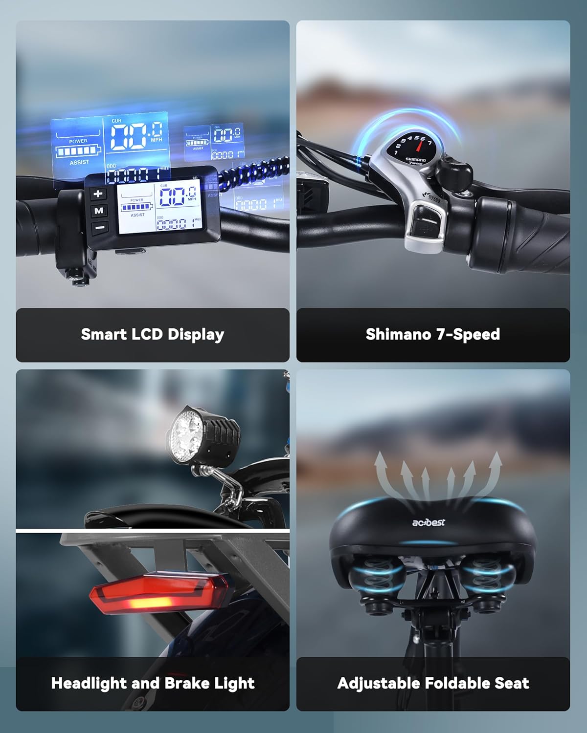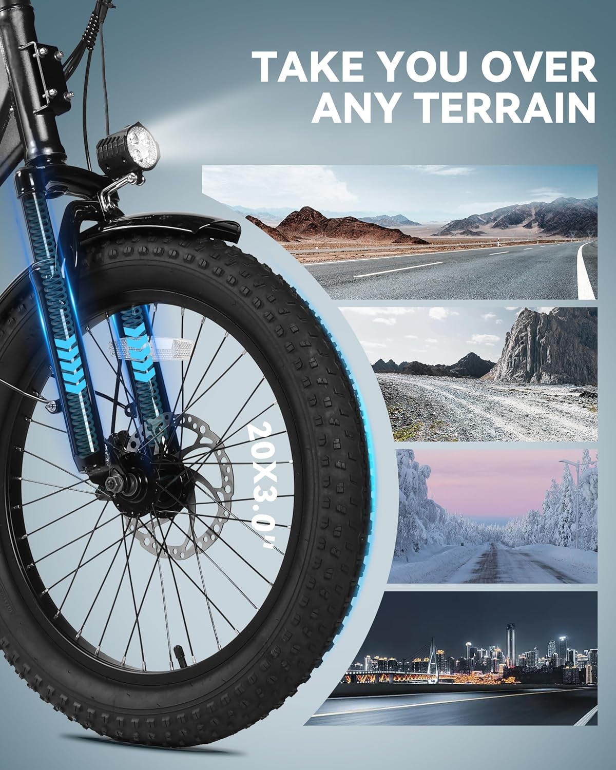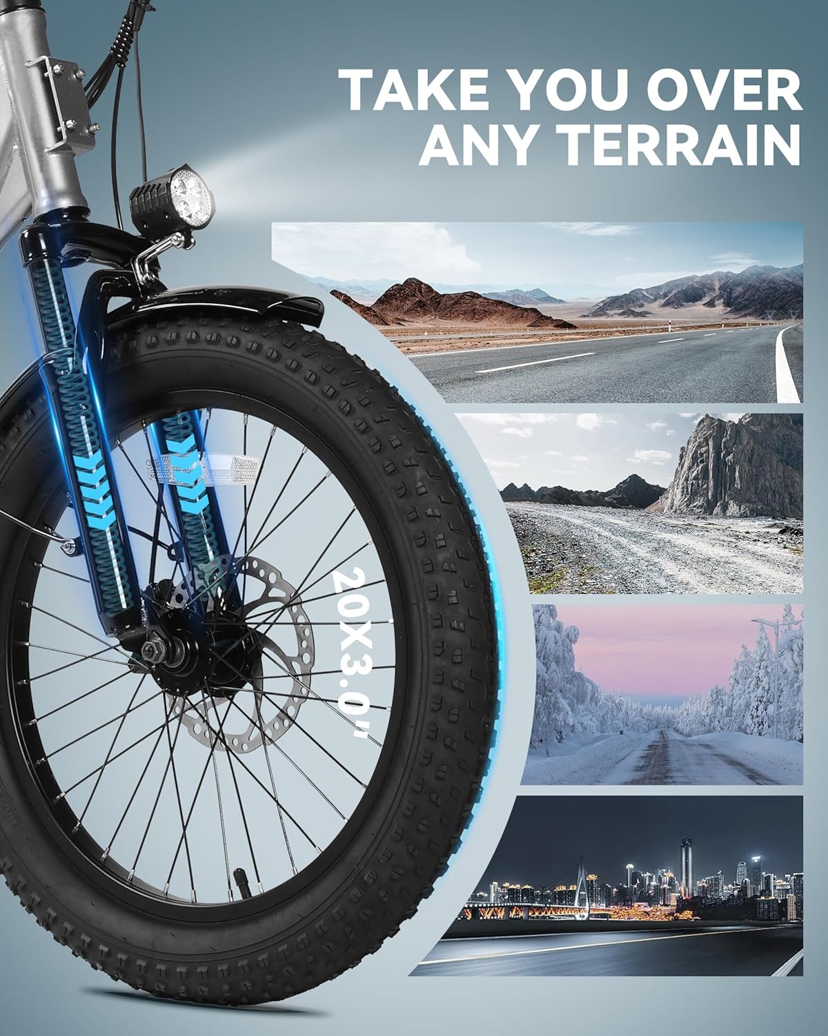 - __ider Tires and Smart Control_20X3.0_ all-terrain fat tires with dual front suspension system increase the contact area with the ground, effectively absorbs shocks and bumps. Brand new LCD display and 7-speed gear system allows you to view riding data in this ebike at anytime, smoothly switch between 3 modes. In addition, features like shock-absorbing seat, adjustable bike stem, brighter headlight and brake light, giving you a safer comfortable and freely customized riding journey