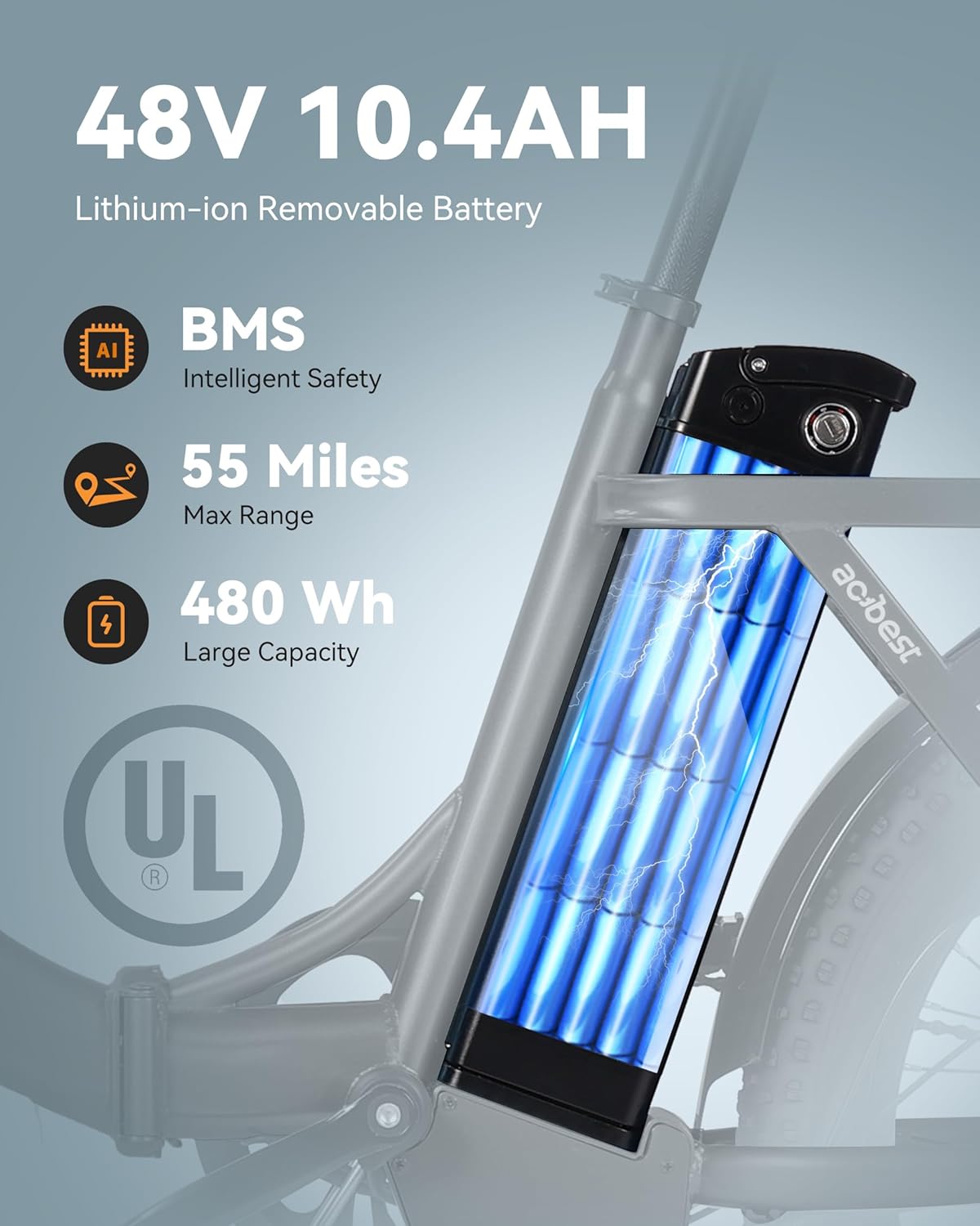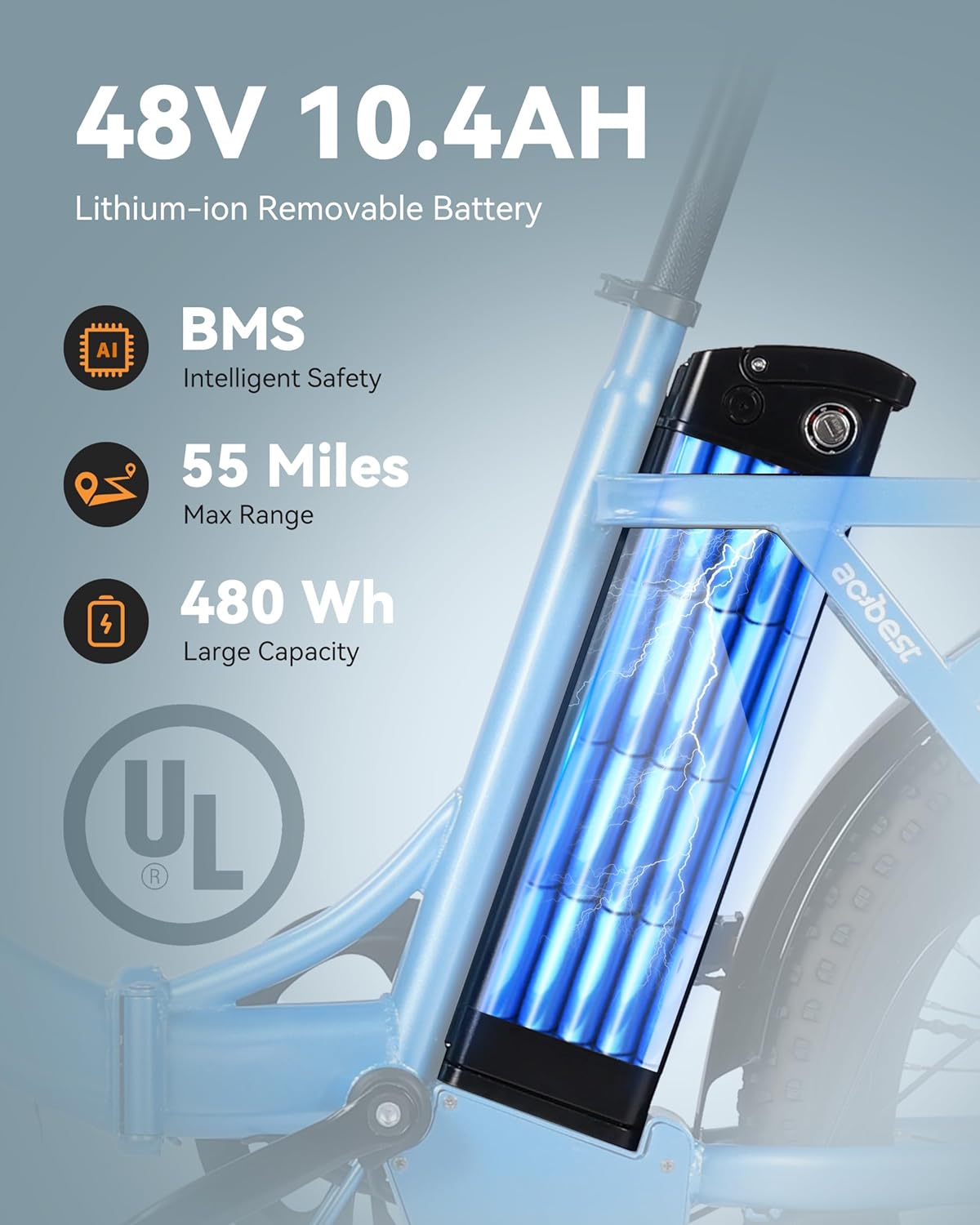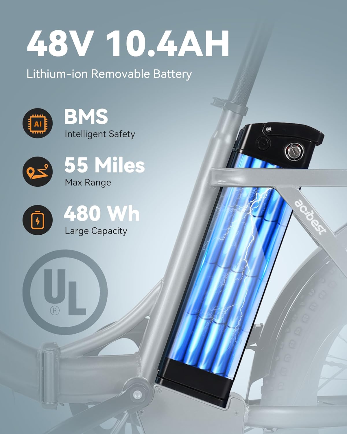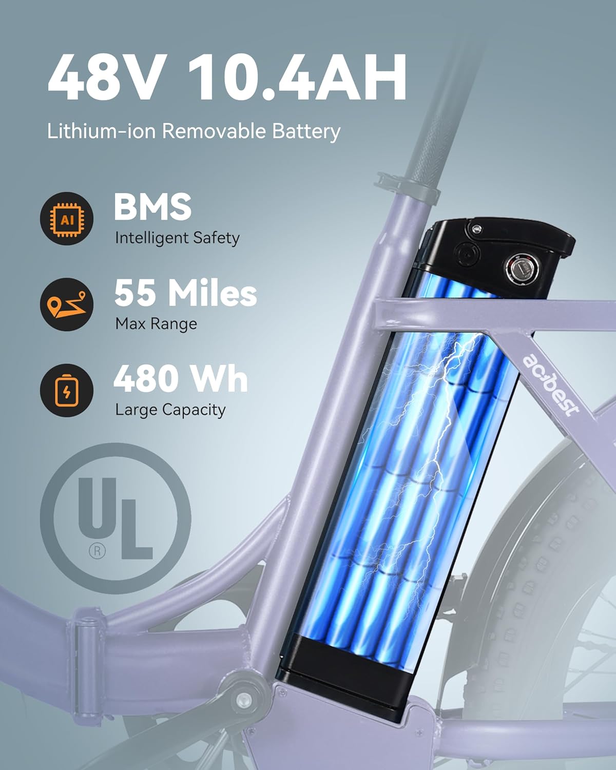 - _48V Removable Battery__he electric bike comes with a UL2849-certified 48V 499Wh removable battery to ensure daily riding experience and performance. After each charge, the range can reach up to 40 miles in pure electric mode and up to 55 miles in pedal assist mode, meeting your commuting or riding needs and providing unlimited riding time