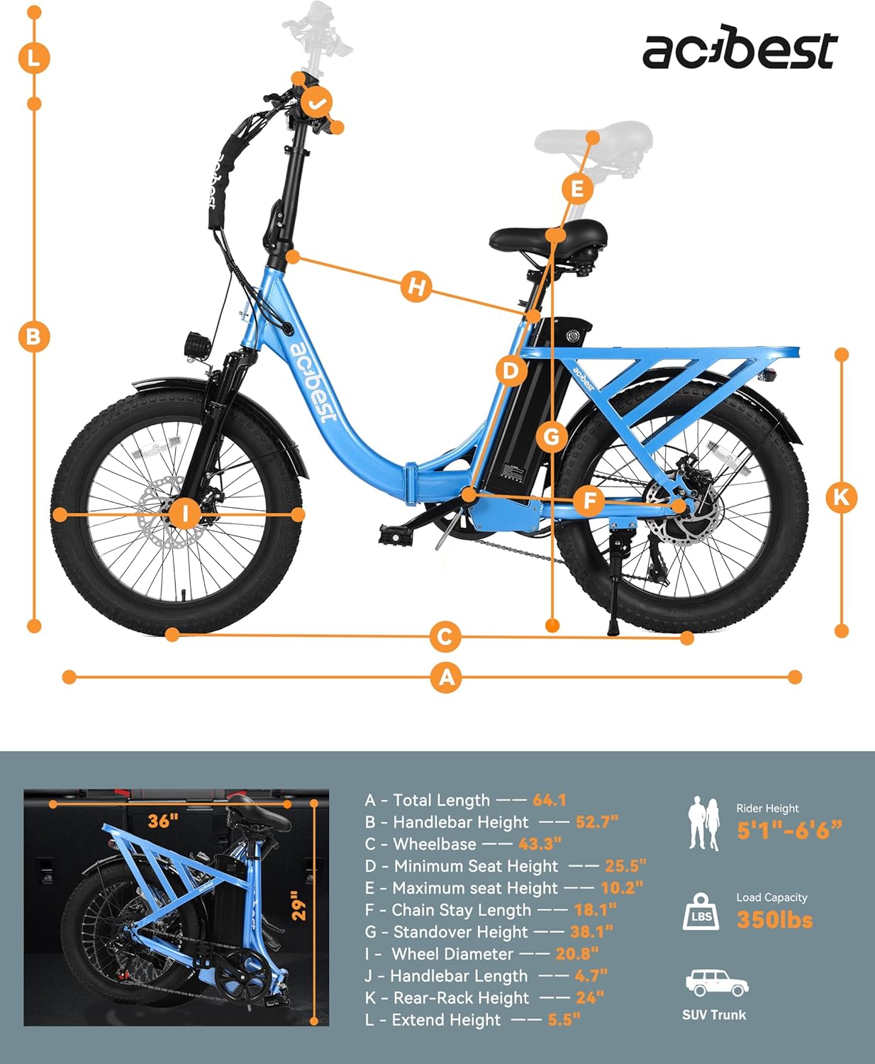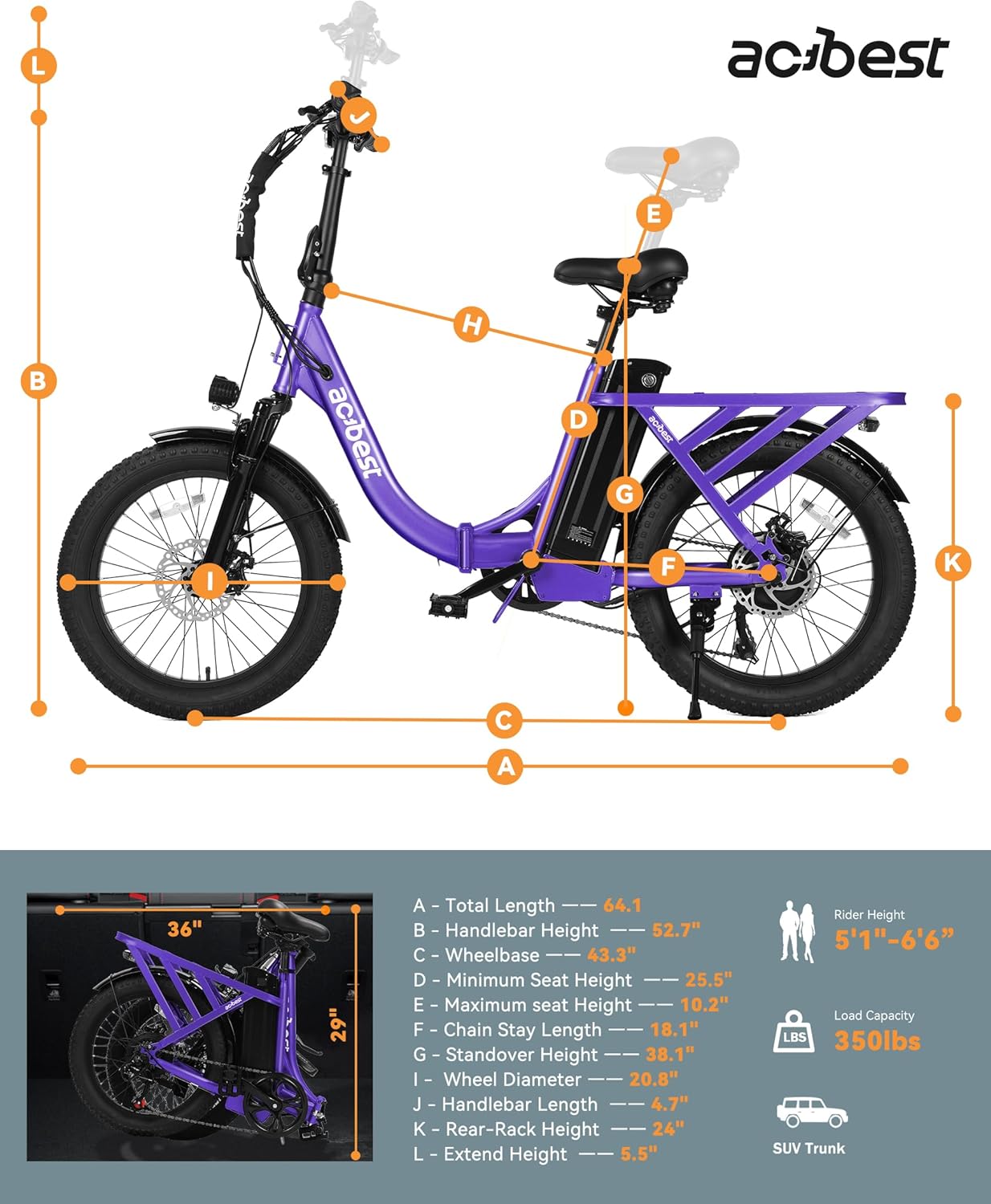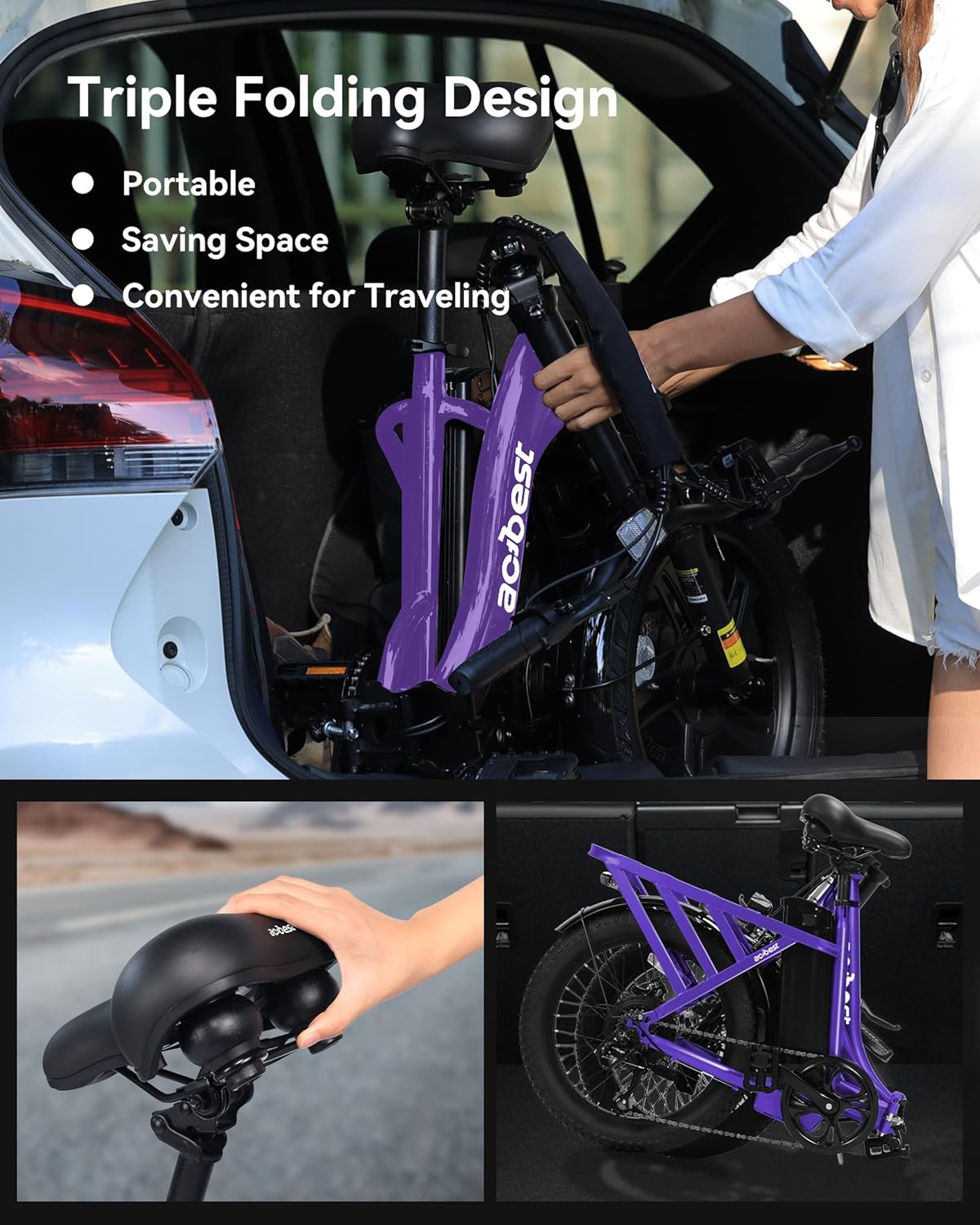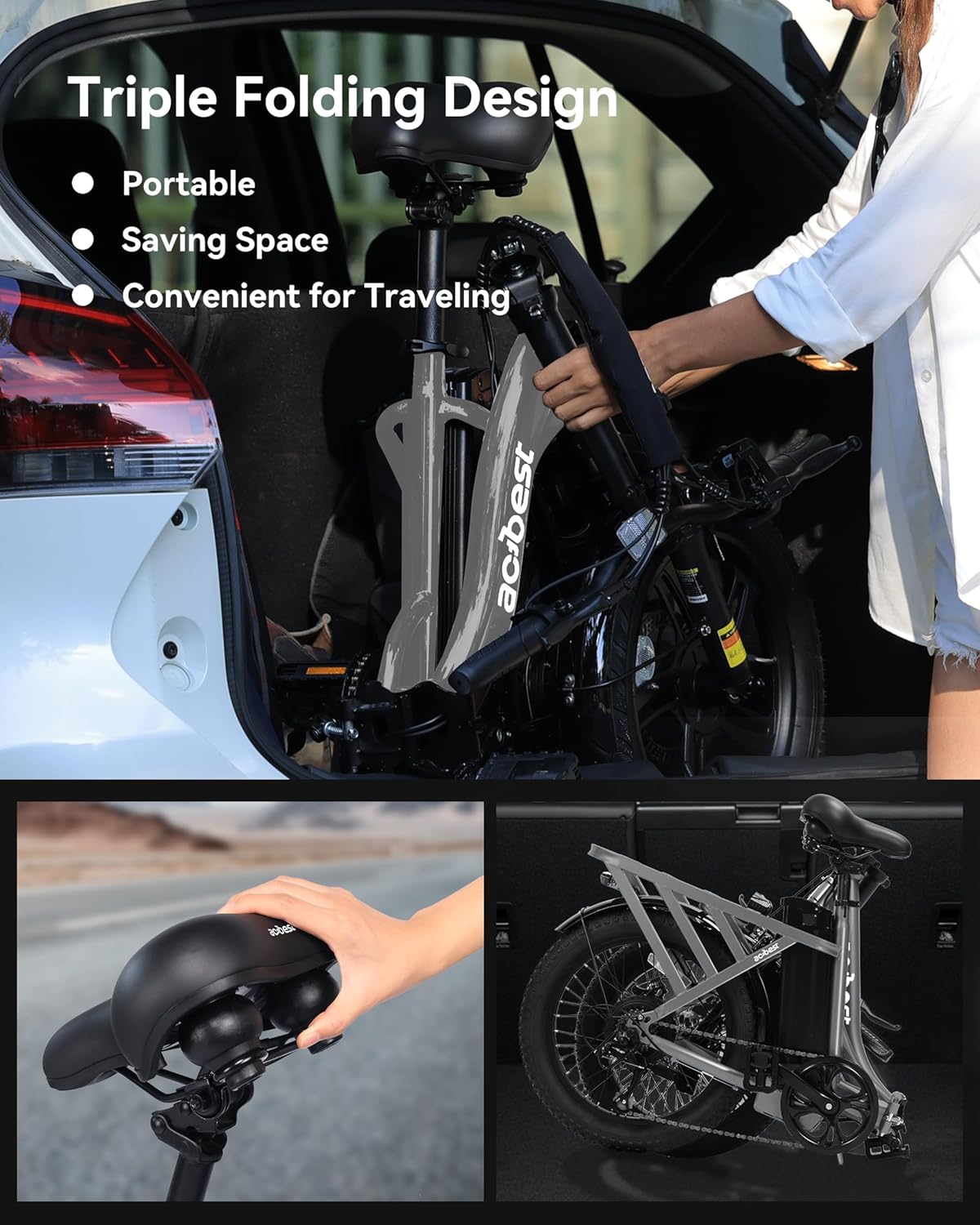 - __oldable and Portable Design__ctbest folding e-bike is compact and portable (folded size: 36X29 inches), brings you outdoor fun. It can be stored in an apartment, office or car trunk, and can also be easily transported on the subway, making it an ideal choice for commuting and camping