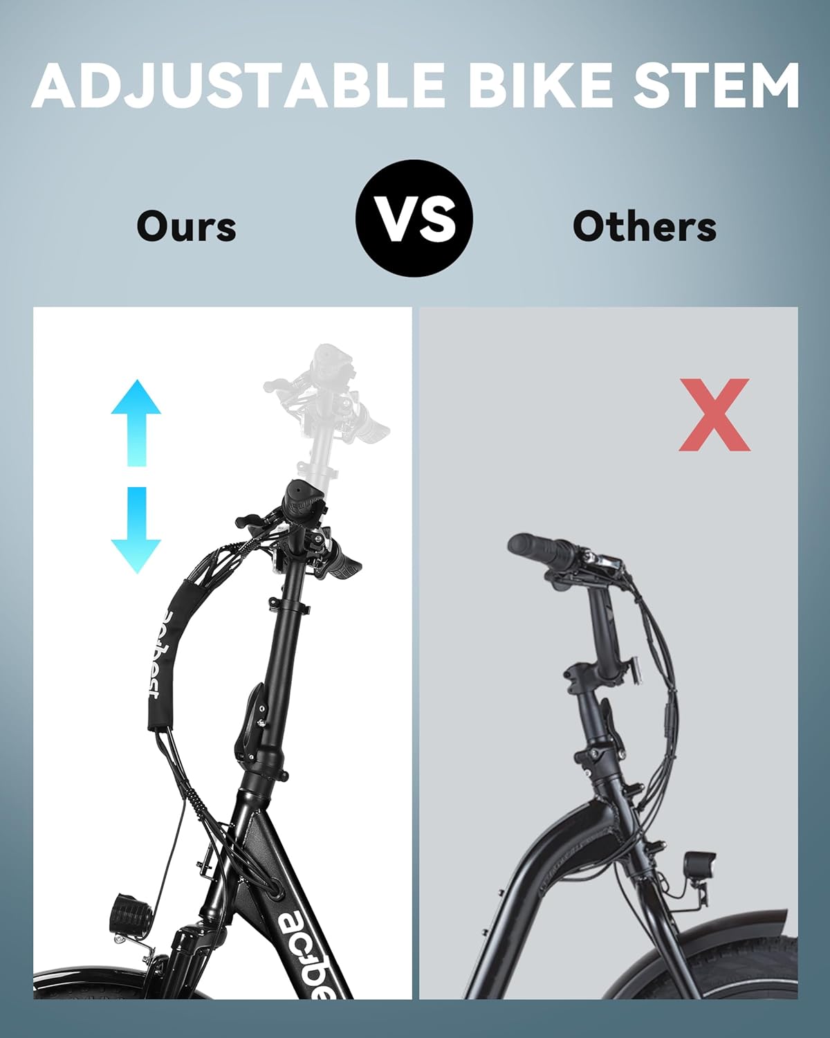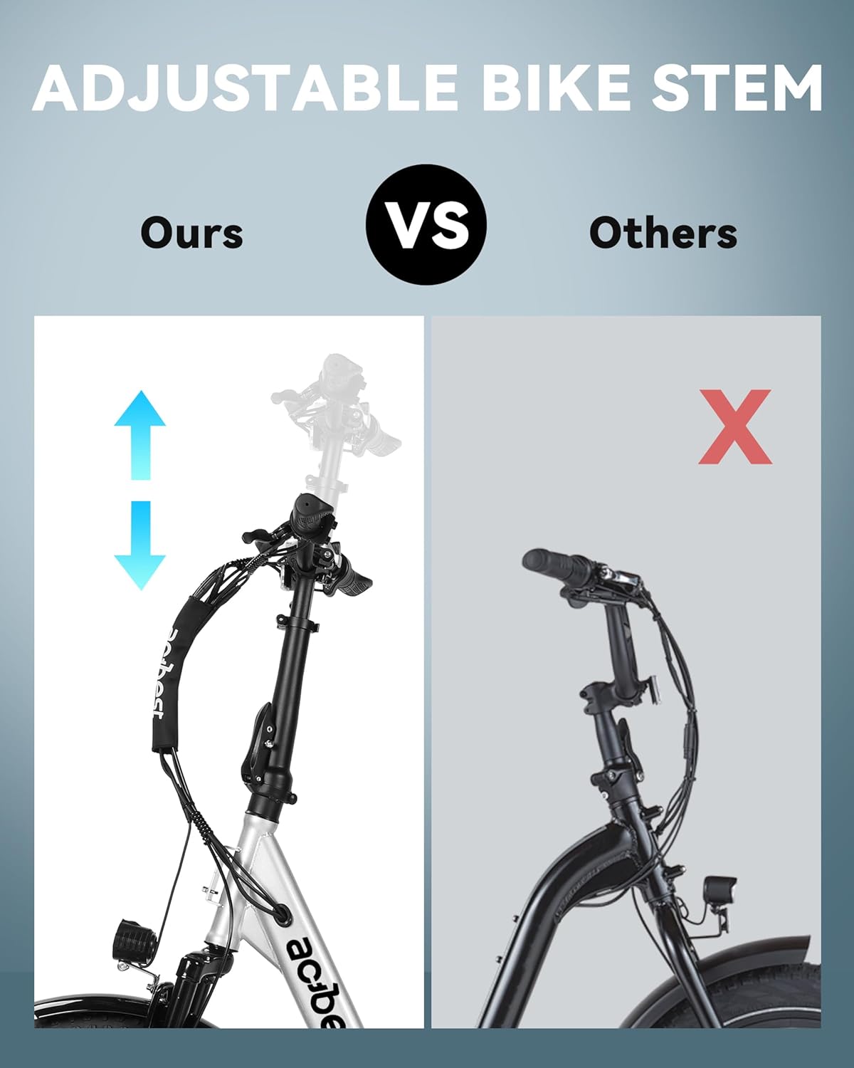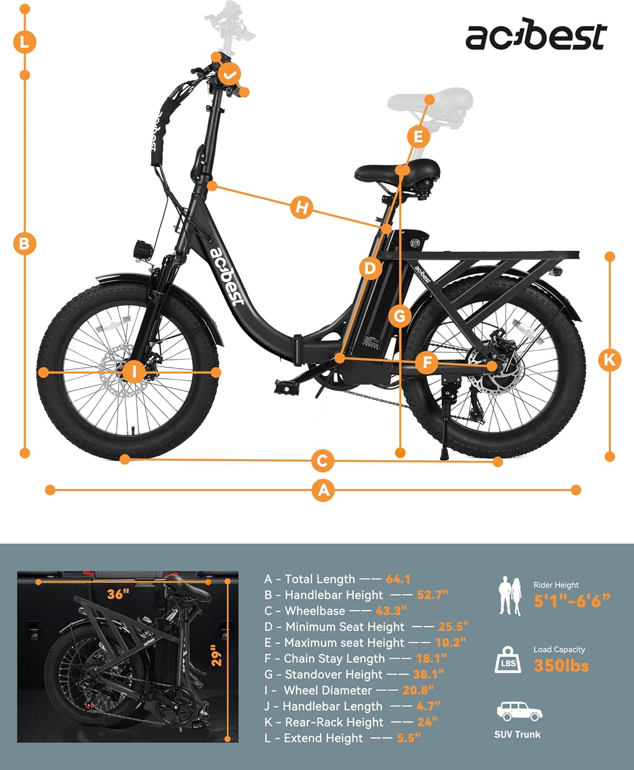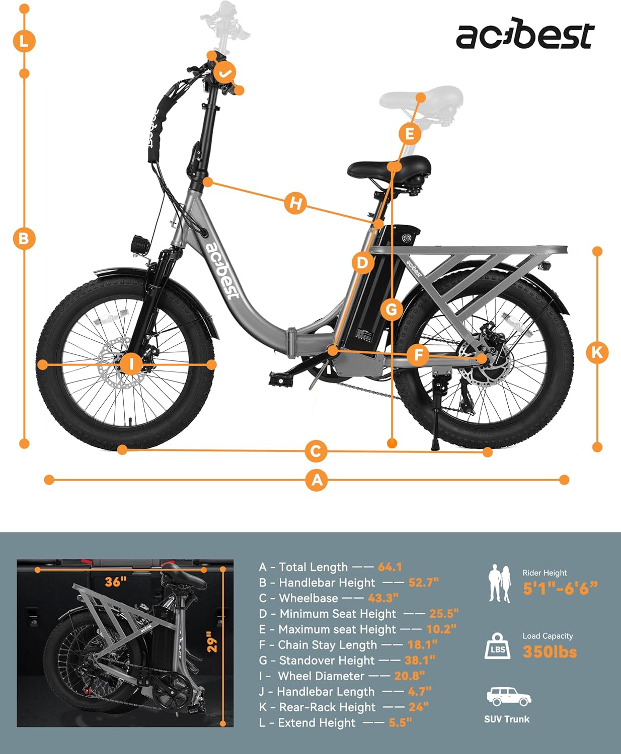 - __oldable and Portable Design__ctbest folding e-bike is compact and portable (folded size: 36X29 inches), brings you outdoor fun. It can be stored in an apartment, office or car trunk, and can also be easily transported on the subway, making it an ideal choice for commuting and camping